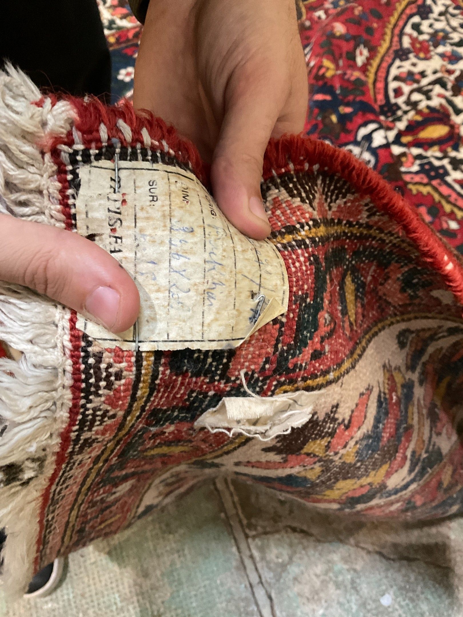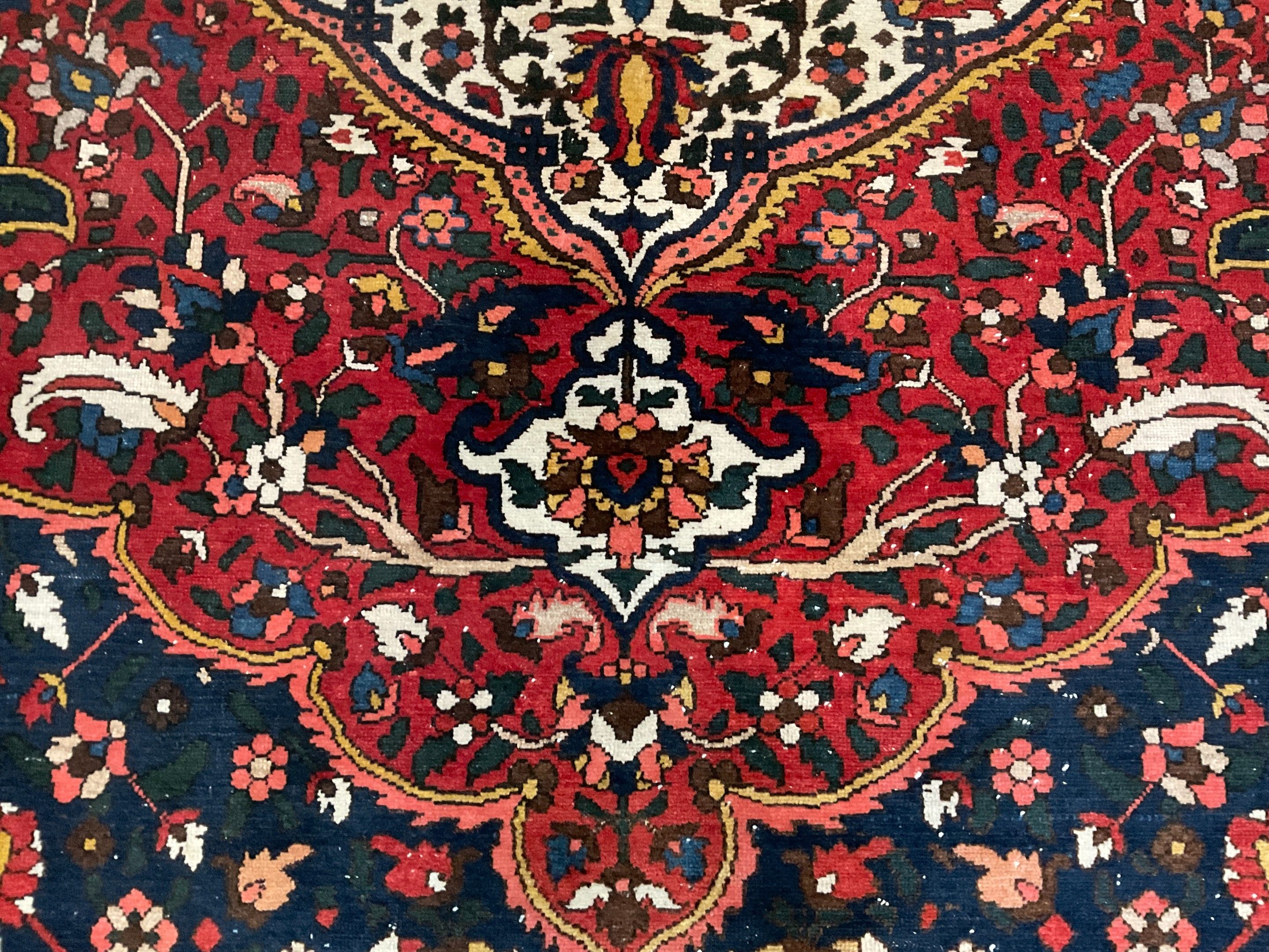 Iran Large Bakhtiar carpet in wool with a red background, blue spandrels, with a large main medallion on a light background, with radiant decoration; H: 2900 cm - W: 210 cm (Minor wear and damage).