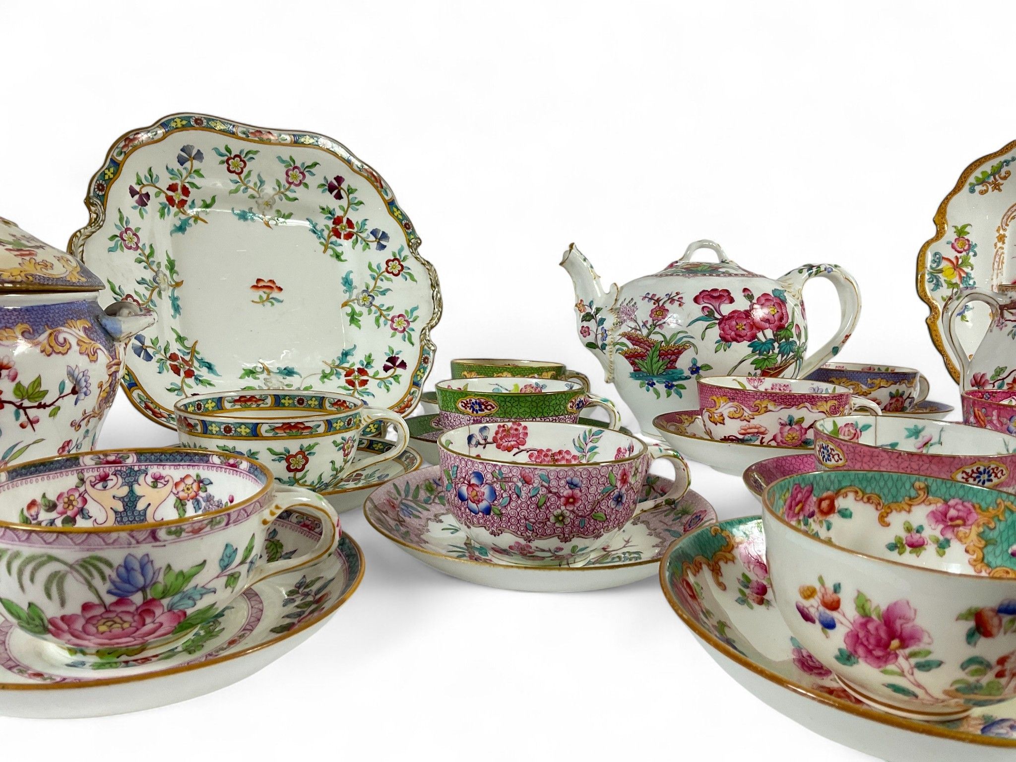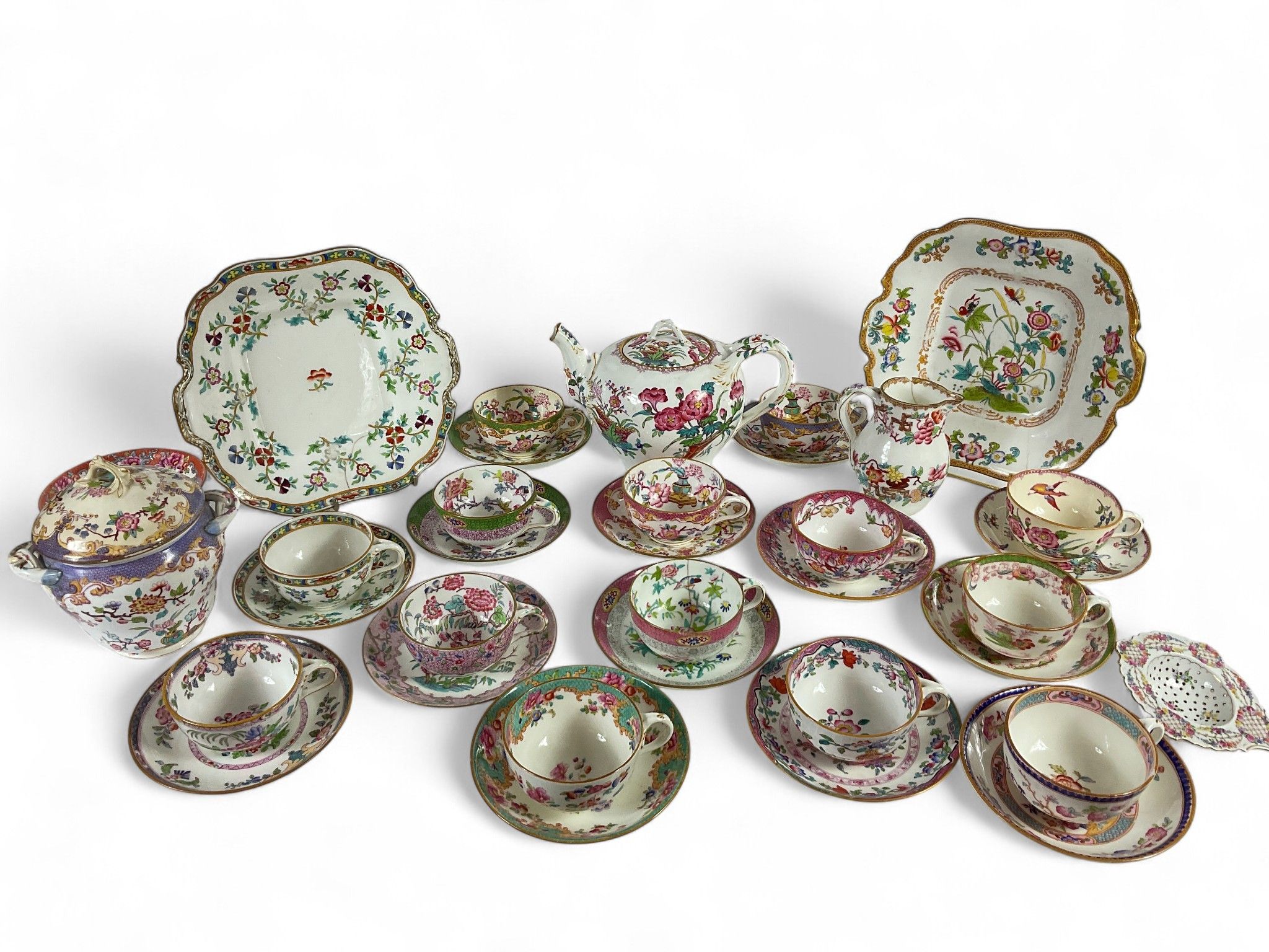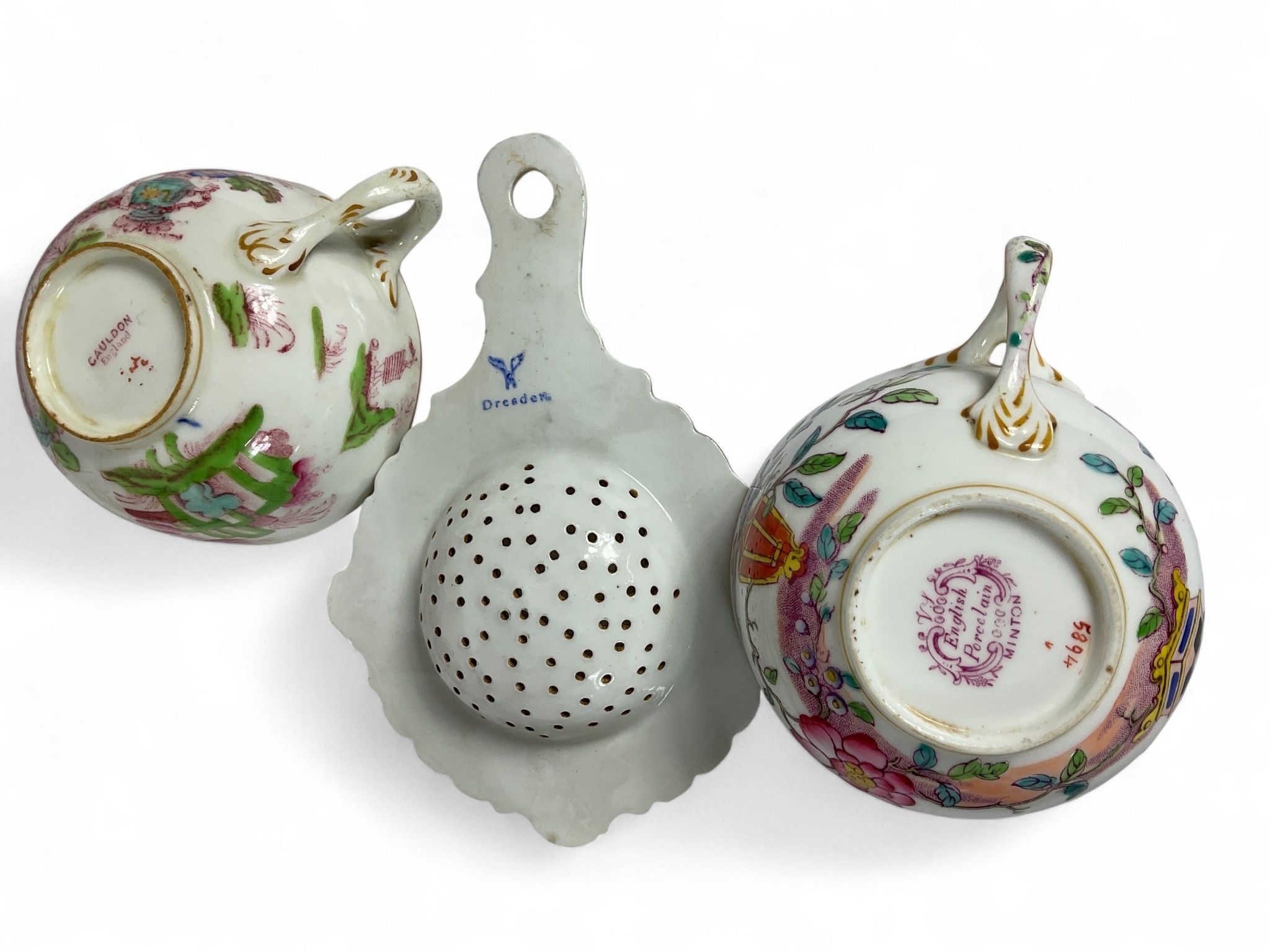 Art of the table, late 19th/early 20th century MINTON and CAULDON ENGLAND Tea service set, comprising : Two cake dishes (Small Acc.), One teapot, One milk jug, One sugar bowl (Acc.), Fourteen cups, Fifteen saucers, Total approx. 34 pieces. A Dresden porcelain tea strainer is included (some chips and cracks).