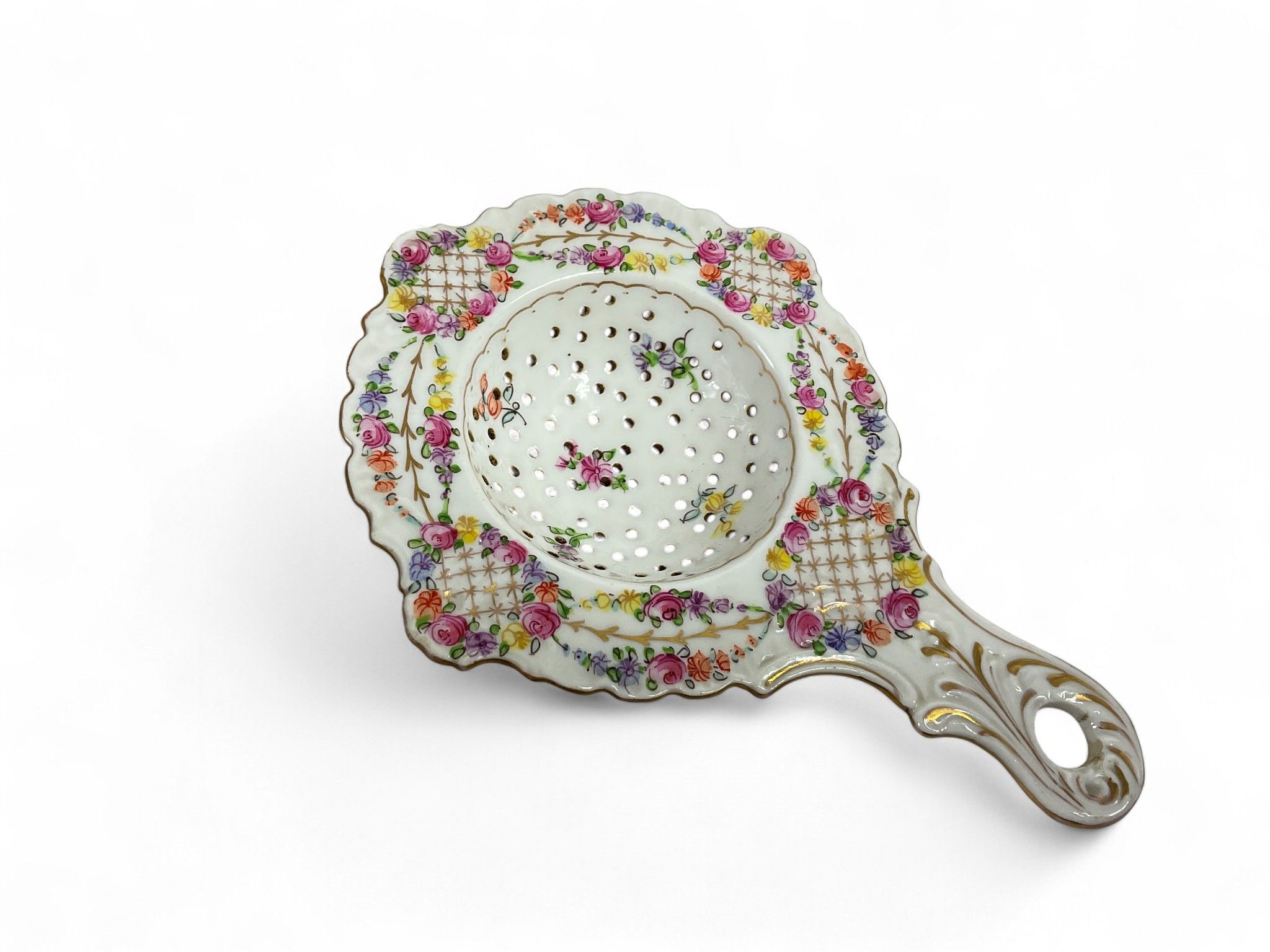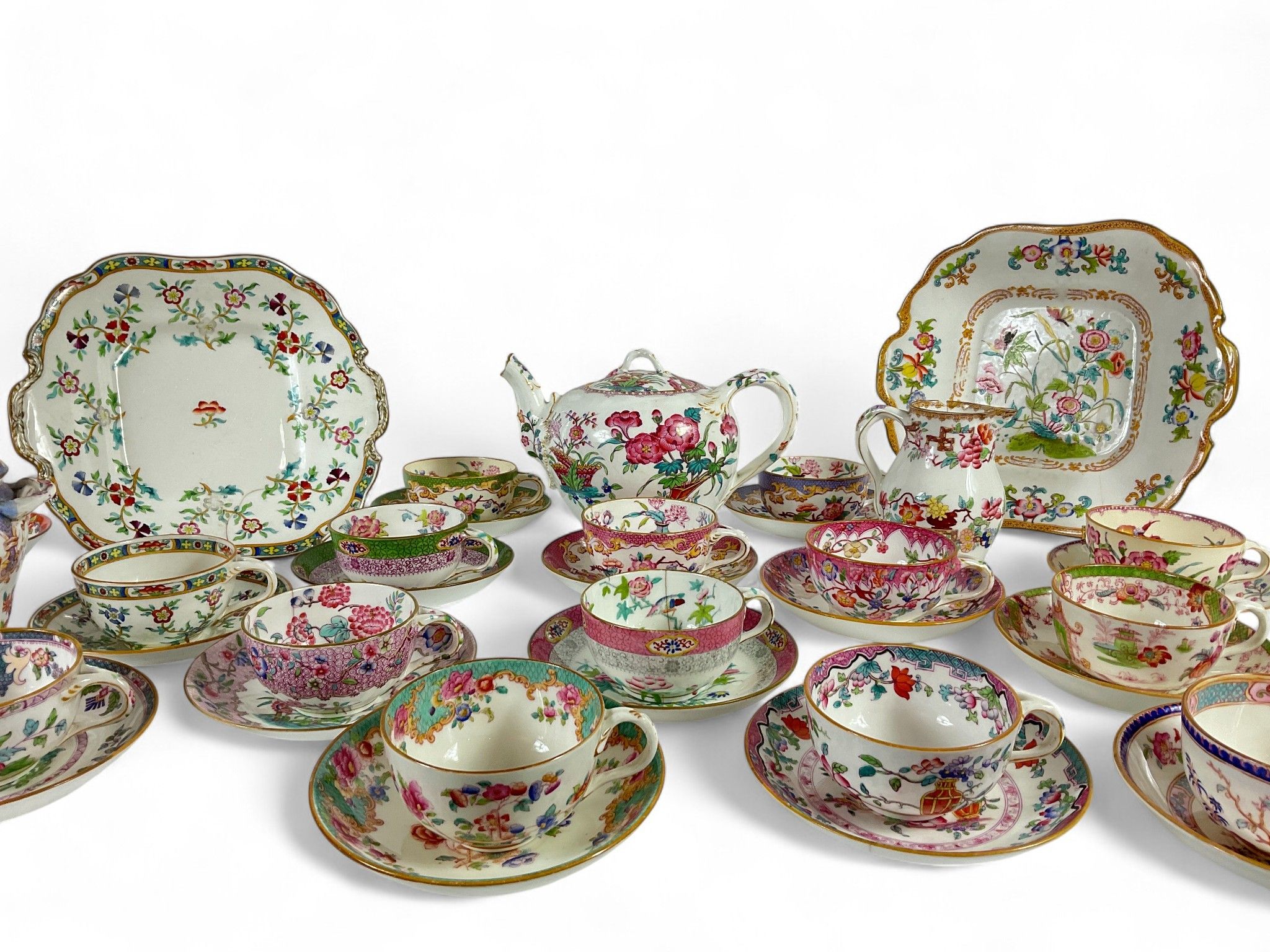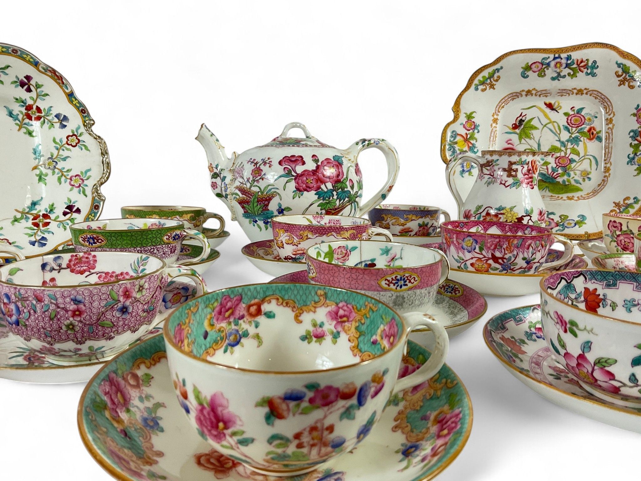 Art of the table, late 19th/early 20th century MINTON and CAULDON ENGLAND Tea service set, comprising : Two cake dishes (Small Acc.), One teapot, One milk jug, One sugar bowl (Acc.), Fourteen cups, Fifteen saucers, Total approx. 34 pieces. A Dresden porcelain tea strainer is included (some chips and cracks).