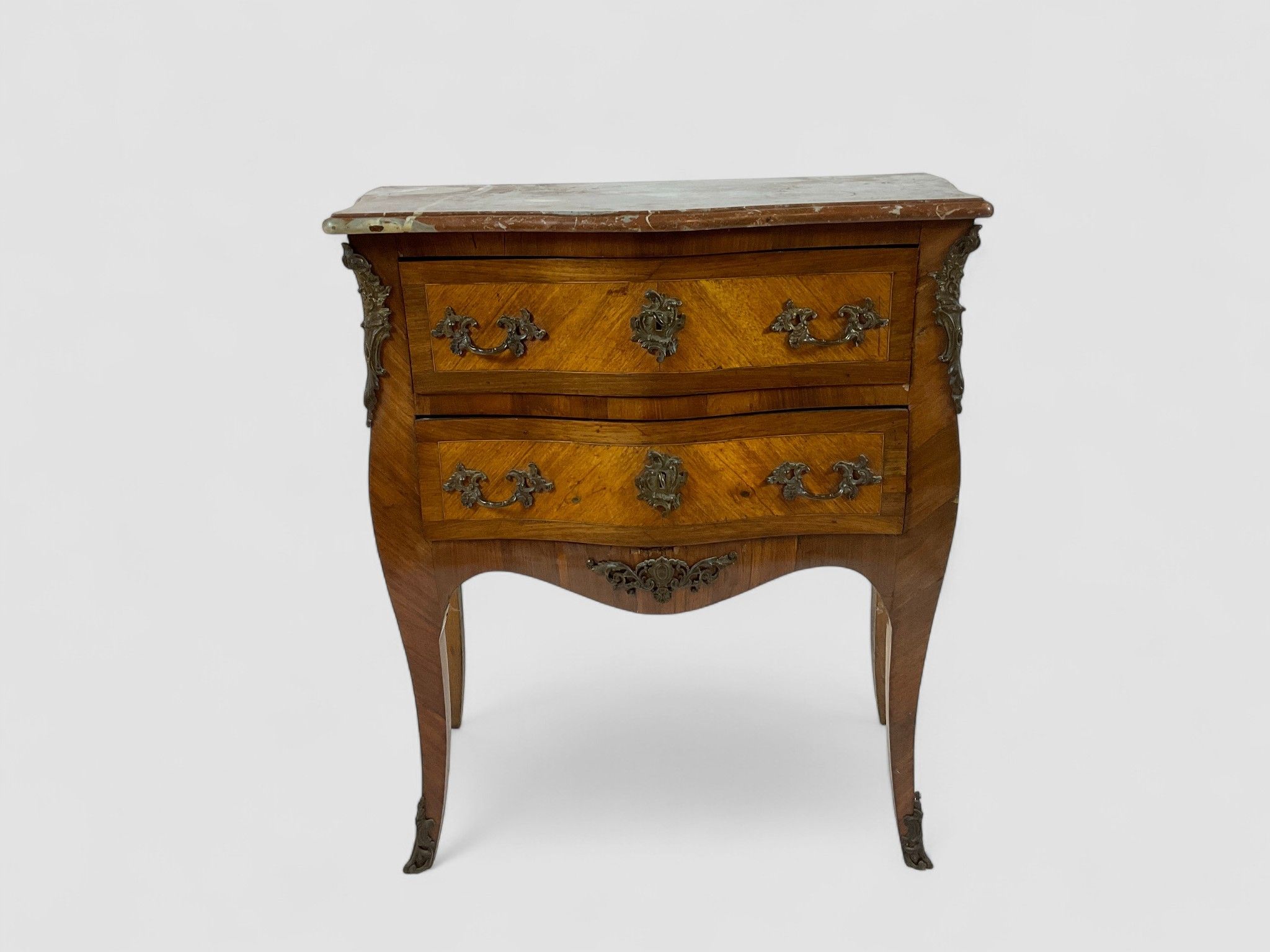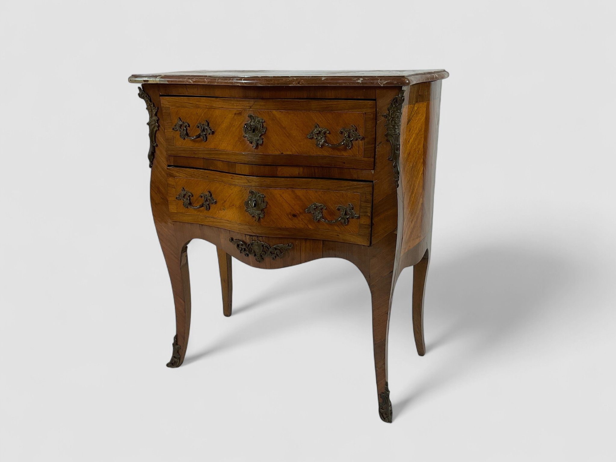 Louis XV style "entredeux" chest of drawers In slightly curved veneered wood, with fillet marquetry decoration, opening with two drawers, standing on slightly arched legs, gilt bronze ornaments, Regional work in the Louis XV style, 19th century Flanders red marble top H: 82 cm - W: 70 cm - D: 38 cm (Wear)