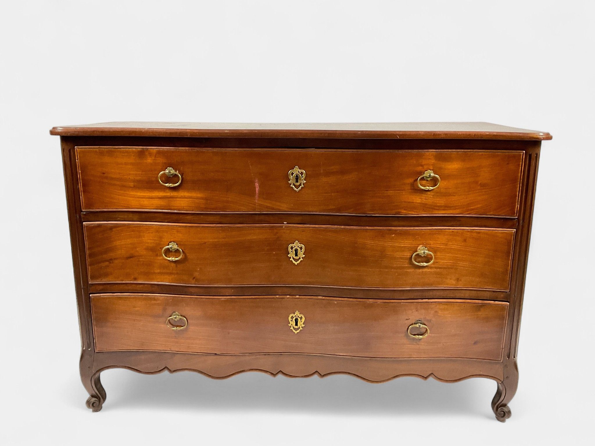 An attractive slightly curved mahogany Port commode, opening with three drawers, standing on small arched legs, brass handles and escutcheons,