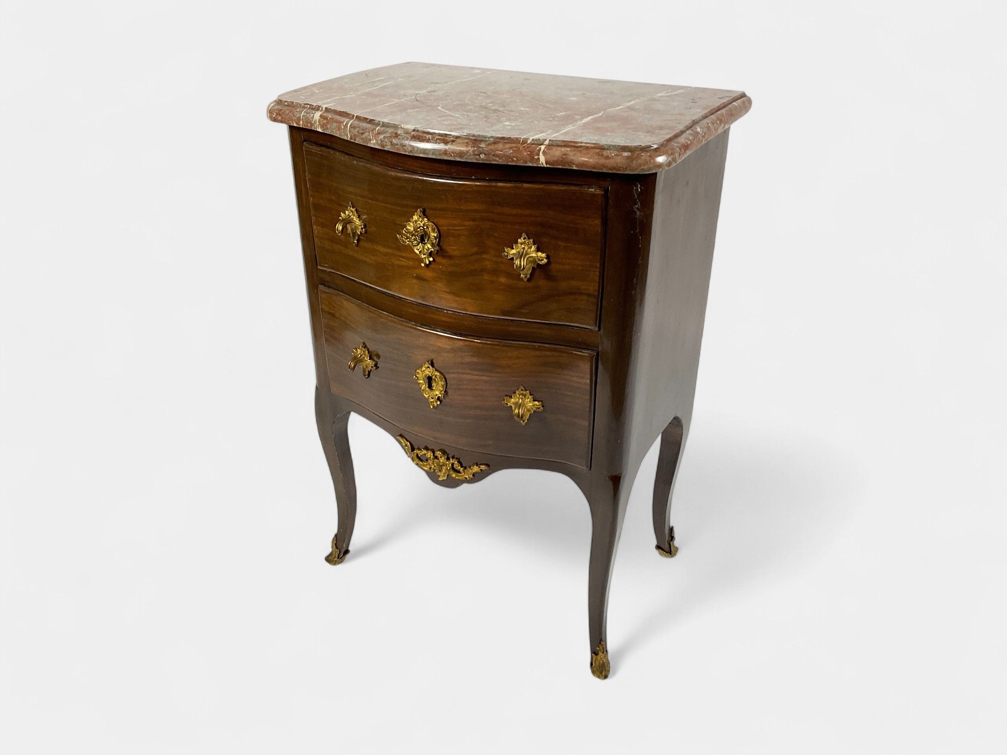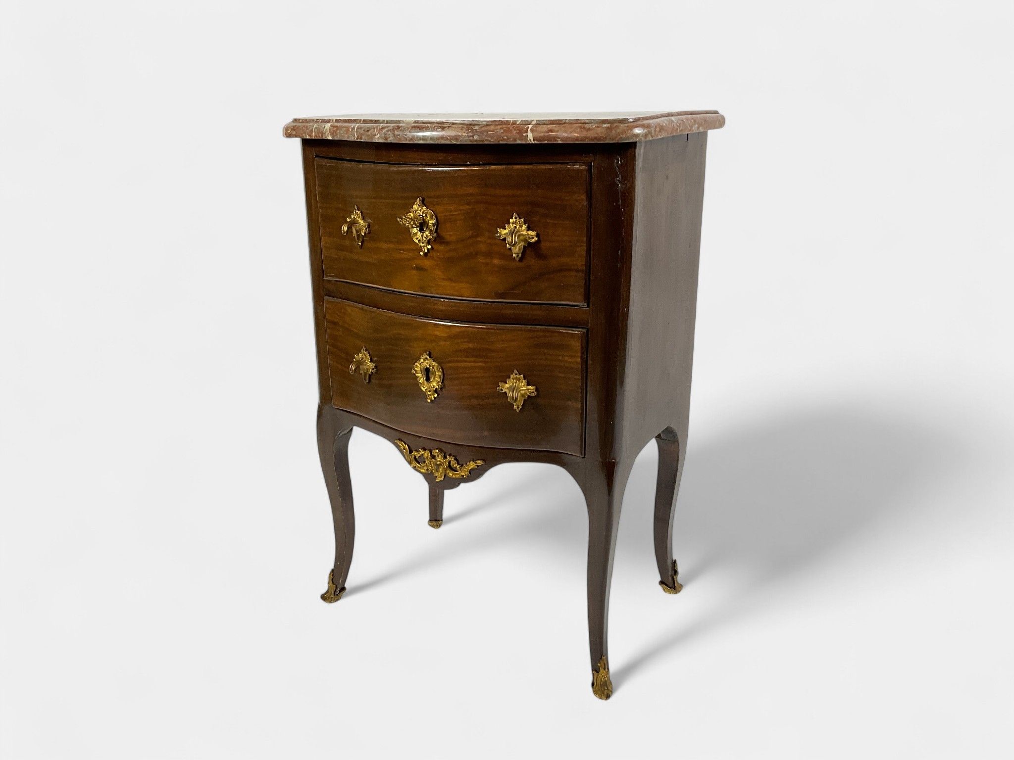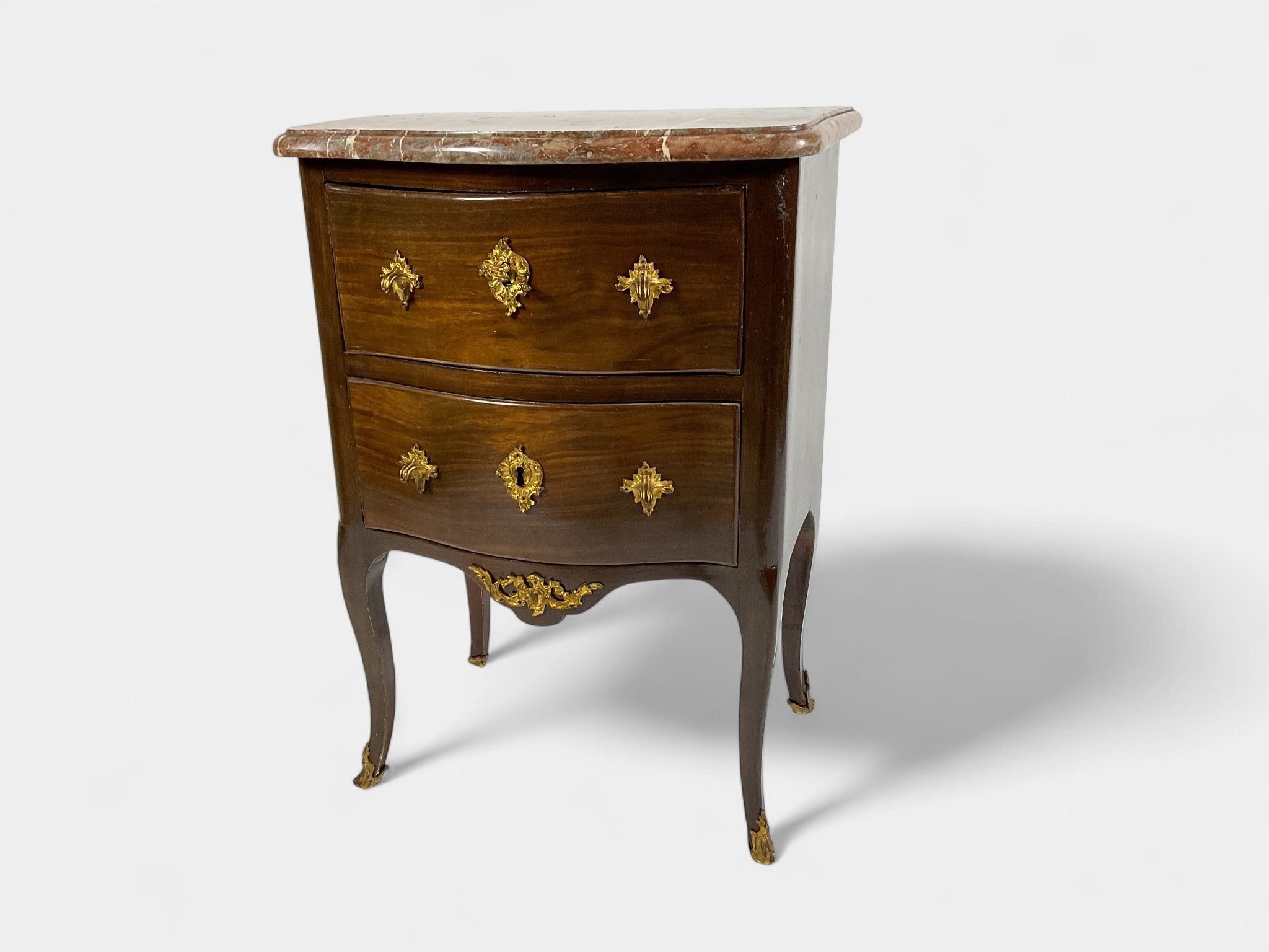 In flamed mahogany veneer, slightly curved, opening with two drawers, standing on cambered legs, beautifully decorated in gilt bronze.