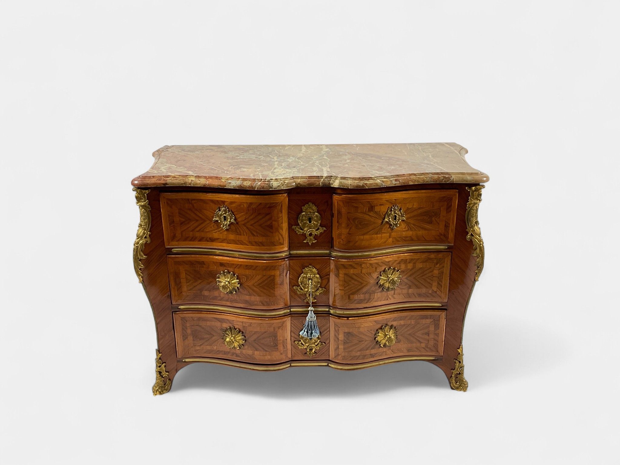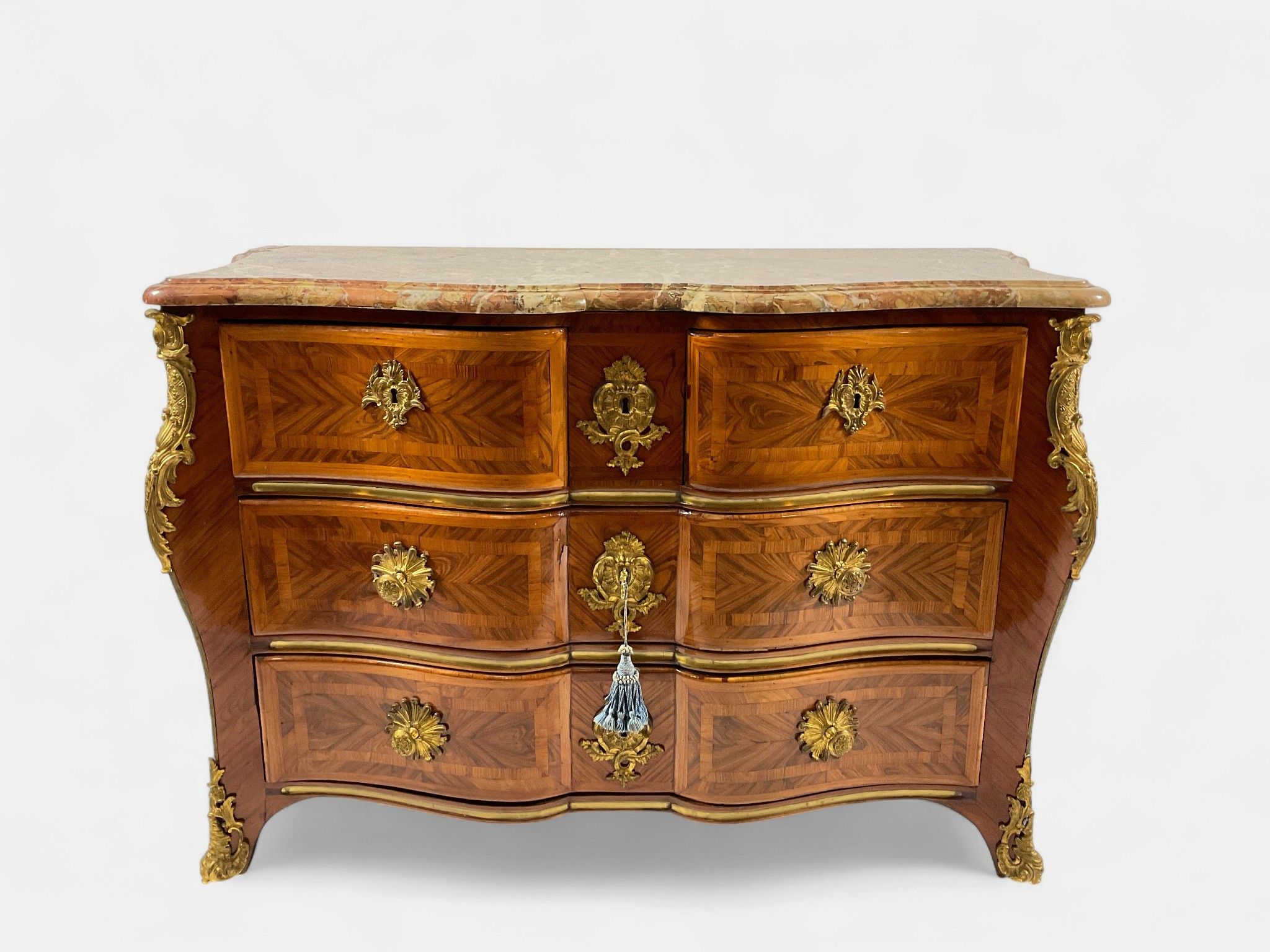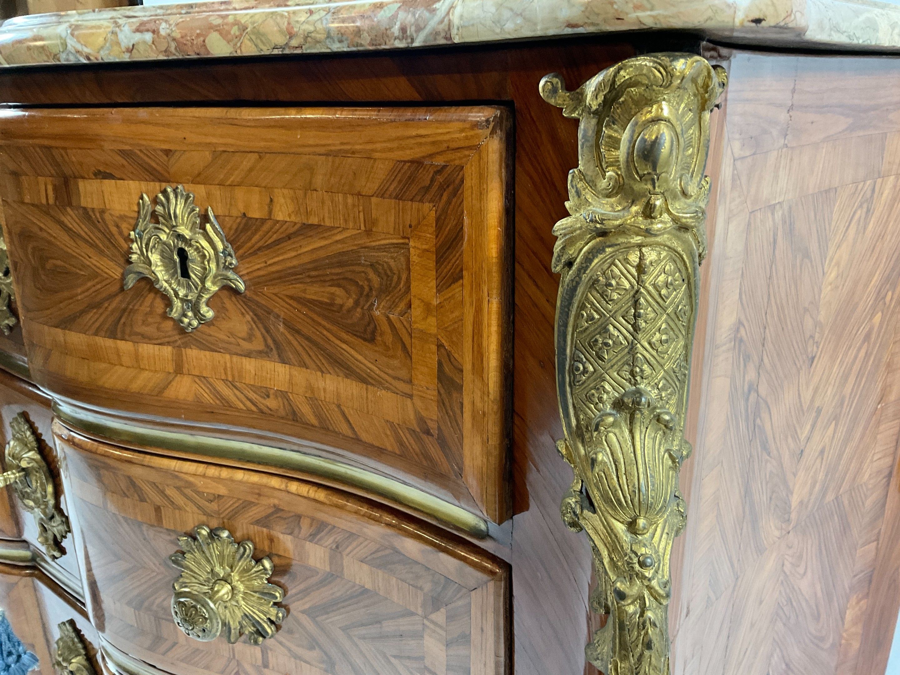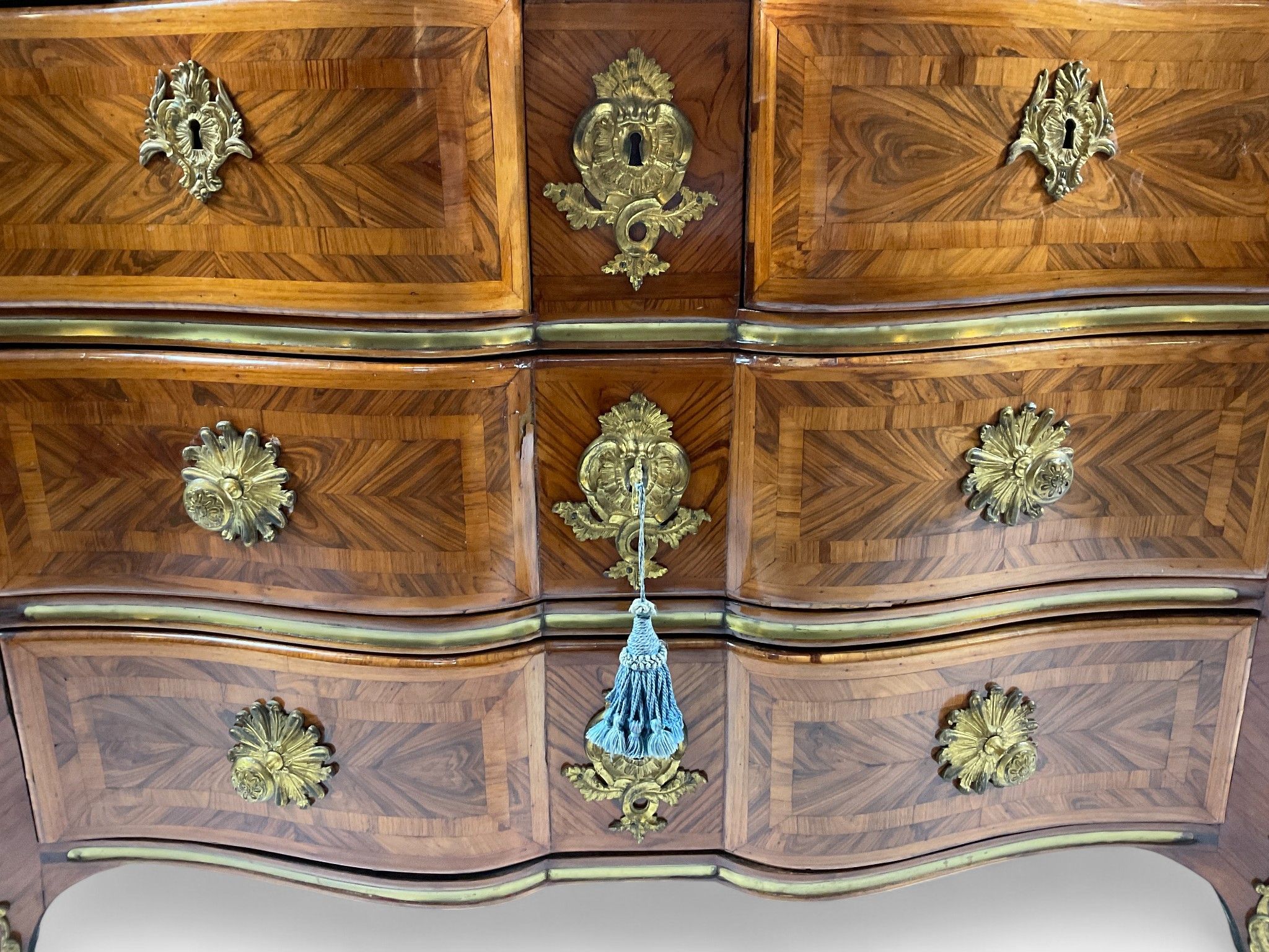 In "butterfly wings" veneer, slightly curved in shape, opening with four drawers in three rows, the small central drawer with a secret.