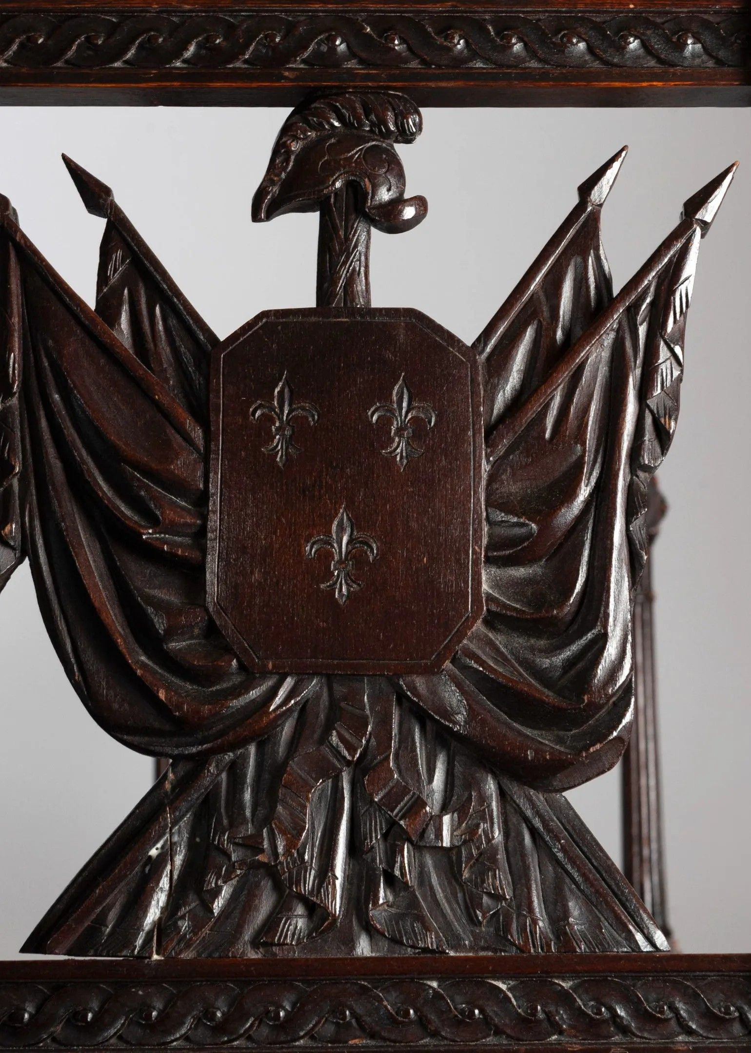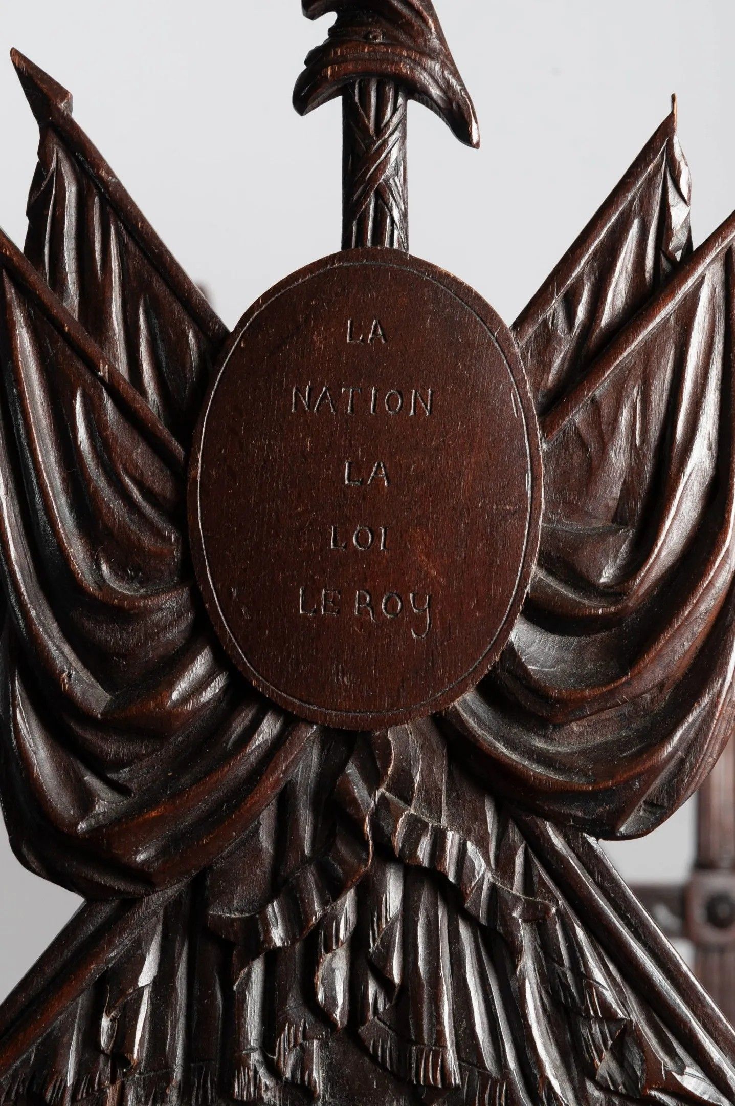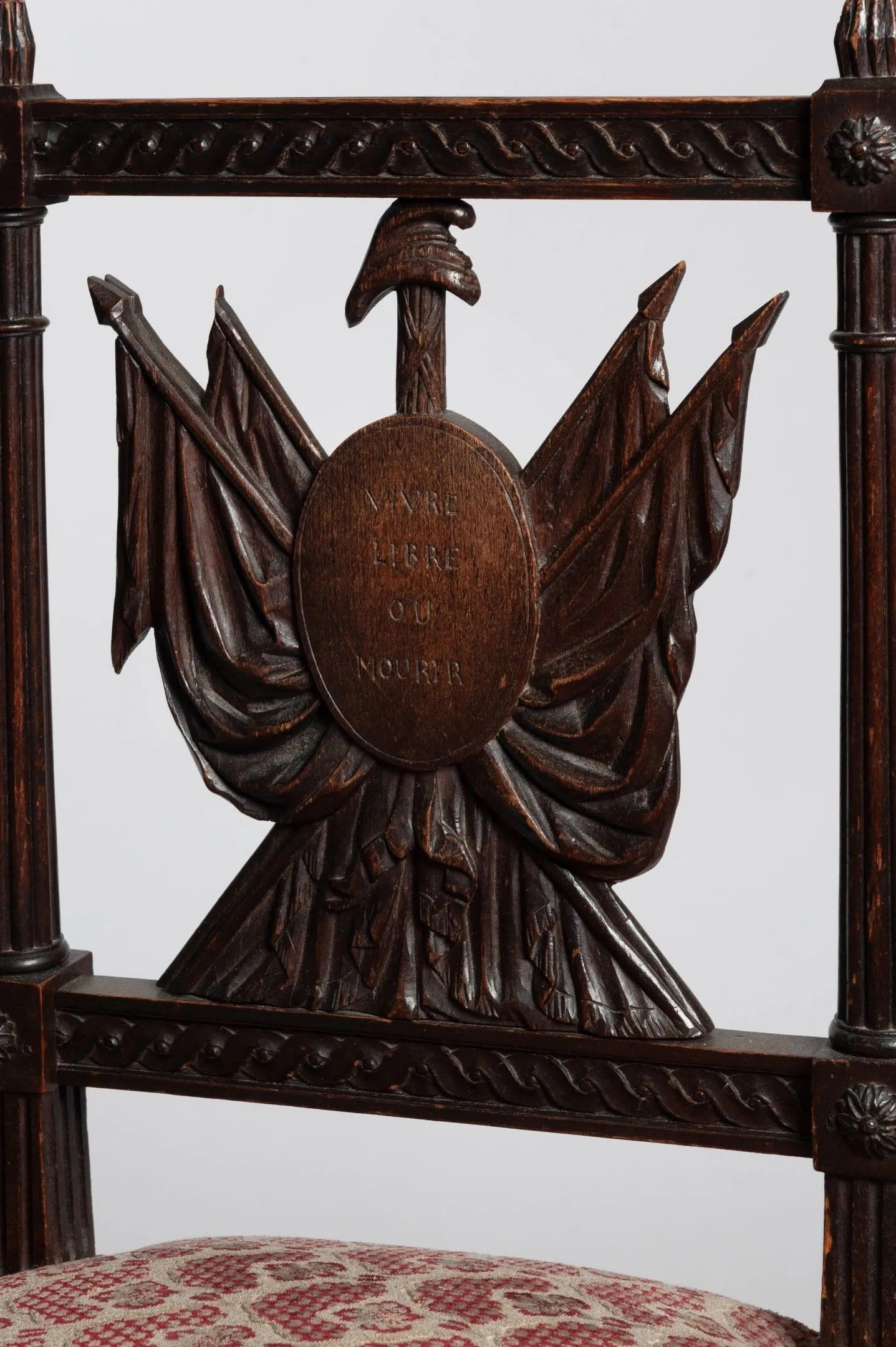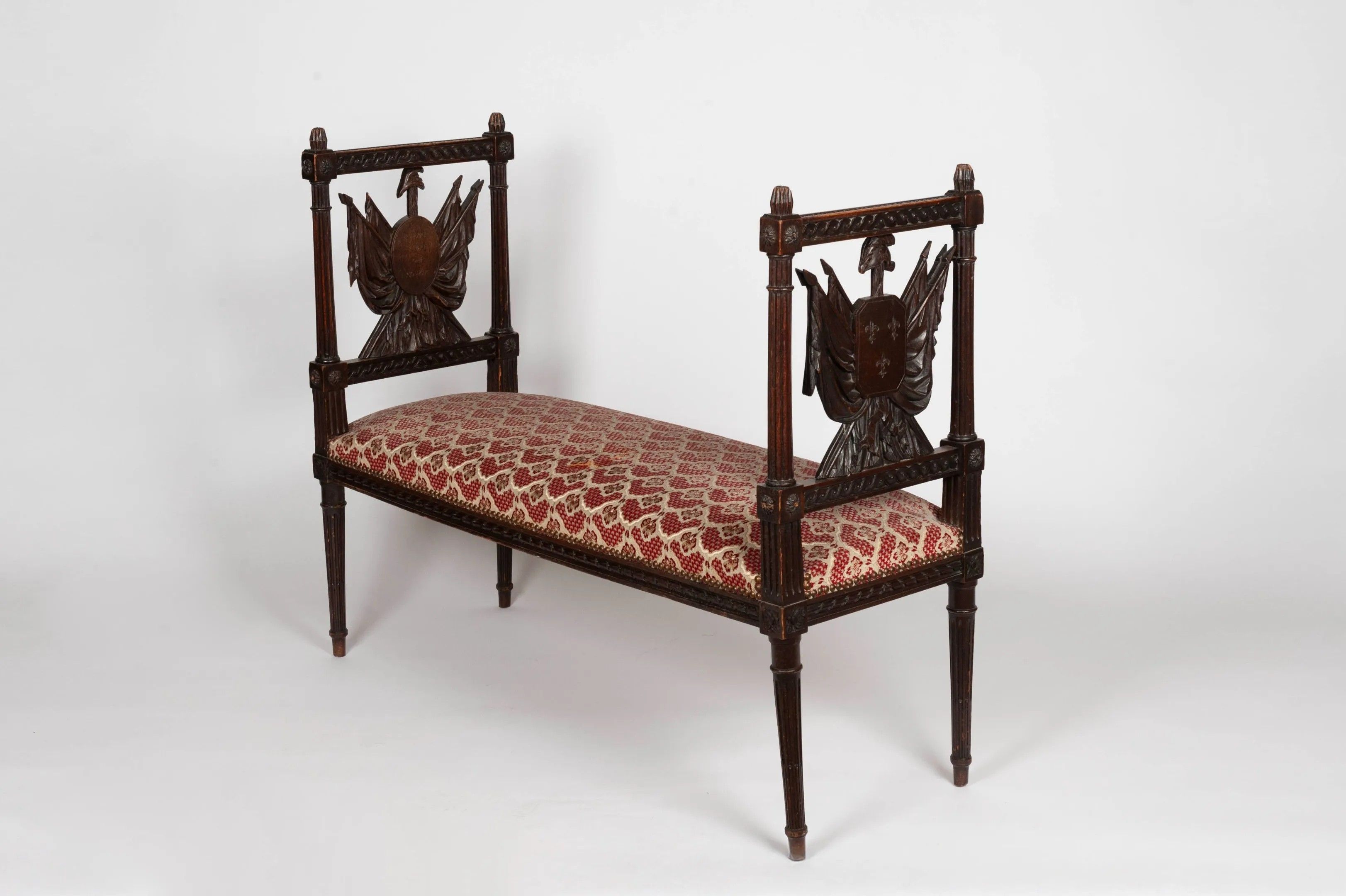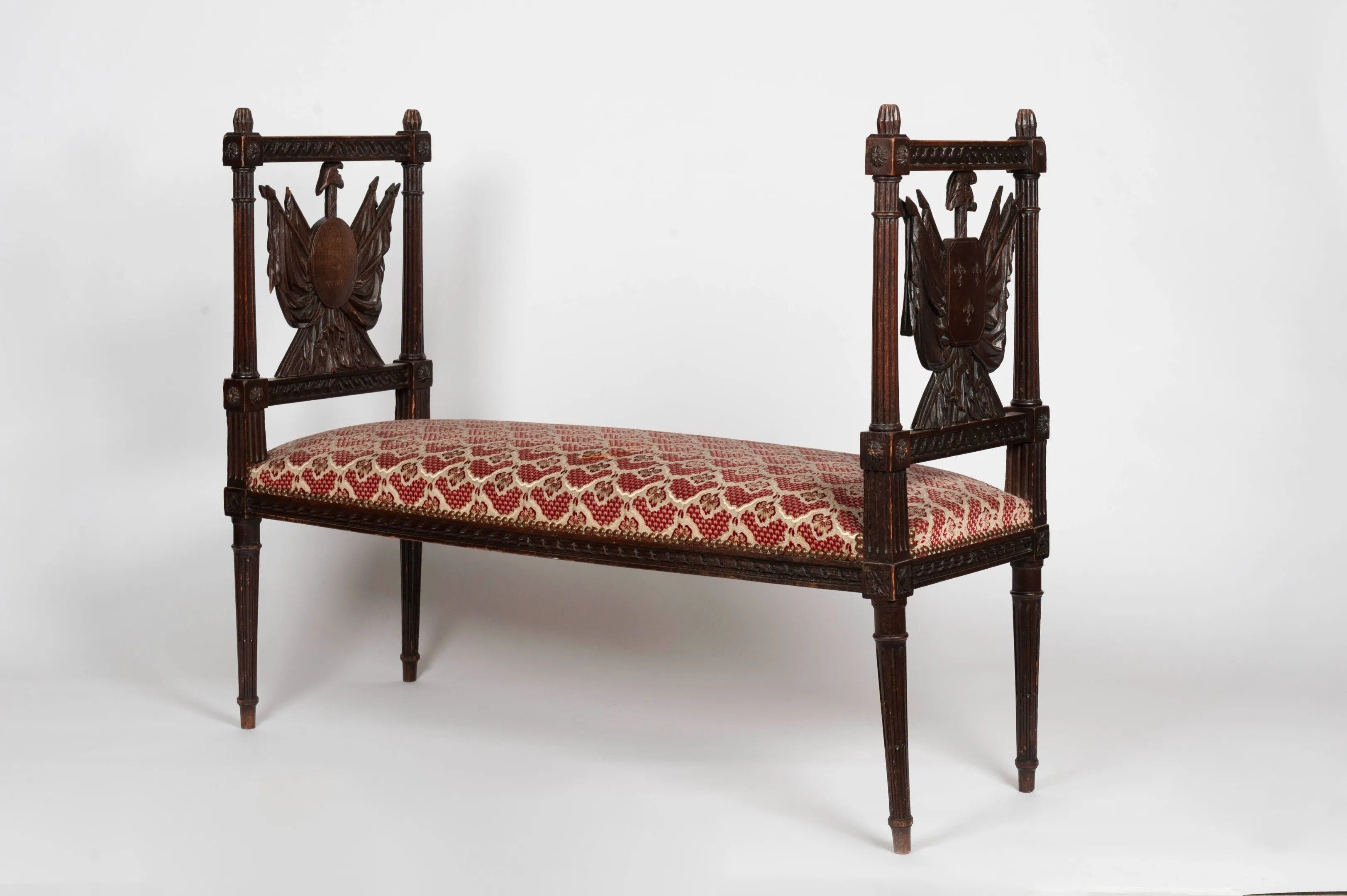 3/ Revolutionary period bench Bench in natural wood, the tapered fluted uprights, the sides carved with flags, spears and medallions engraved with the revolutionary mottos "La Nation, la Loi, le Roy" and "Vivre libre ou mourir". Revolutionary period - late 18th - early 19th century. Red and cream stitch trim. H: 85 W: 107 D: 42 cm (Restorations from use. A few missing pieces.)