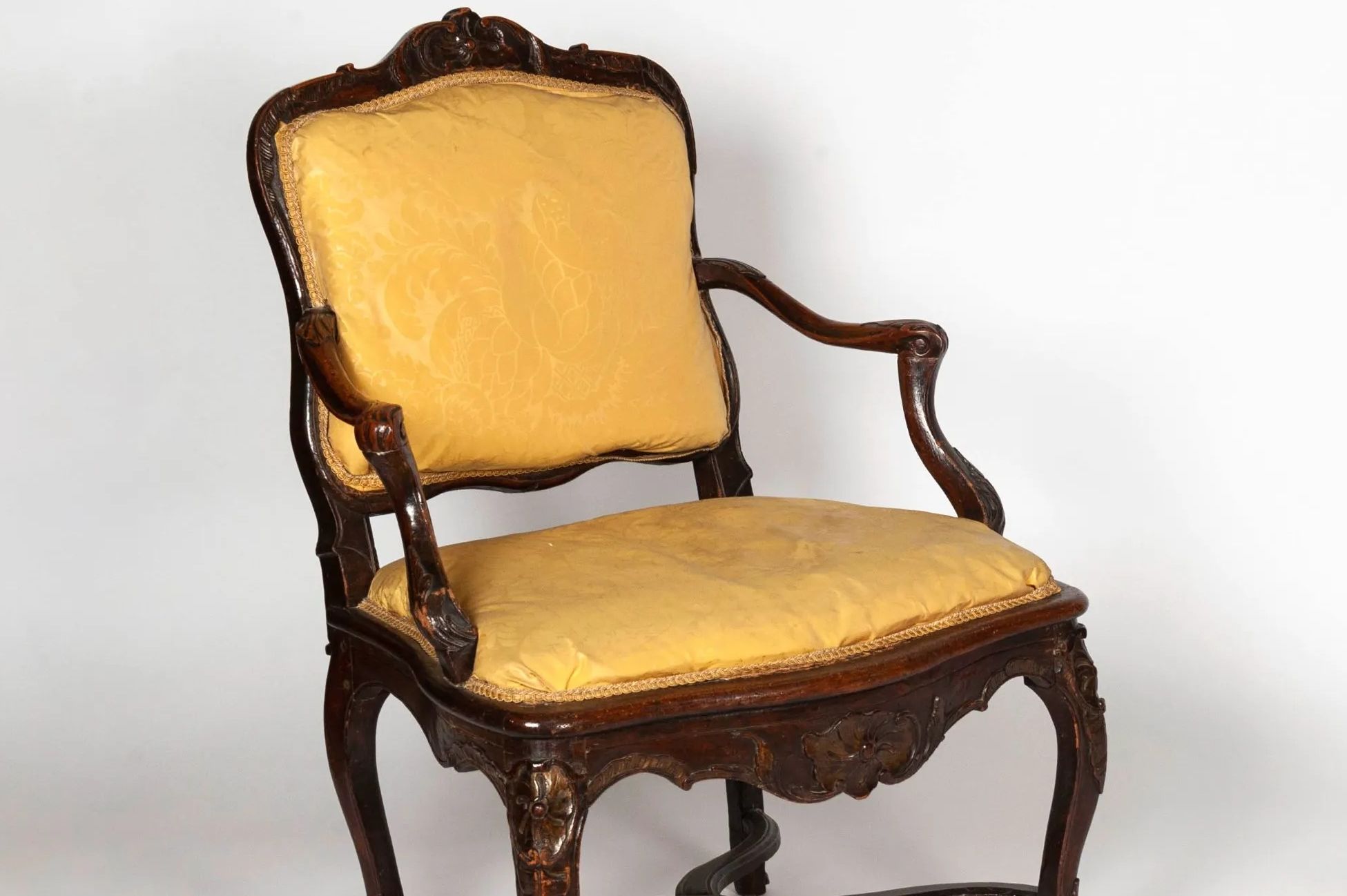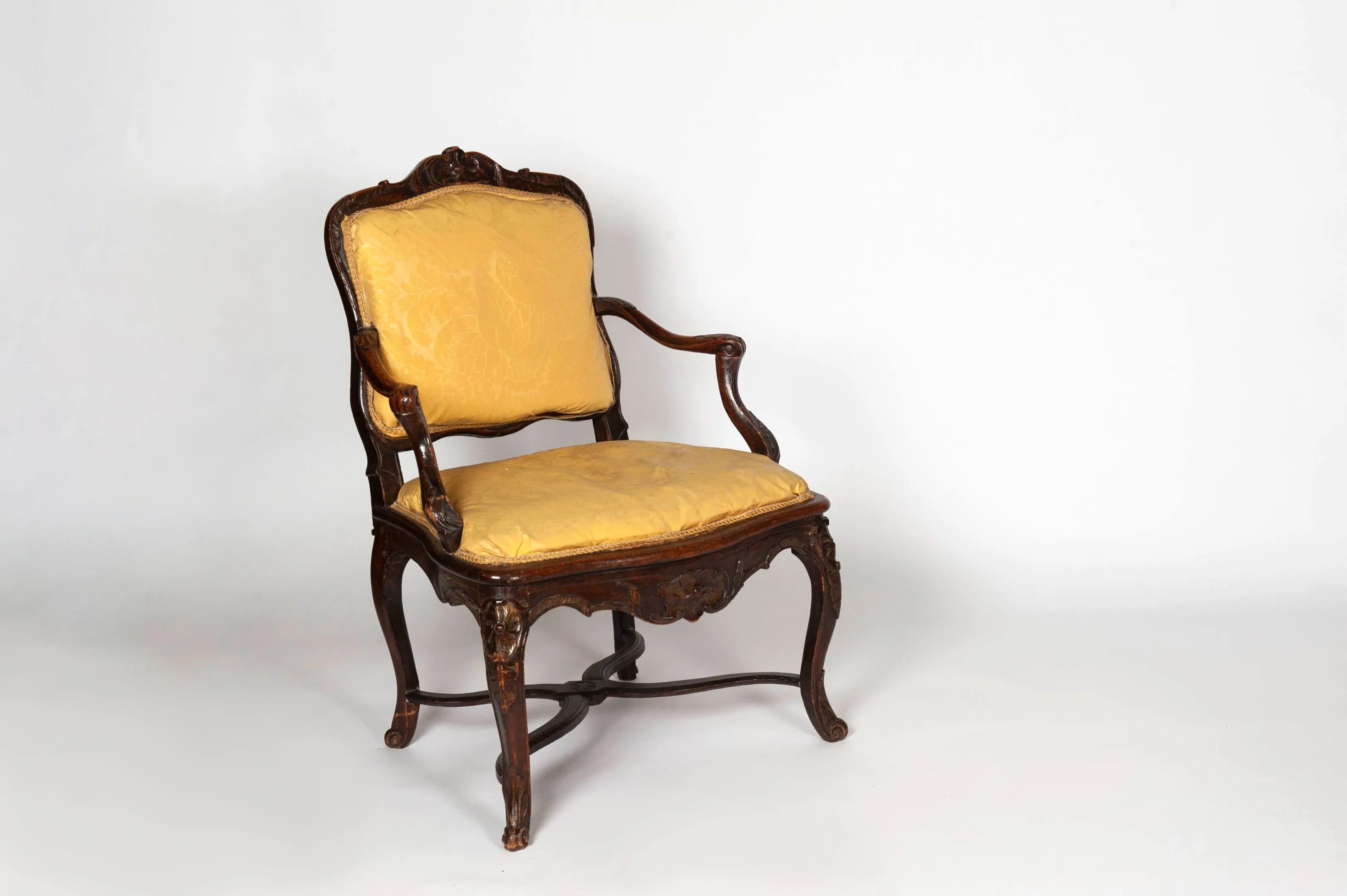 Regency period armchair In moulded and carved natural wood, X-shaped braces, S-shaped armrests Regency period, 18th century. Upholstered in yellow fabric. H: 90 cm - W: 64 cm - D: 54 cm (Restorations, small dents.)