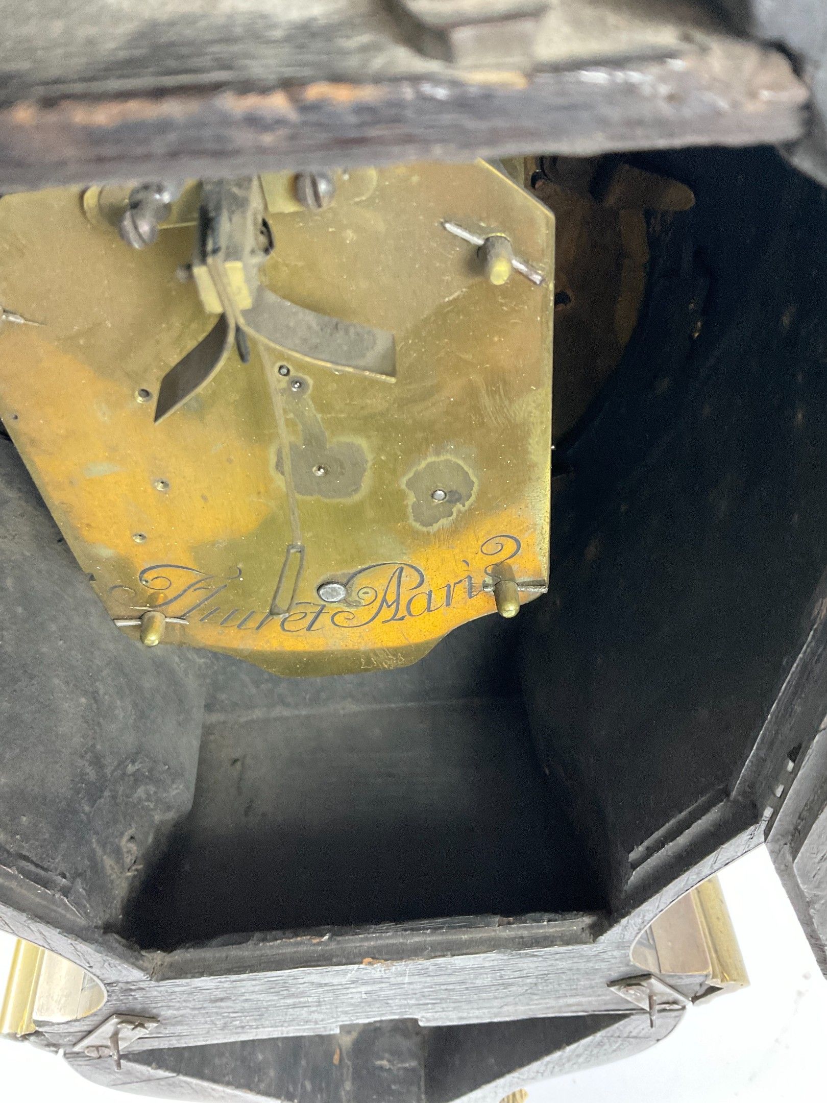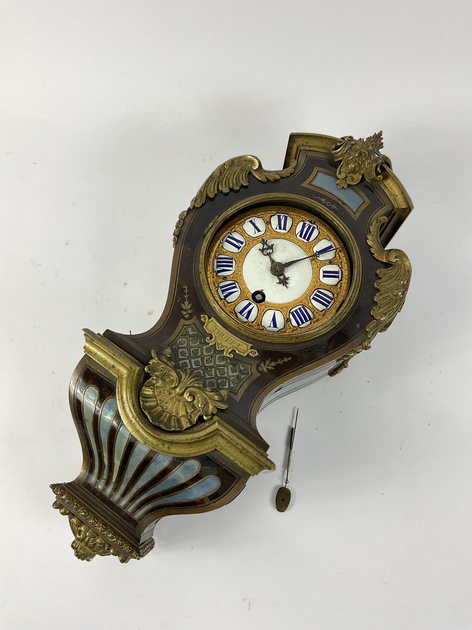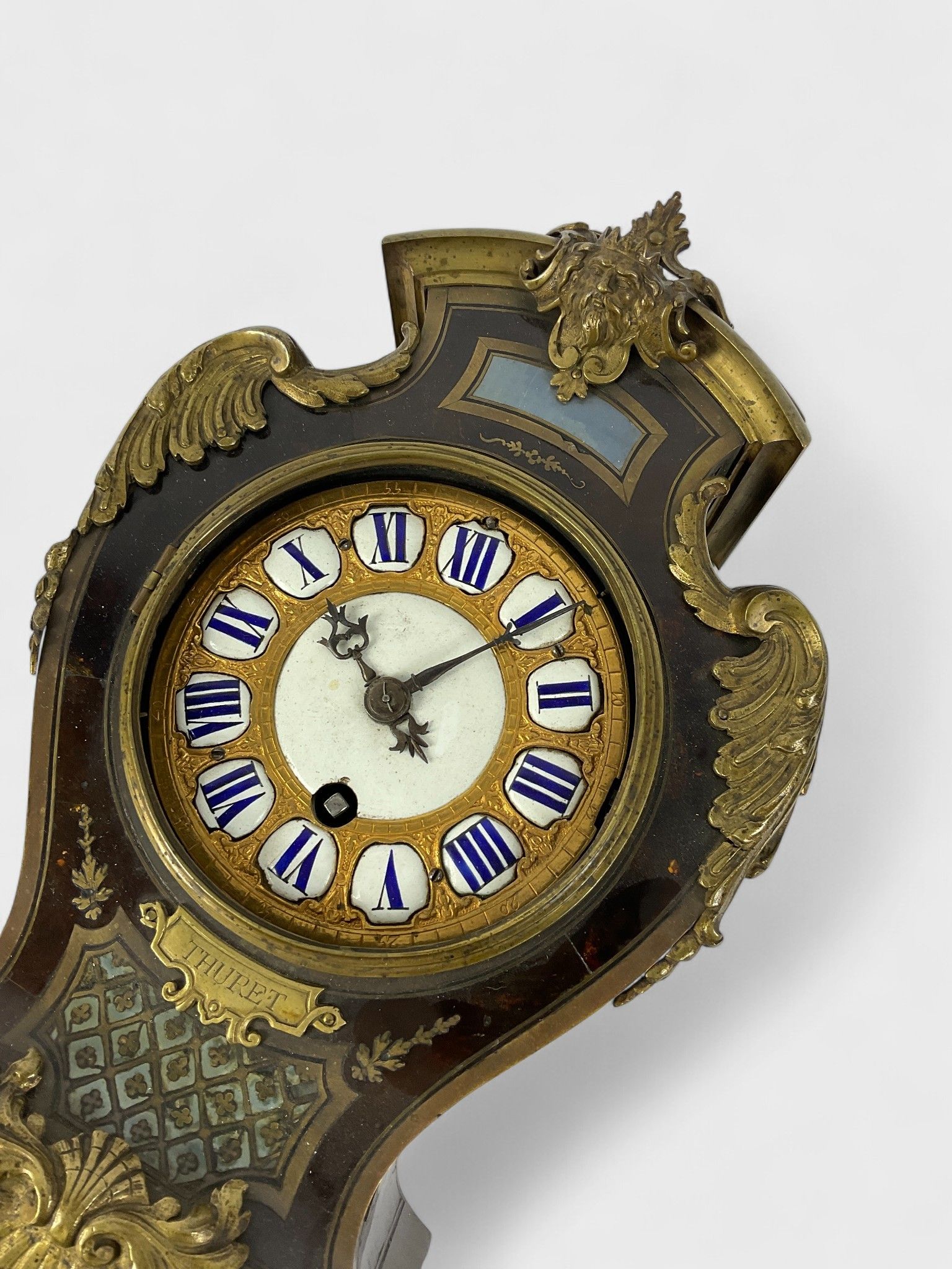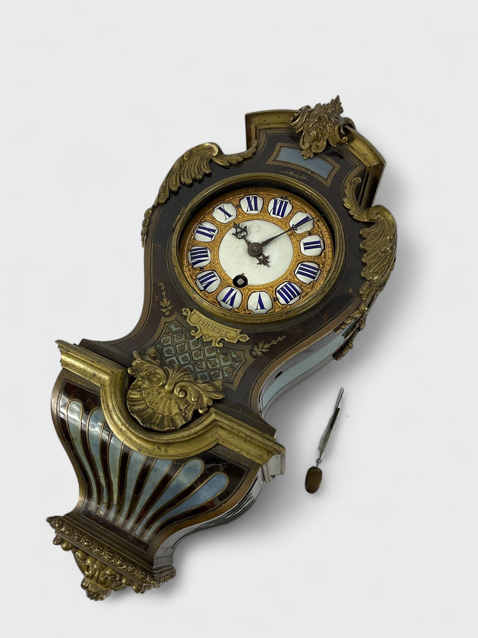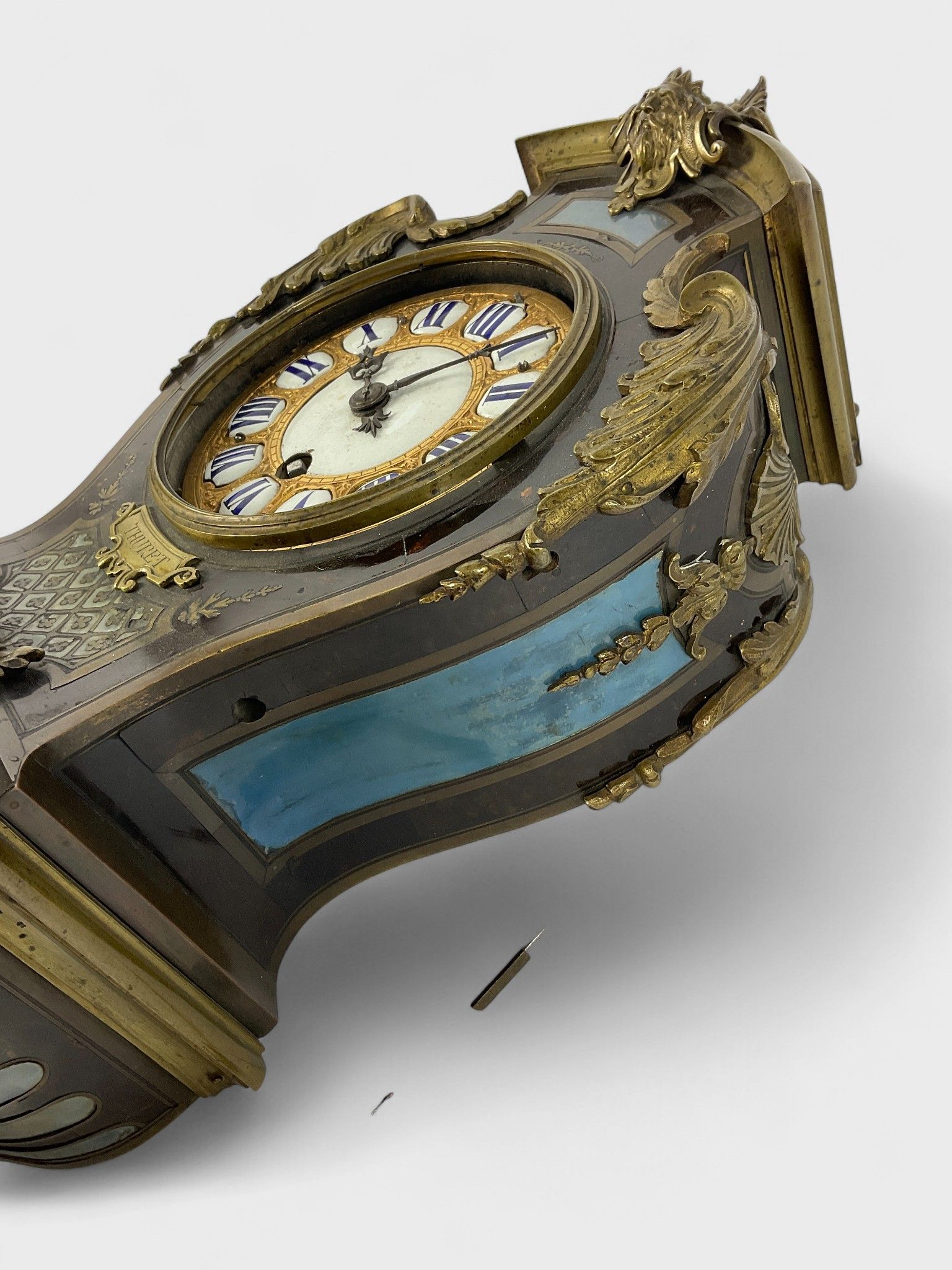In tortoise shell with inlaid decoration of brass fillets and shell with a lapis lazuli patina. Beautiful ormolu decoration, falls, shells, masks. Enamelled dial.