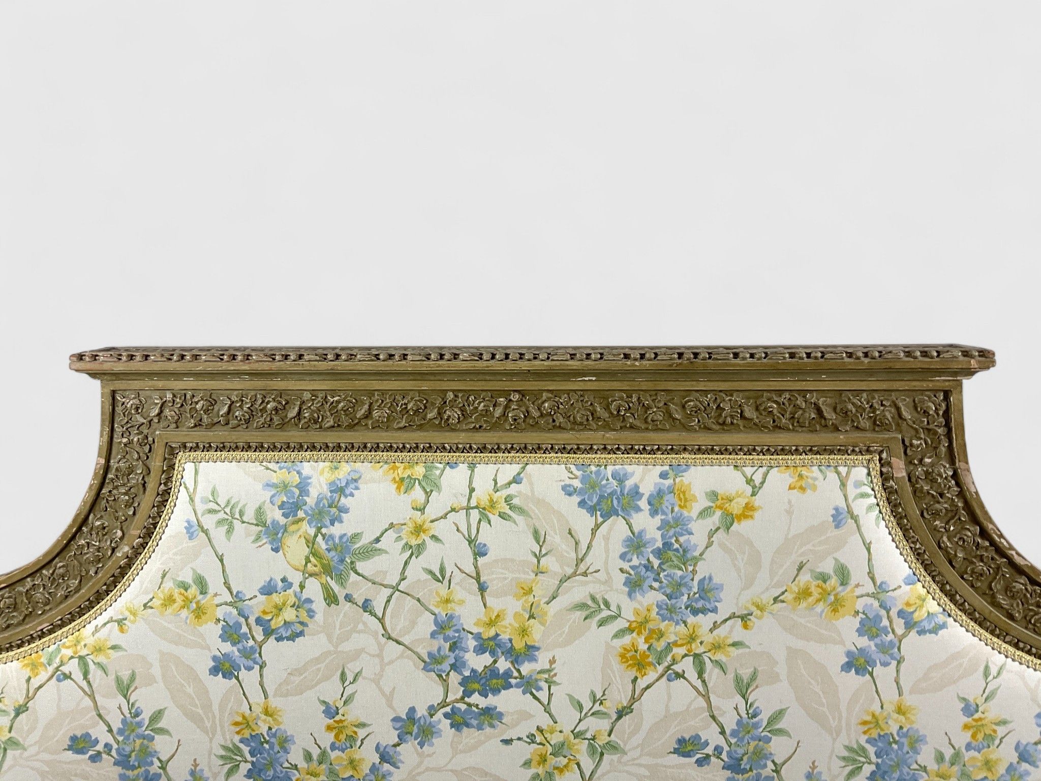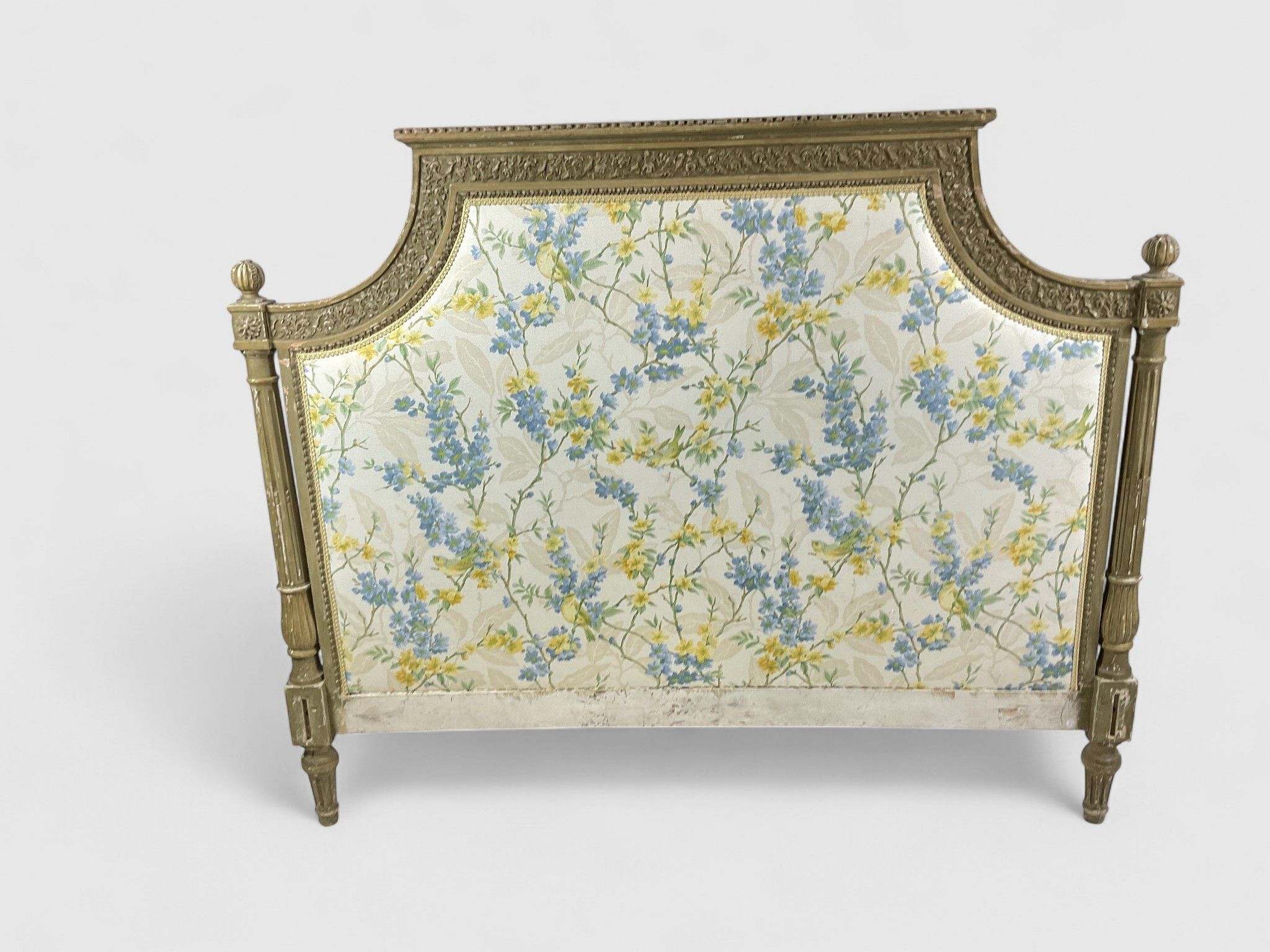 Beautiful Napoleon III period bed, In grey relacquered wood, with detached columns, in the Louis XVI style, Trimmed with a cotton fabric printed with yellow and blue flowers, H: 133 cm - W: 200 cm - D: 140 cm