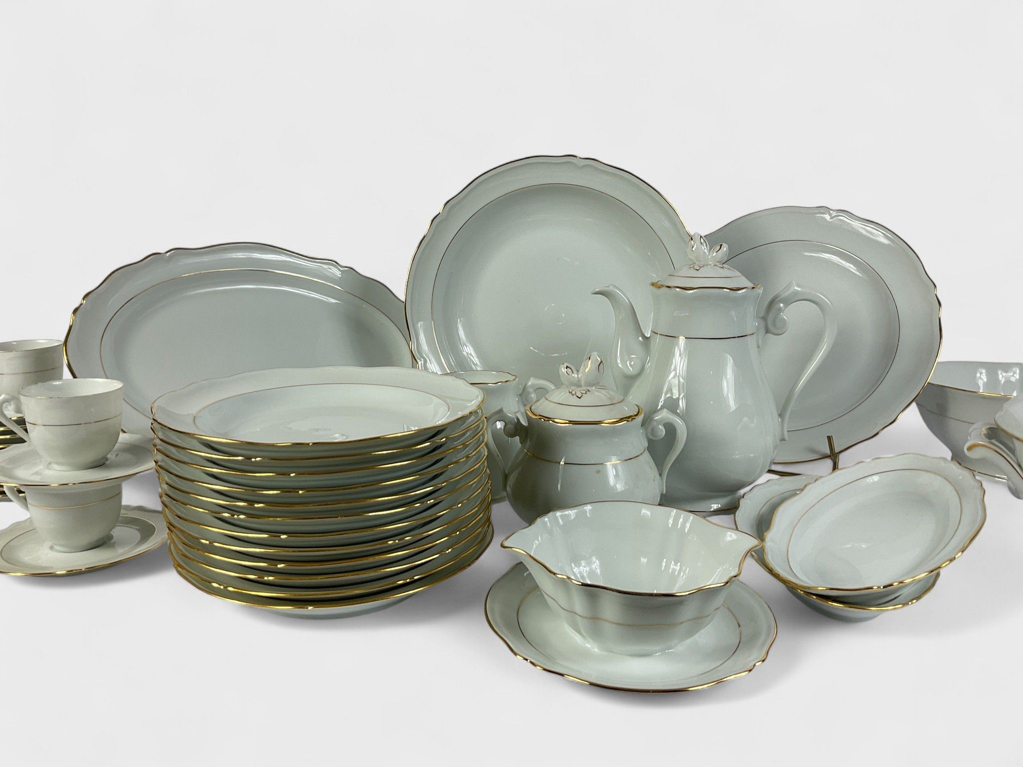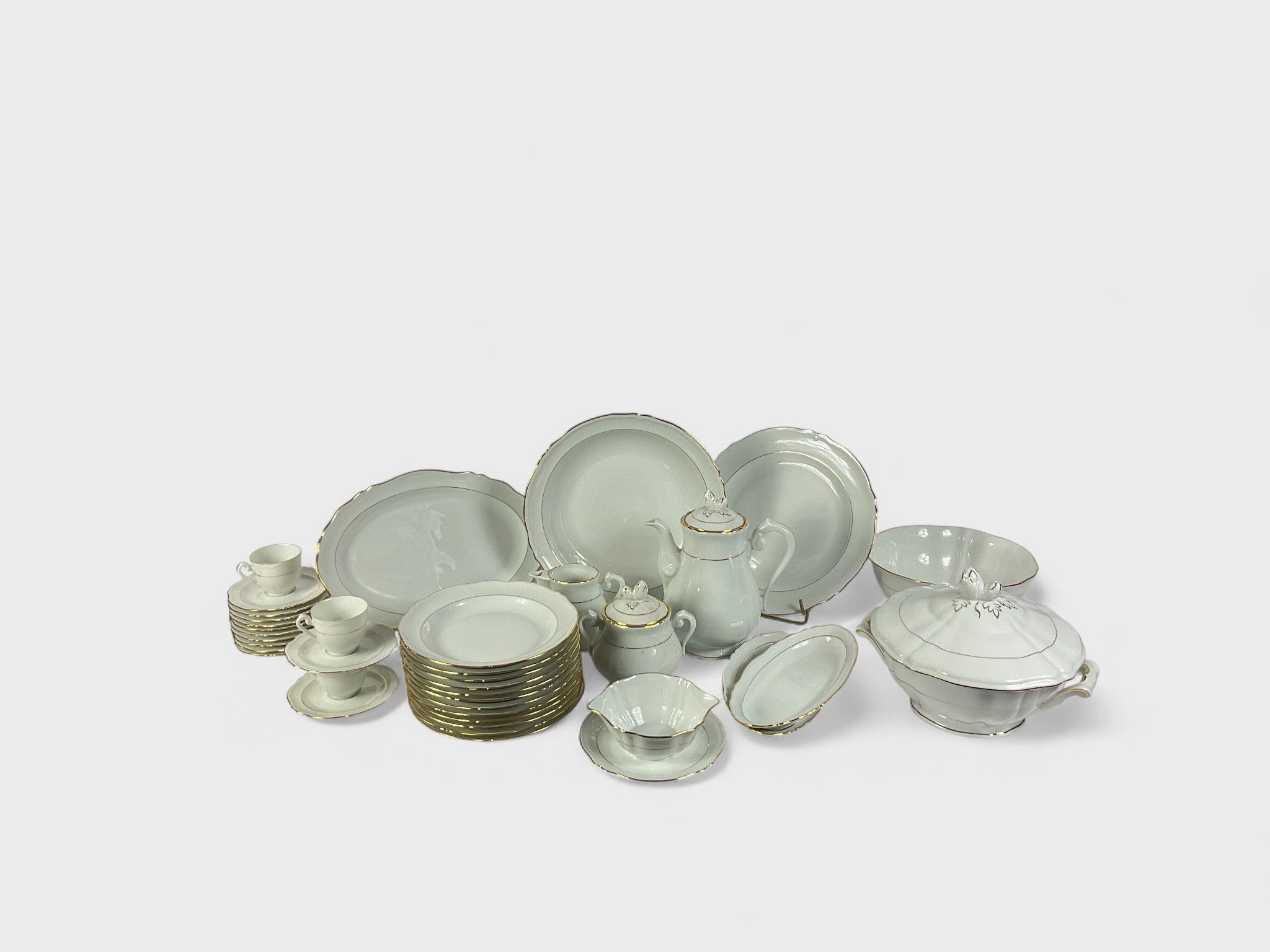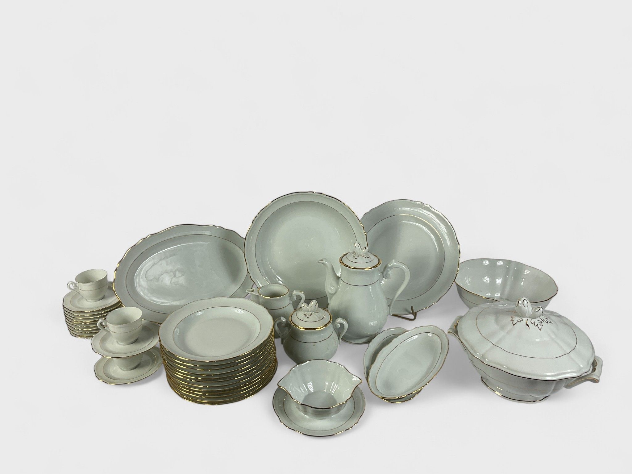 "Art de la table" circa 1950/1960 Hard porcelain Georges Boyer, Limoges France An important white and gold porcelain dinner service with "contours" edges, comprising: One oval serving dish, Two round serving dishes, One salad bowl, One soup tureen, Two ramekins, One sauce boat, One teapot, One sugar bowl, One milk jug, Twelve saucers, Three cups, Twelve soup plates, Twenty-four dinner plates, Twelve dessert plates, approx. 74 pieces (as new)