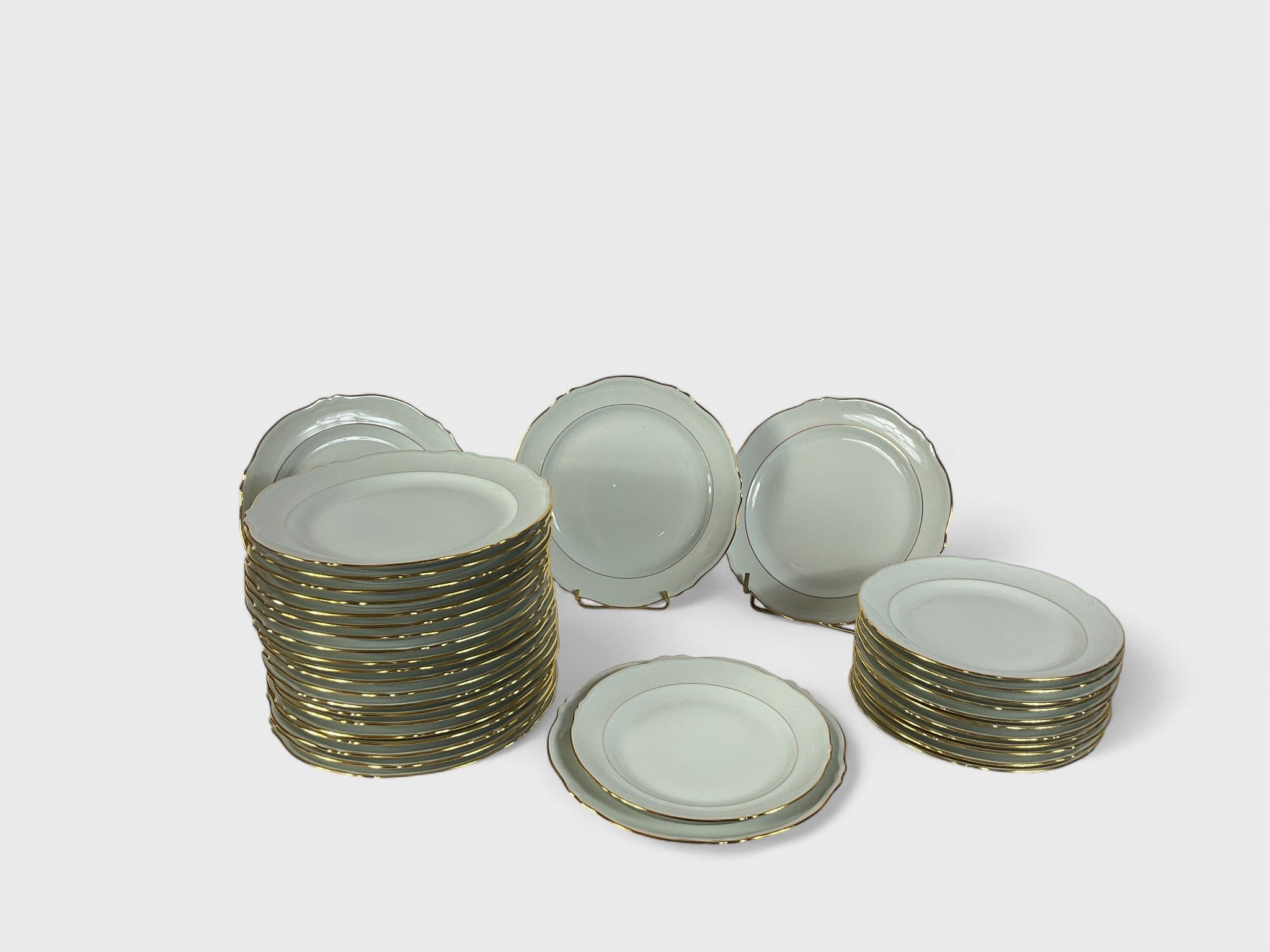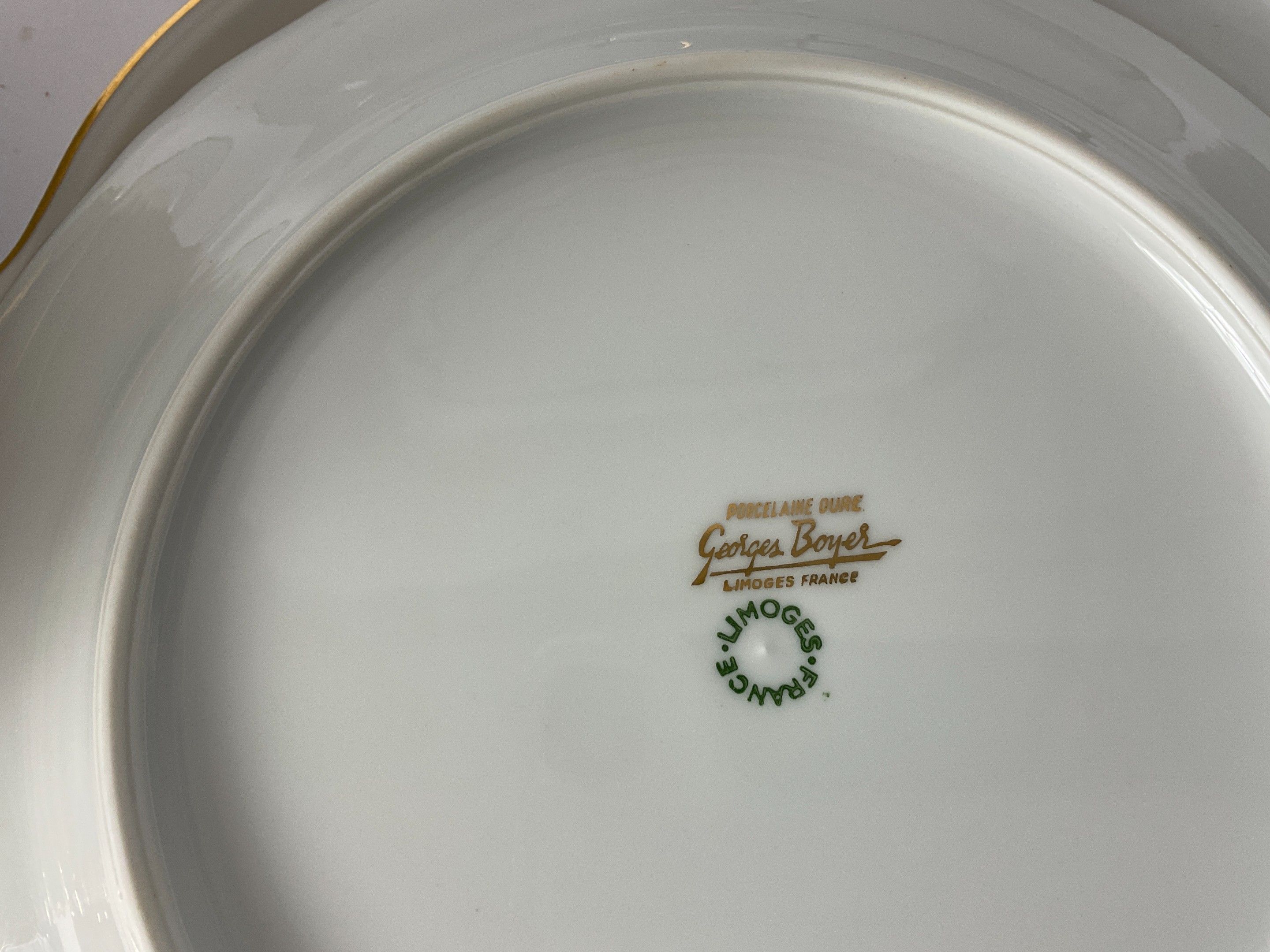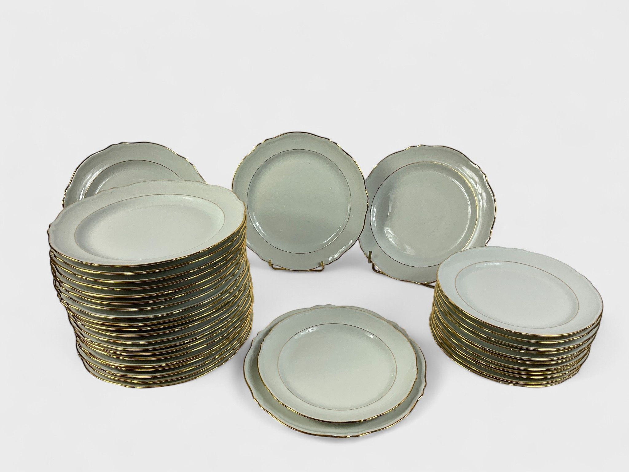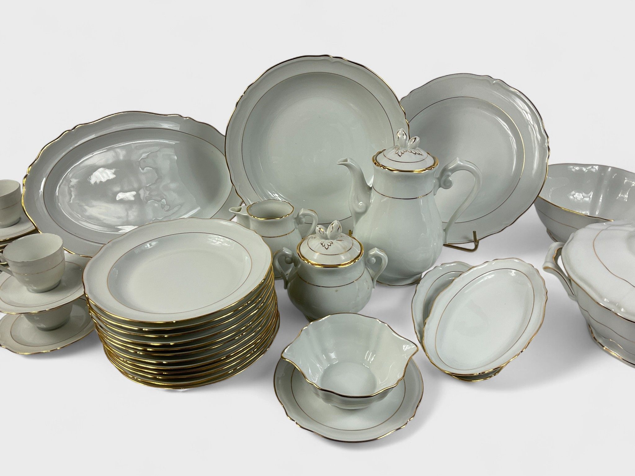 "Art de la table" circa 1950/1960 Hard porcelain Georges Boyer, Limoges France An important white and gold porcelain dinner service with "contours" edges, comprising: One oval serving dish, Two round serving dishes, One salad bowl, One soup tureen, Two ramekins, One sauce boat, One teapot, One sugar bowl, One milk jug, Twelve saucers, Three cups, Twelve soup plates, Twenty-four dinner plates, Twelve dessert plates, approx. 74 pieces (as new)