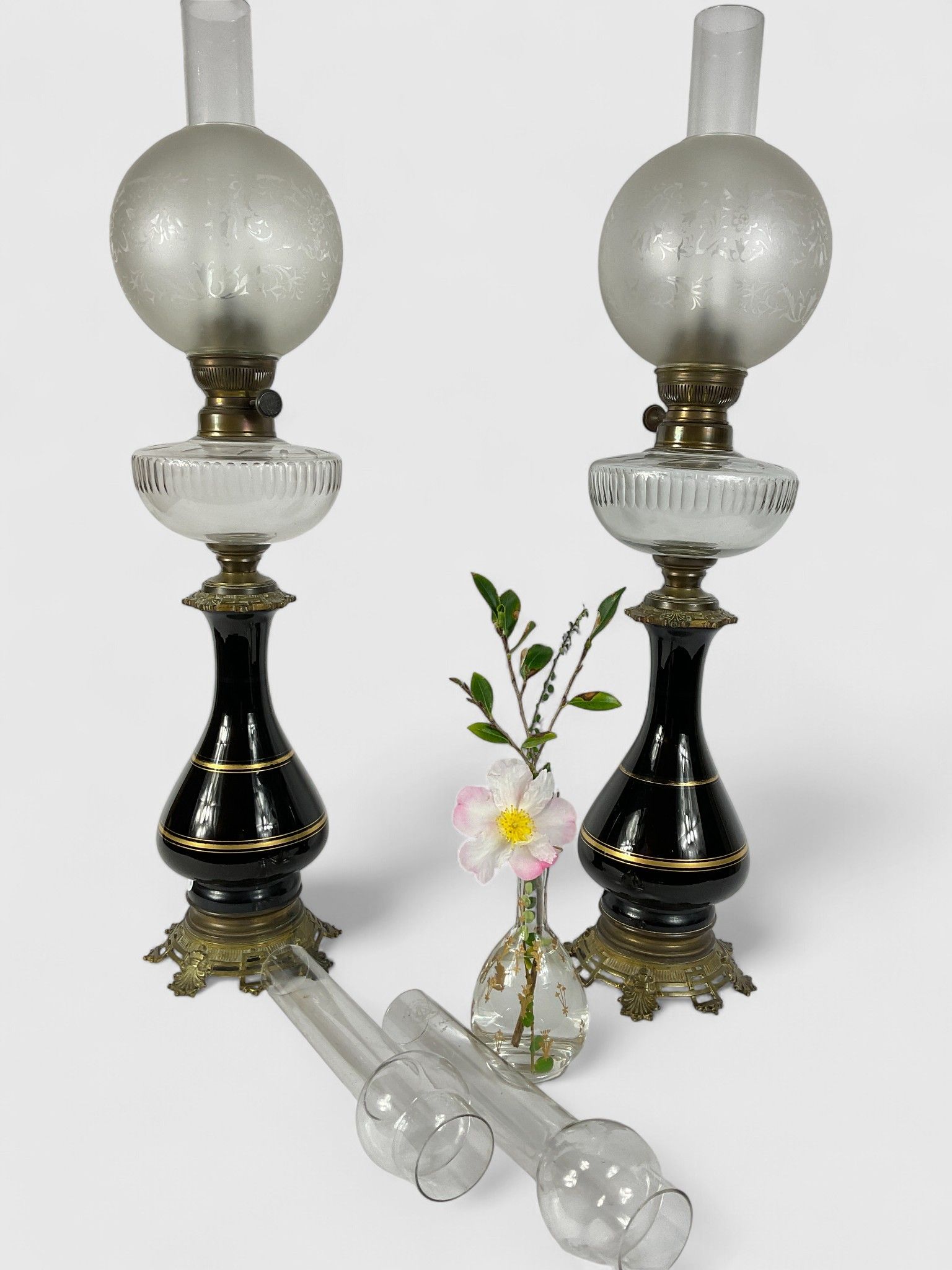 A pair of Napoleon III period oil lamps In black opaline wit…