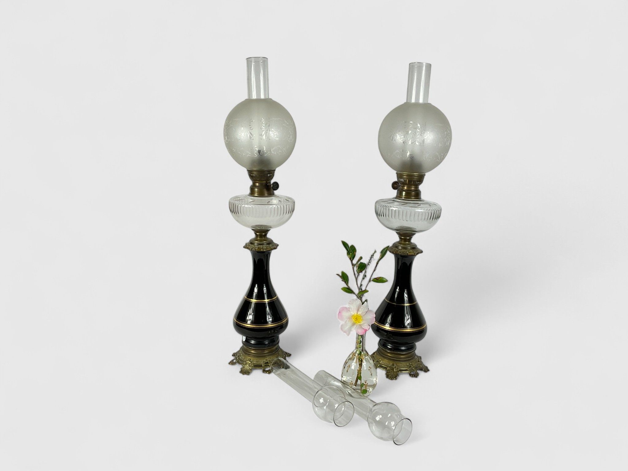 A pair of Napoleon III period oil lamps In black opaline with gold fillets, gilt bronze mount and four tubes, the engraved glass globes, one of which is damaged, H: 66 cm - W: 74.5 cm