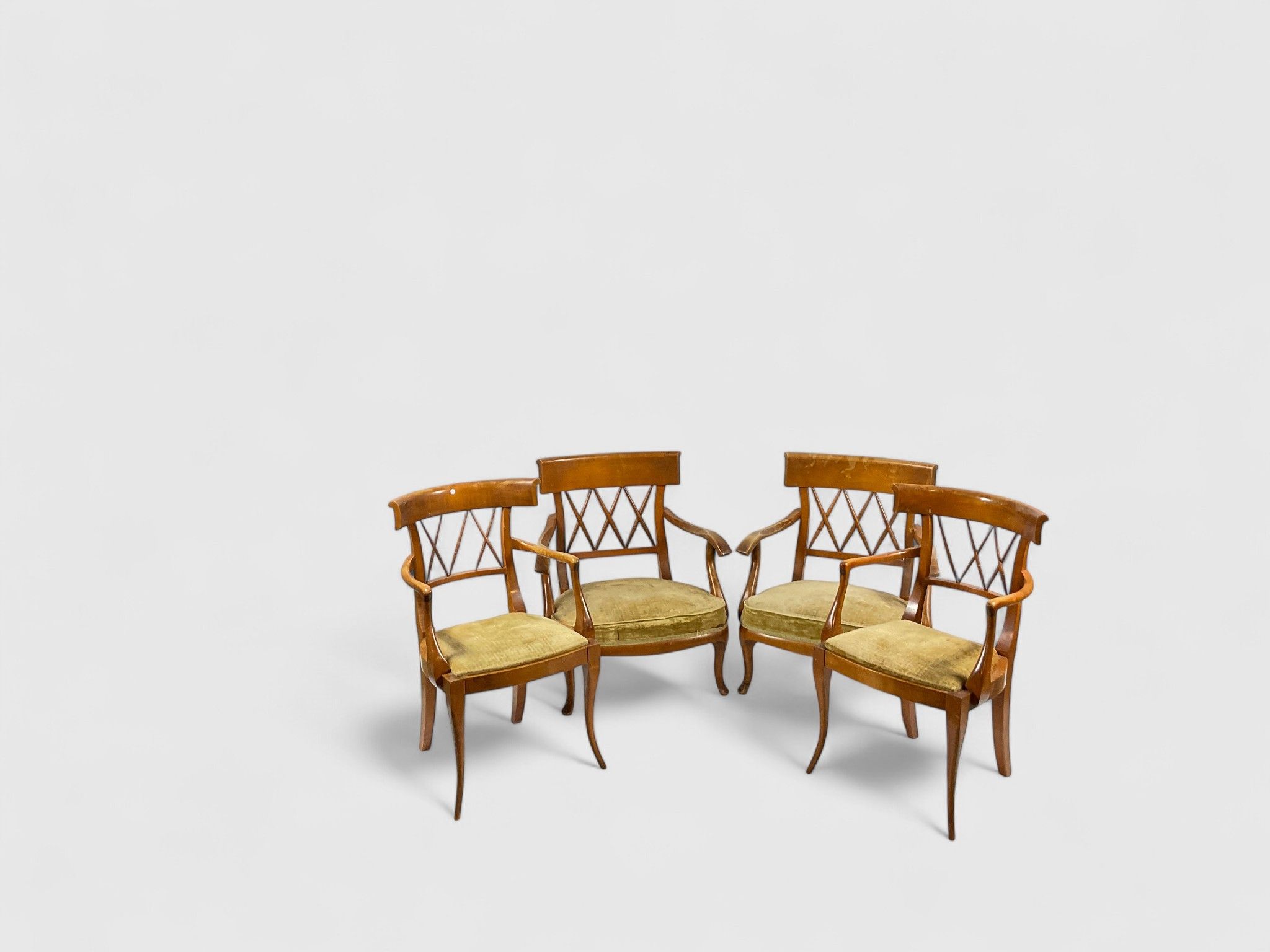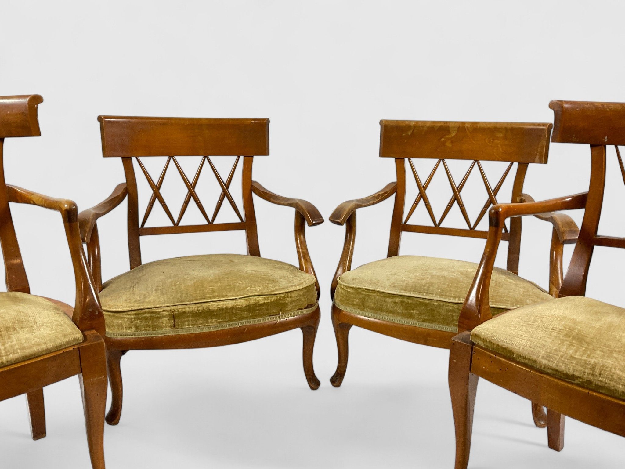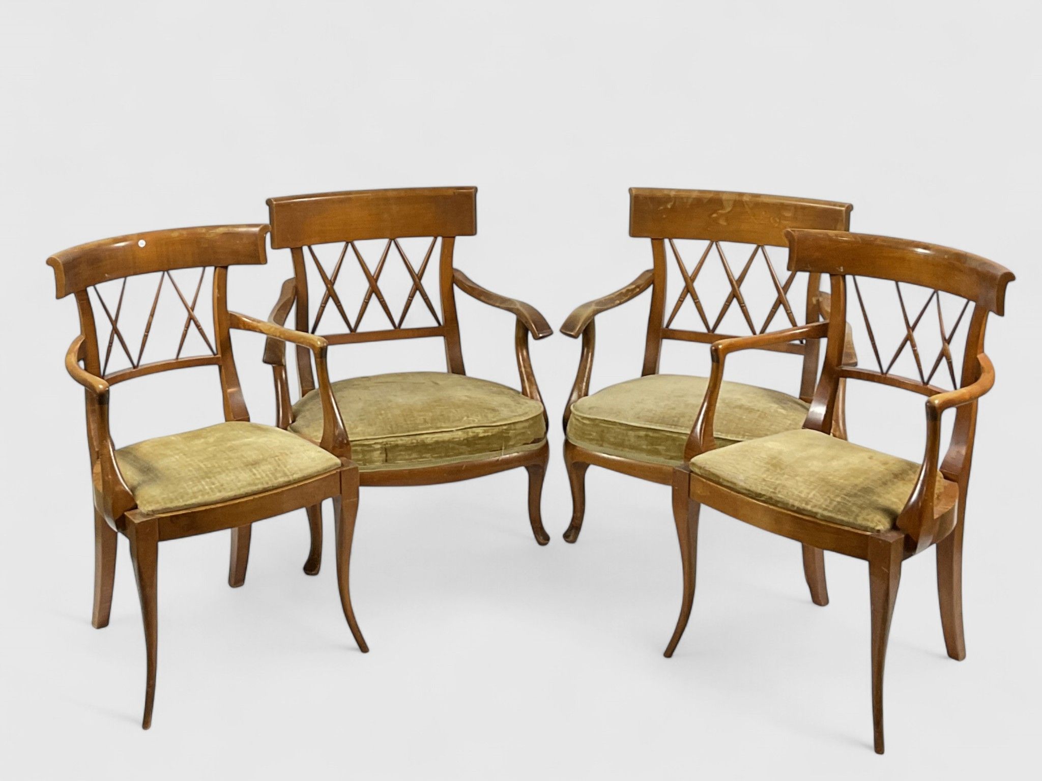Living room furniture, English style Comprising a pair of armchairs and a pair of low wide armchairs with light wood spindle backs, upholstered in almond green velvet, About 1960 H: 81 cm - W: 71 cm - D: 55 cm; H: 85 cm - W: 51 cm - D: 42 cm (Minor wear)