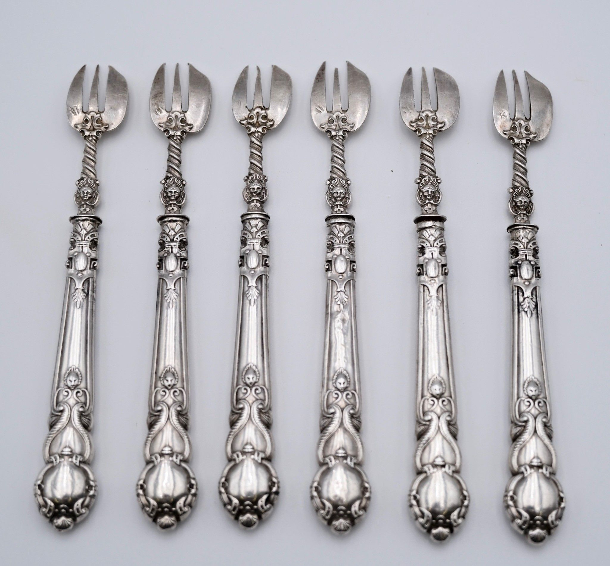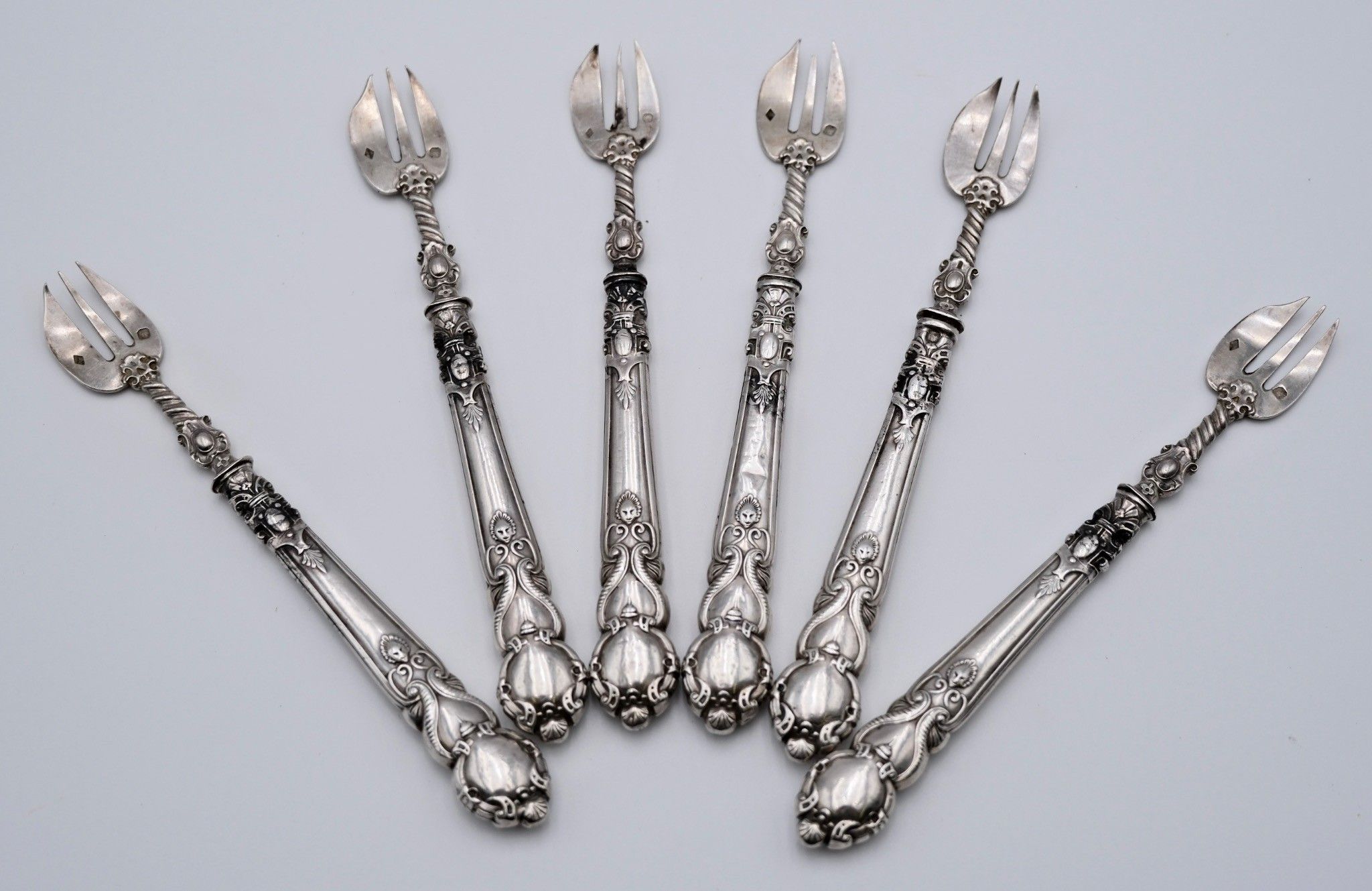 Suite of six silver fruit forks with forged silver handles hallmarked Minerve Title 1 (950°/°°) and Title 2 (800°/°°) with Louis XV style decoration of shells, acanthus leaves and foliage.
