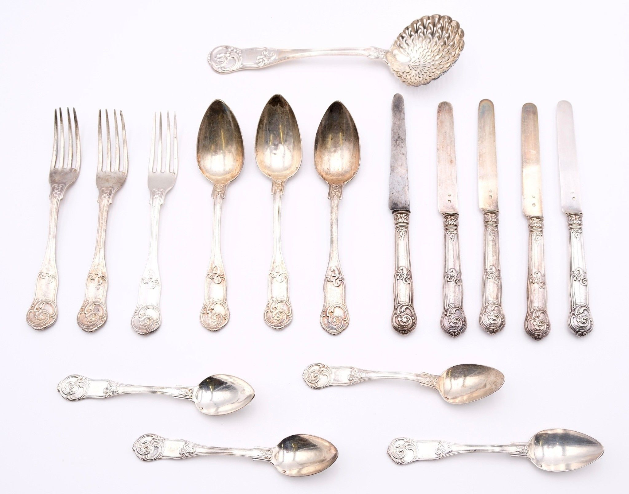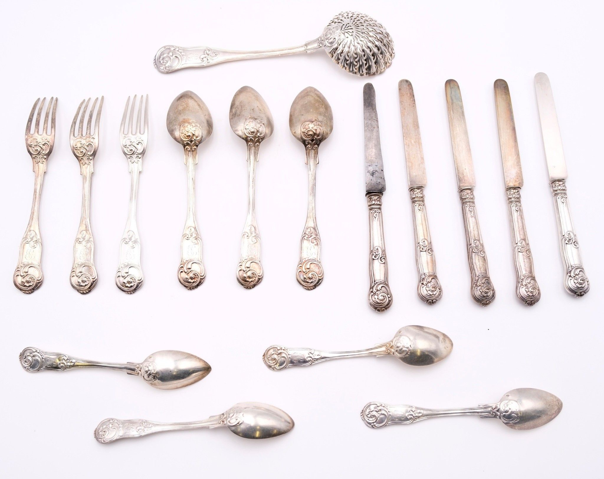 A set of household knives in silver (950°/°°°) hallmarked Minerve Premier Titre, with rocaille decoration, comprising :