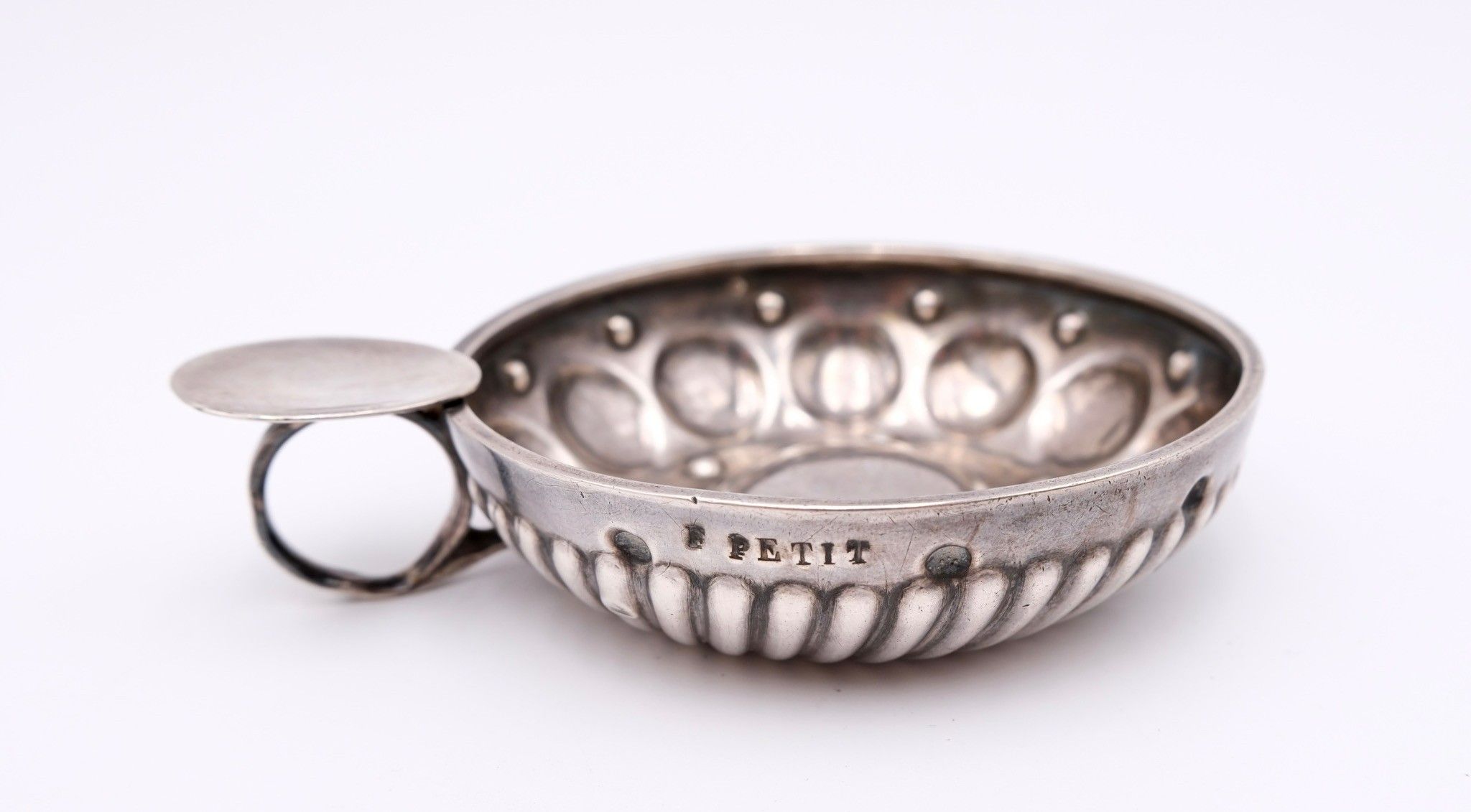 Silver wine taster (950°°/°°) Minerve hallmark Title 1 with gadrooned body and one handle, inscribed "F PETIT" . Weight : 71,5 g.