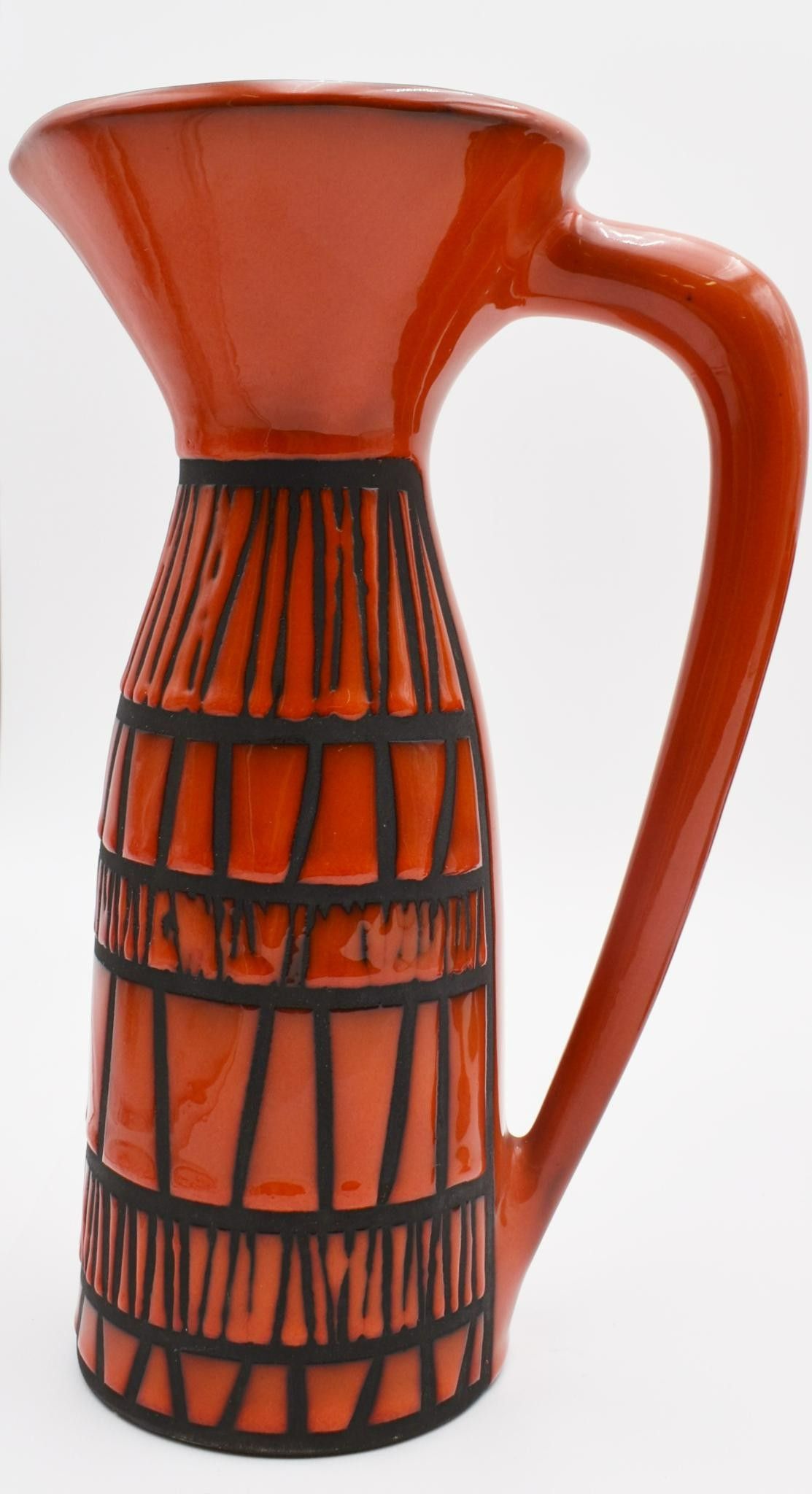 Orangeade service comprising a jug and five orange-glazed earthenware mazagrans with brown geometric decoration in reserve.