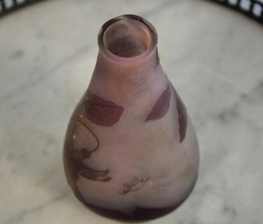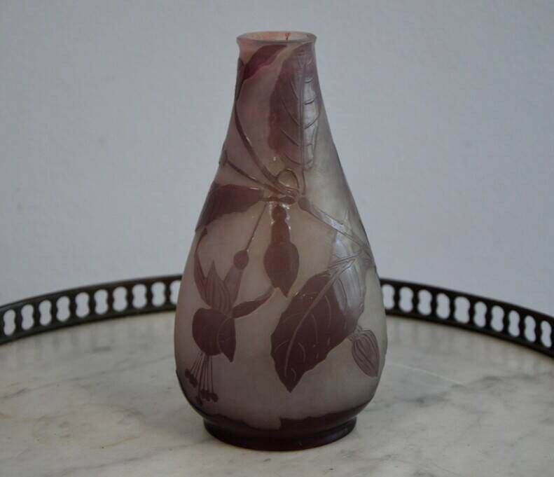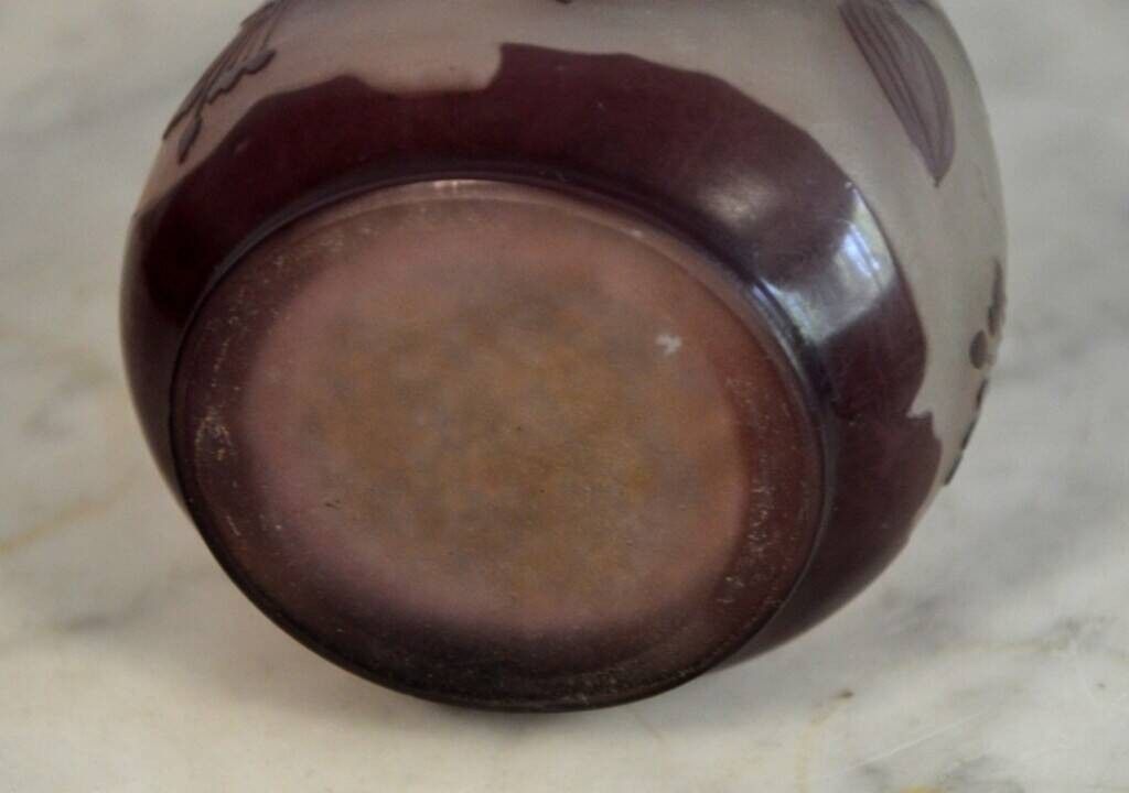 Acid-etched multi-layered glass soliflore vase decorated with violet flowers on a purplish background. Signed Gallé.