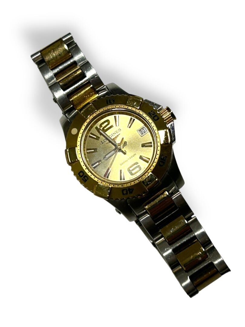 LONGINES, Steel bracelet watch, "Hydro Conquest Automatic" model, gold dial, date window at 3 o'clock, quartz movement, steel and gilt metal bracelet with folding clasp.