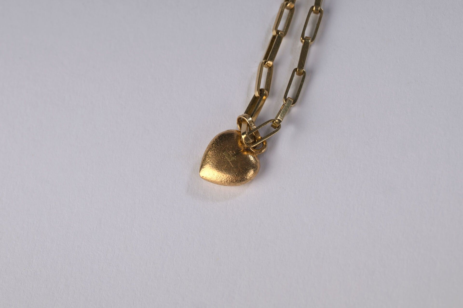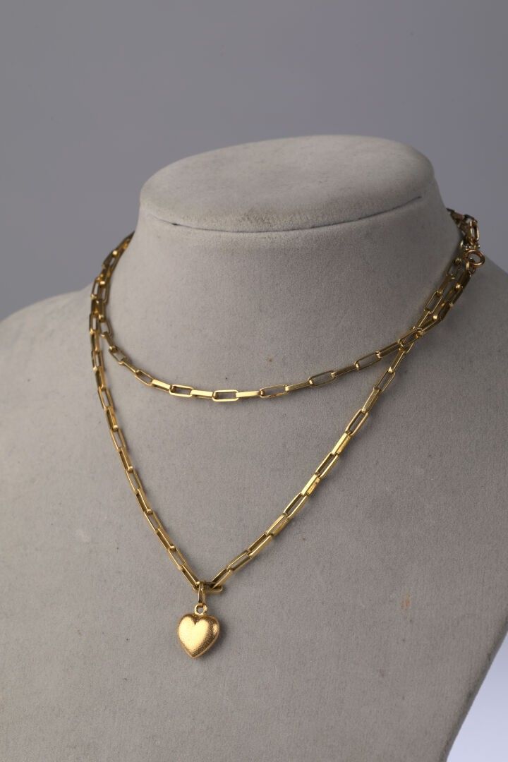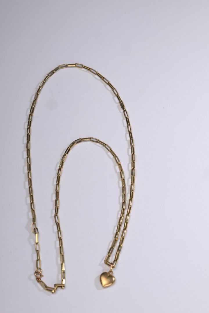 Necklace chain in yellow gold 750 ‰ rectangular mesh, and heart charm in yellow gold 750 ‰, length 61 cm, weight 15.82 g