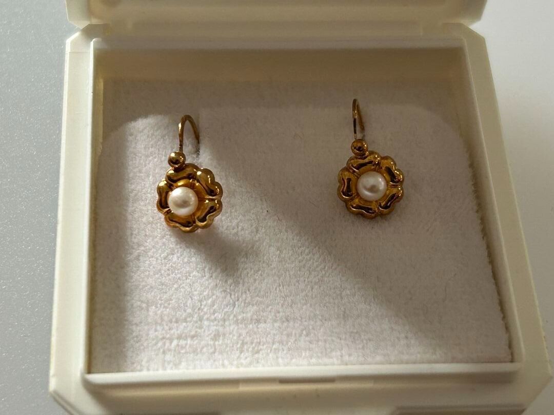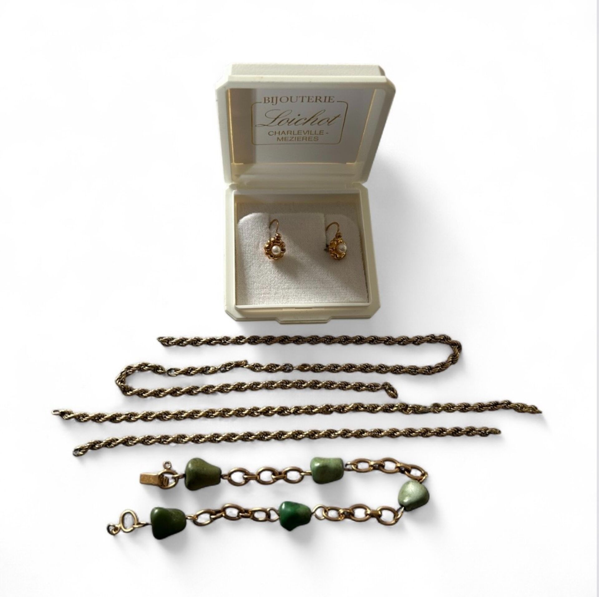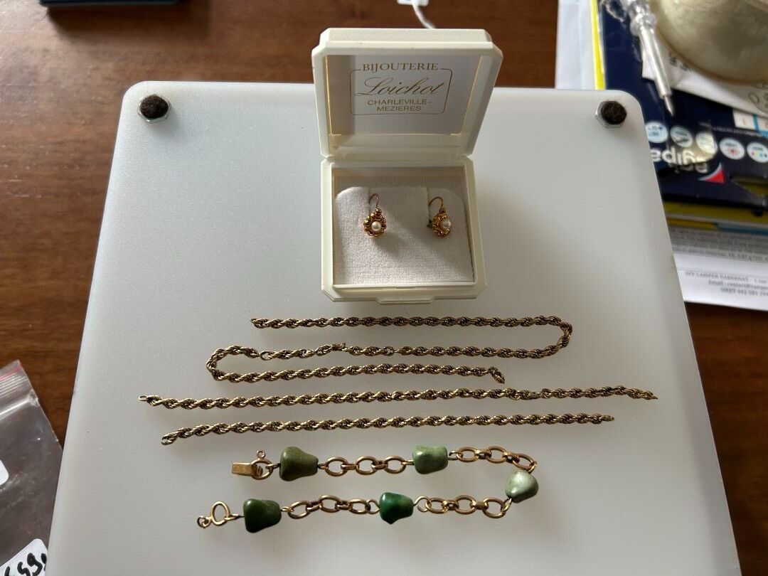 Chain in gold 750 thousandths for debris (accidents). P. 6.59 g A pair of flower earrings in gold 750 thousandths decorated with cultured pearls, PB. 0.85 g and a bracelet in gold 750 thousandths decorated with green stones (probably turquoise), PB. 10.71 g