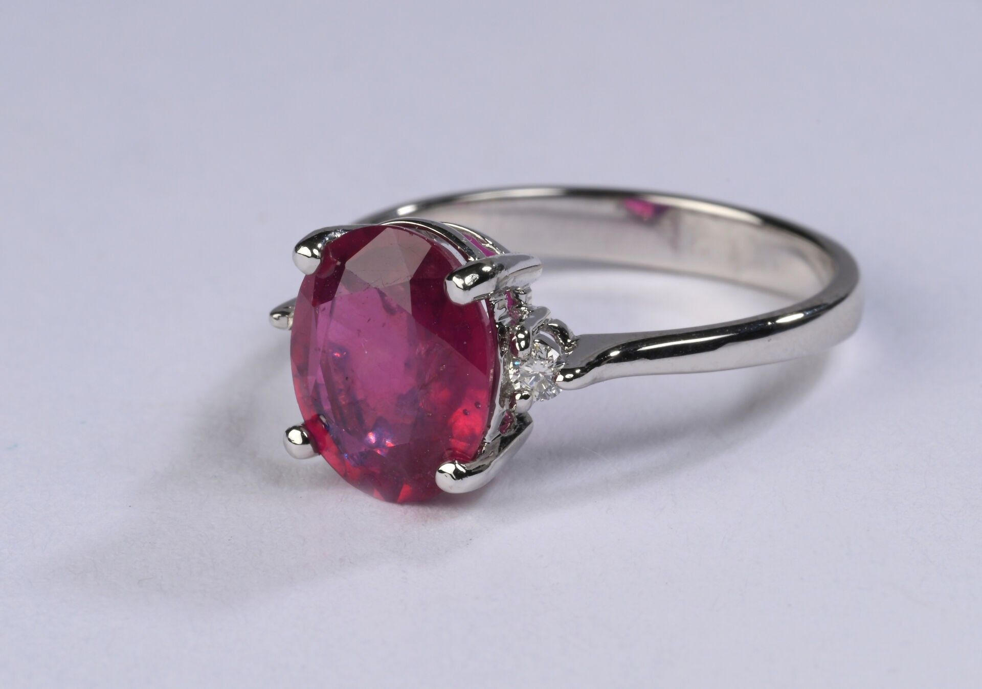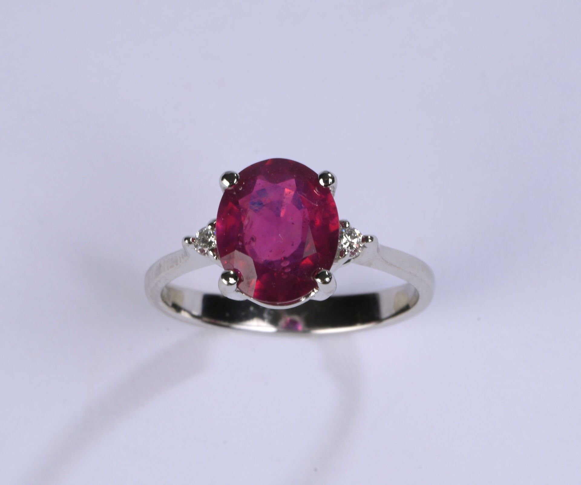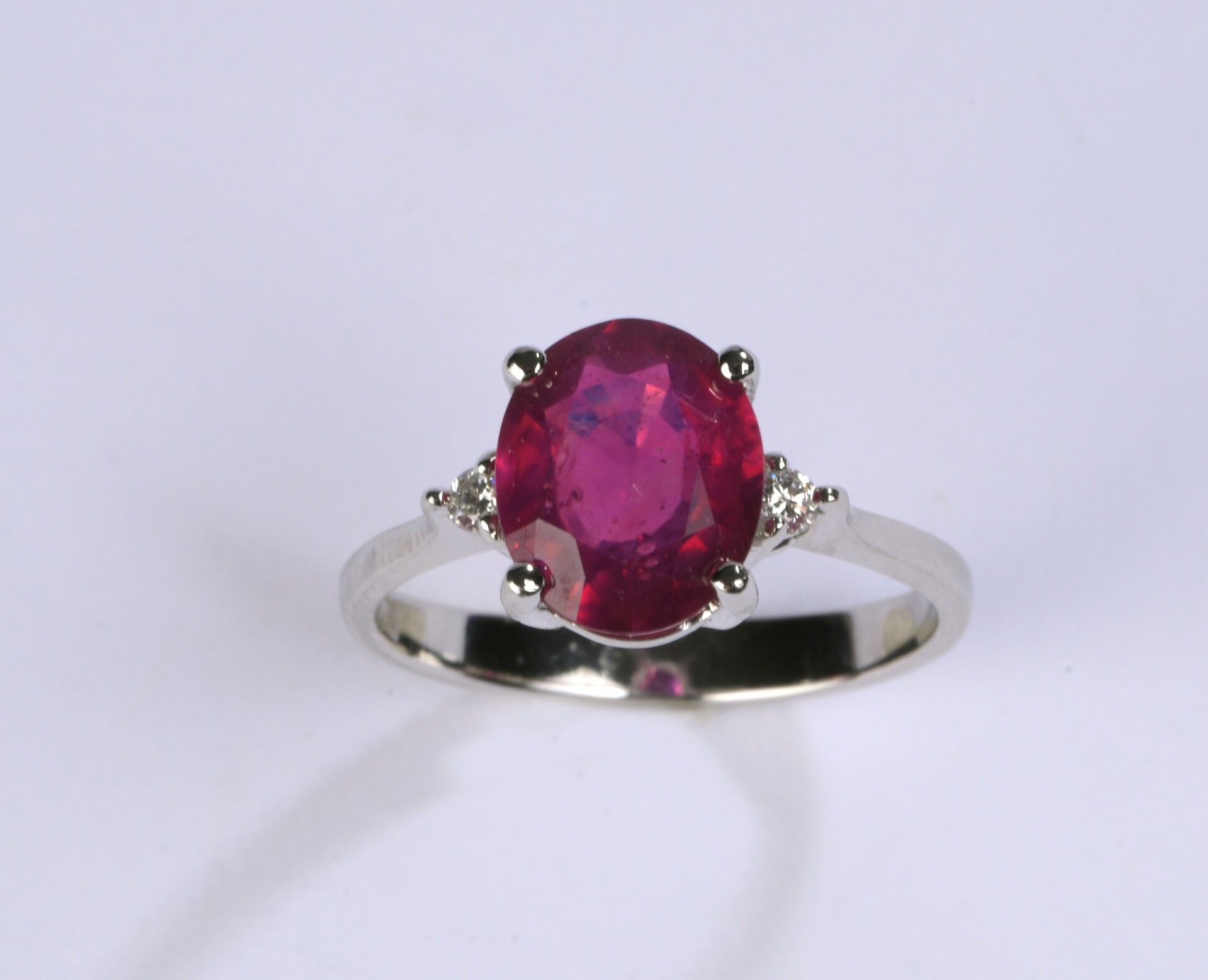 Ring in white gold 750 ‰ set with a ruby (treated) weighing an estimated 2.80 ct shouldered by two small brilliant diamonds, turn of finger 53, weight 3.39 g