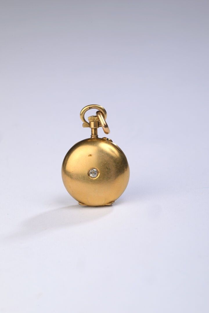 Yellow gold 750 ‰ collar watch, mechanical movement, double case in white gold horsehead hallmark, back set with a small diamond weighing approximately 0.10 ct, gross weight 14.9 g
