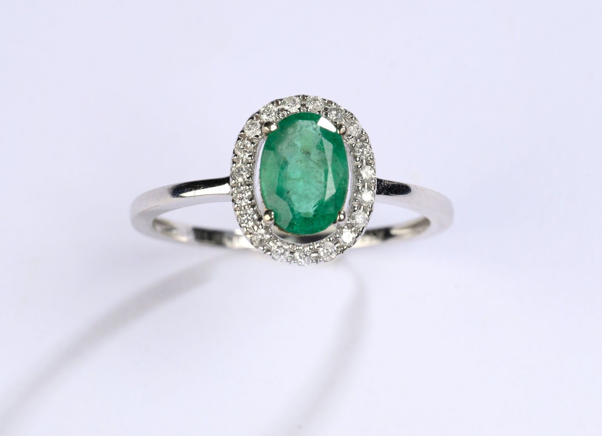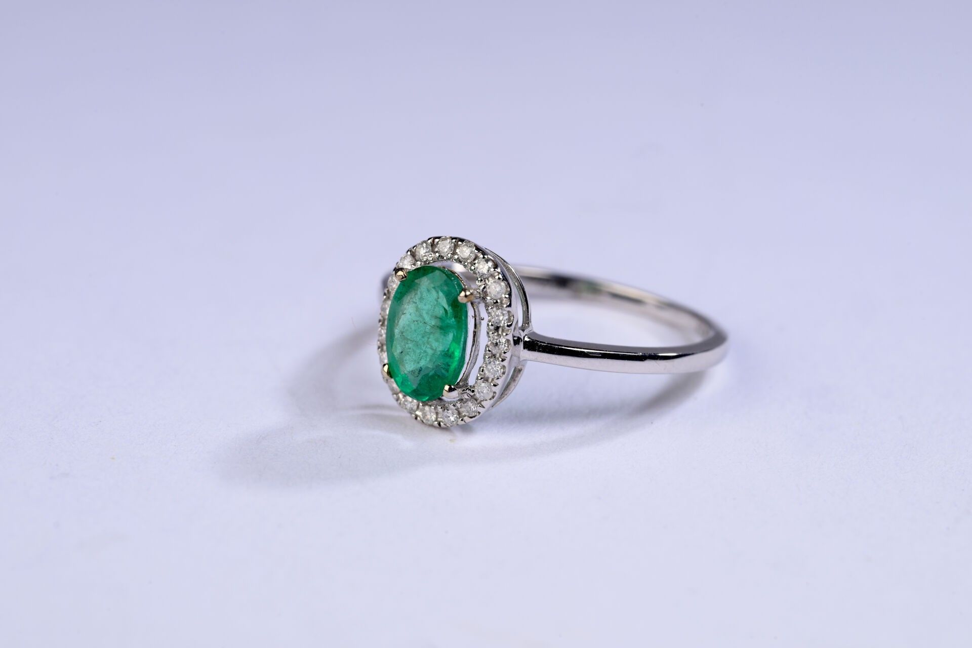 Ring in white gold 750 ‰ set with a small oval emerald weighing an estimated 0.80 ct surrounded by small brilliant-cut diamonds, finger circumference 52, weight 1.6 g