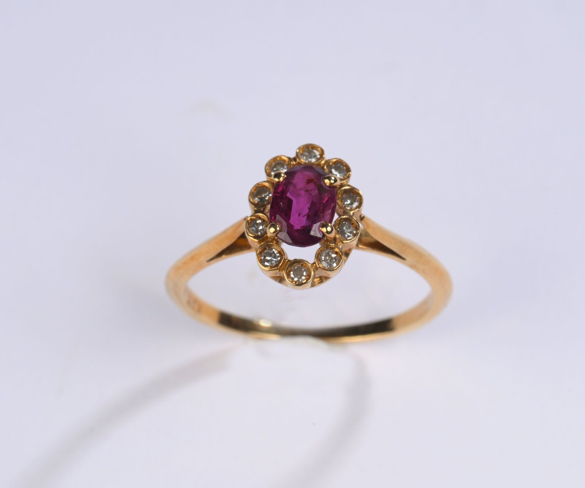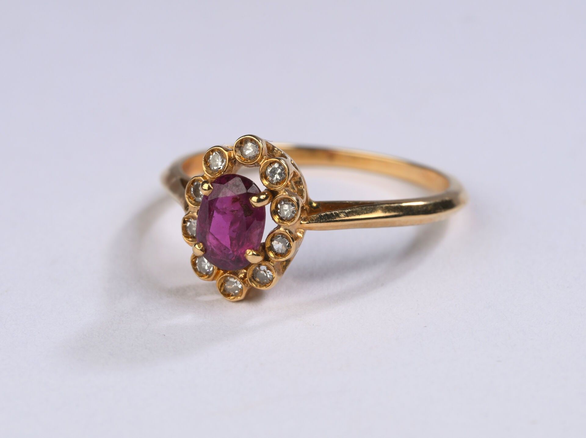 Yellow gold 750 ‰ ring set with a small ruby (treated) weighing an estimated 0.5 ct surrounded by small 8/8 diamonds, finger circumference 53, weight 2.2 g