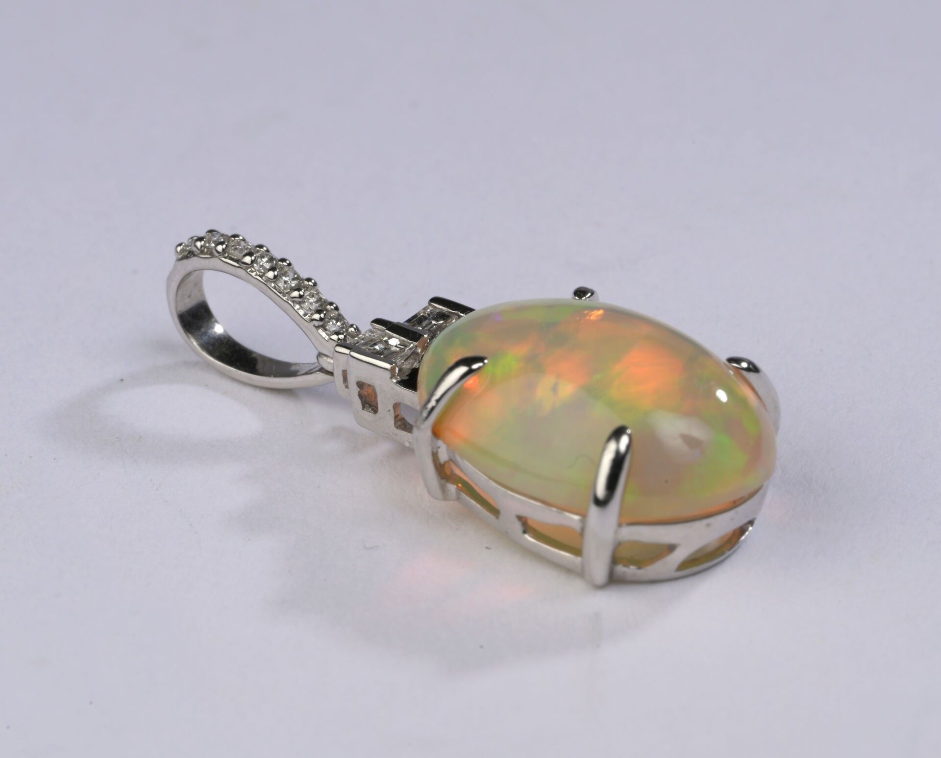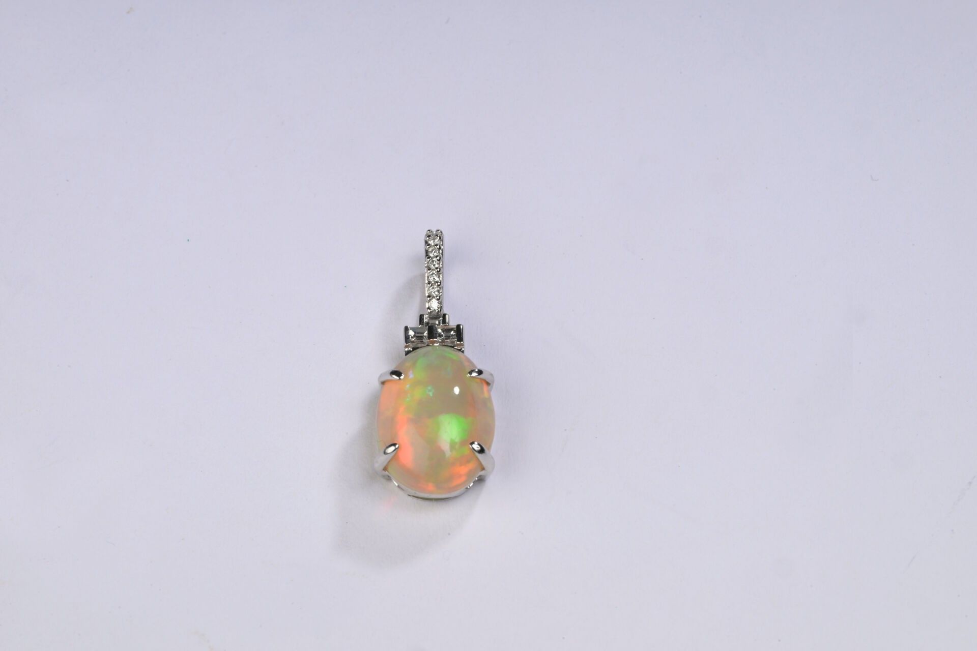 White gold 750 ‰ pendant set with a beautiful "rolling flash" opal cabochon highlighted with three small emerald-cut diamonds and a line of diamonds on the bélière, weight 2.49 g