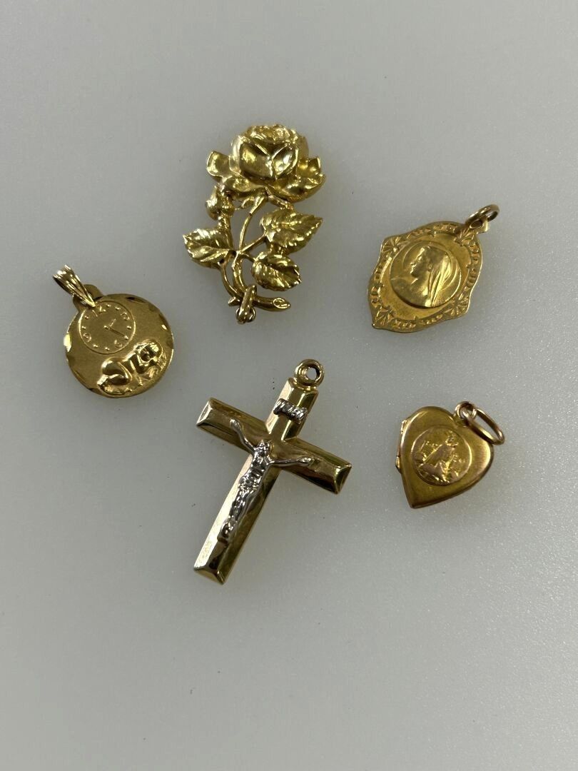 Set of 4 religious medals in 750 thousandths gold and a rose-shaped pendant. P. 8.11 g