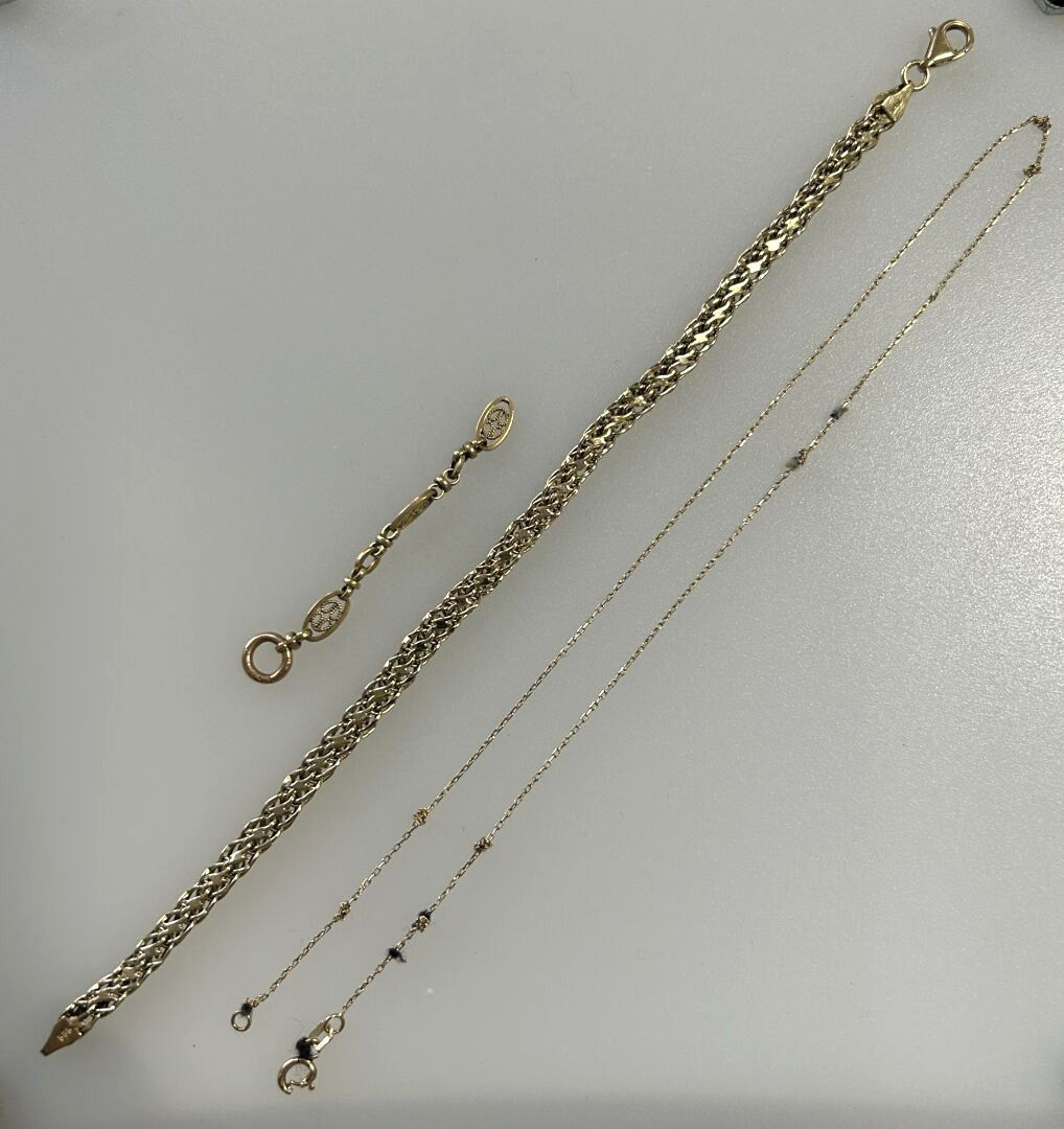 Bracelet in 585 thousandths gold. A chain and part of a chain for scrap in 585 thousandths gold are attached. D. 7.68 g (for fragments)