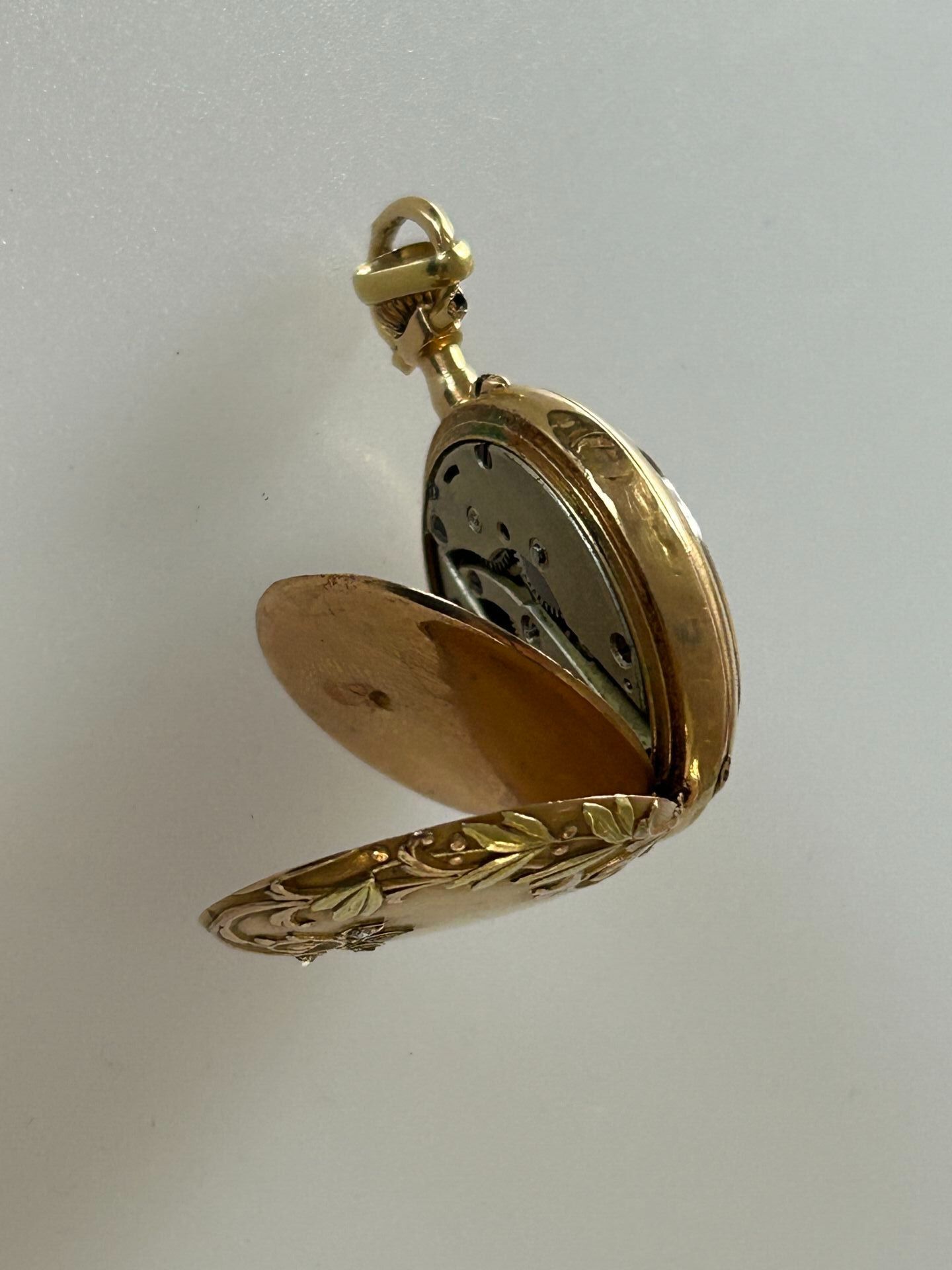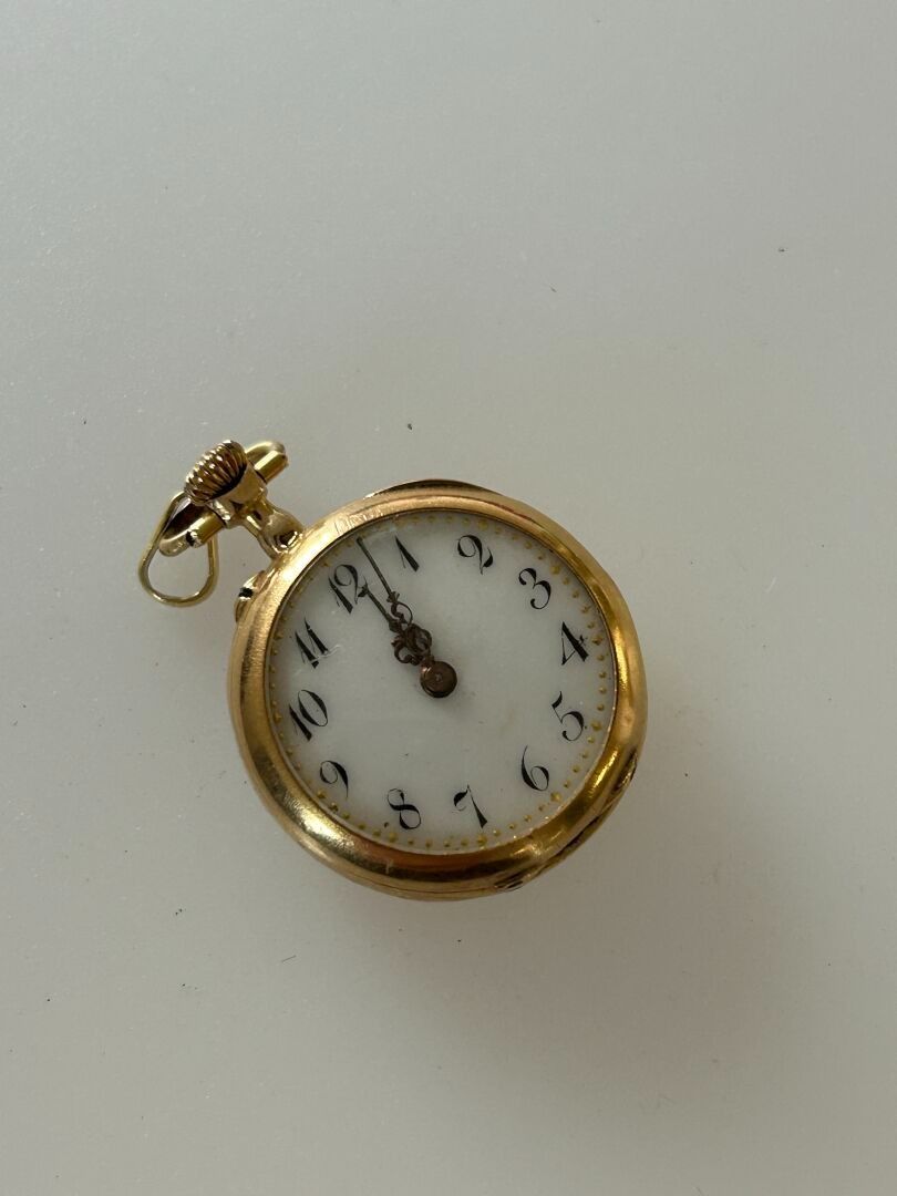 Collar watch in 750 thousandths gold decorated with flowers, foliage and small diamonds, double gold case. PB. 15.69 g