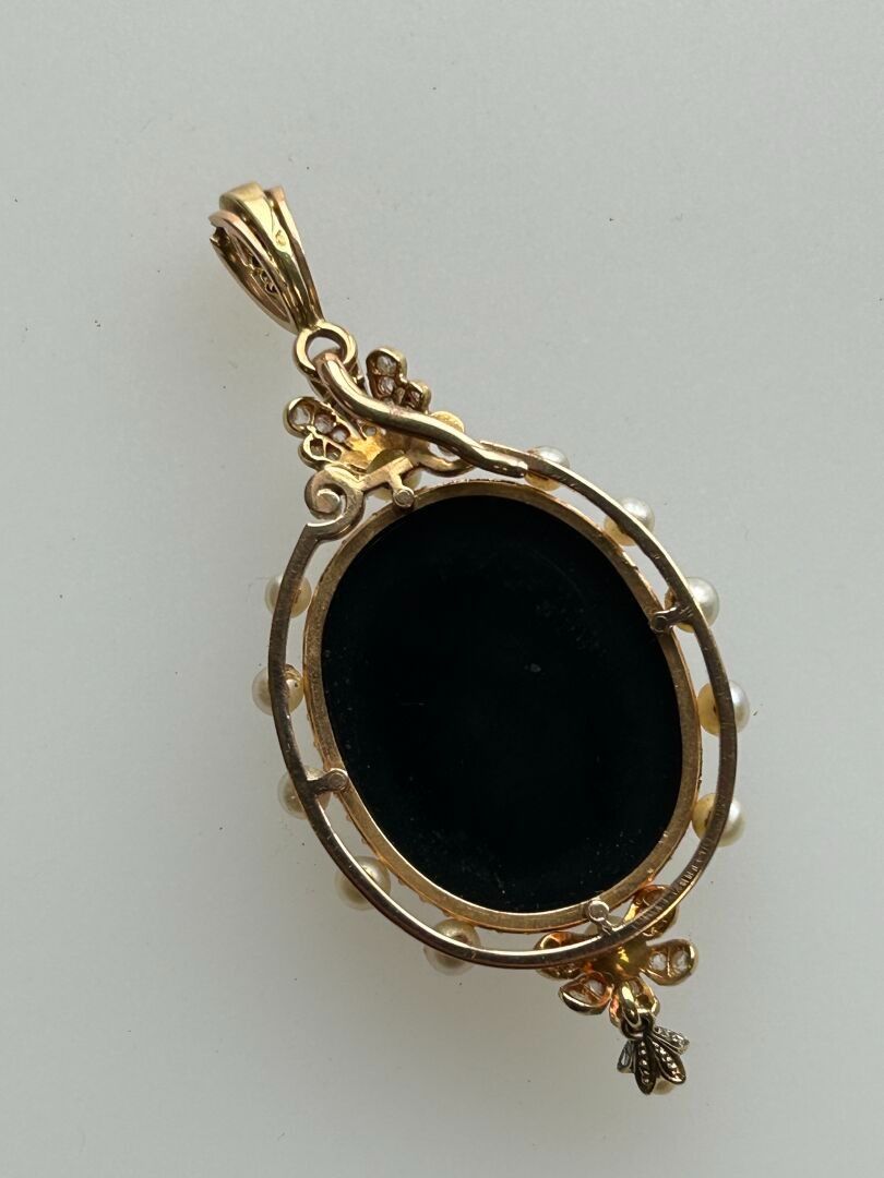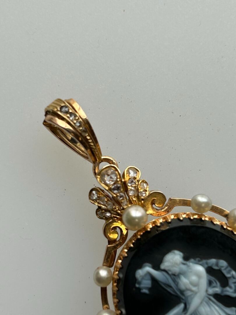 * Pendant in gold, pearls and small diamonds, centre Agathe cameo set representing a woman with a jug. PB. 12,62 g
