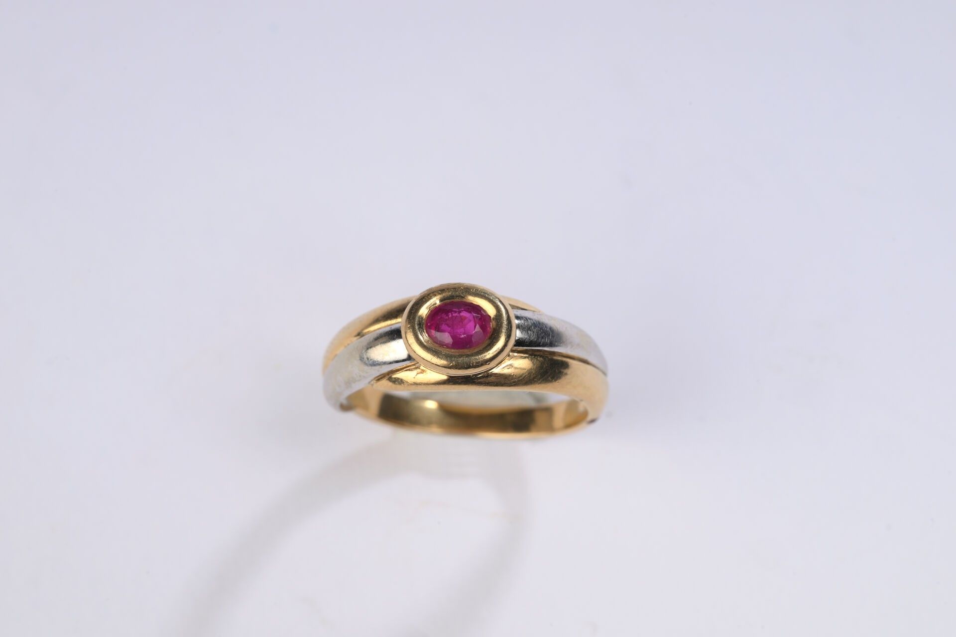 Two gold 750 ‰ cross ring set with a small ruby in a clasp setting, finger size 53, weight 3.4 g