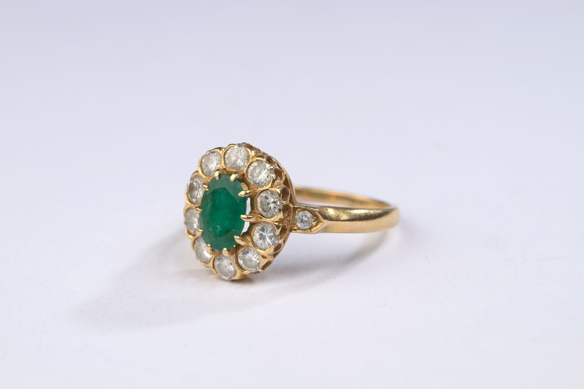 Pompadour ring in yellow gold 750 ‰ set with an oval emerald surrounded by small diamonds, finger size 56, weight 5.78 g