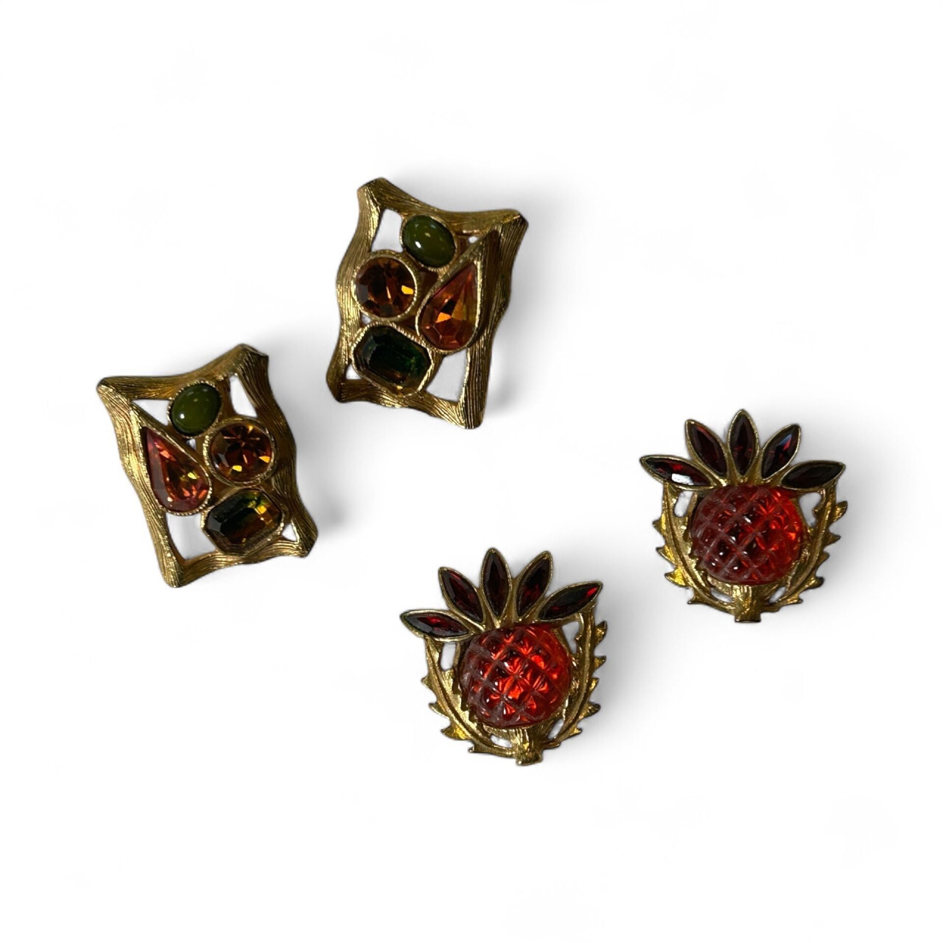 YVES SAINT LAURENT, Pair of ear clips in gilt metal decorated with fancy red stones. HANAE MORI, Pair of earrings in gilt metal decorated with green and orange stones.