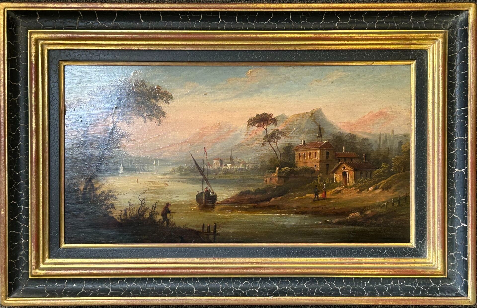 * French school of the 19th century, Animated lakeside landscape, oil on panel. 25 x 44 cm