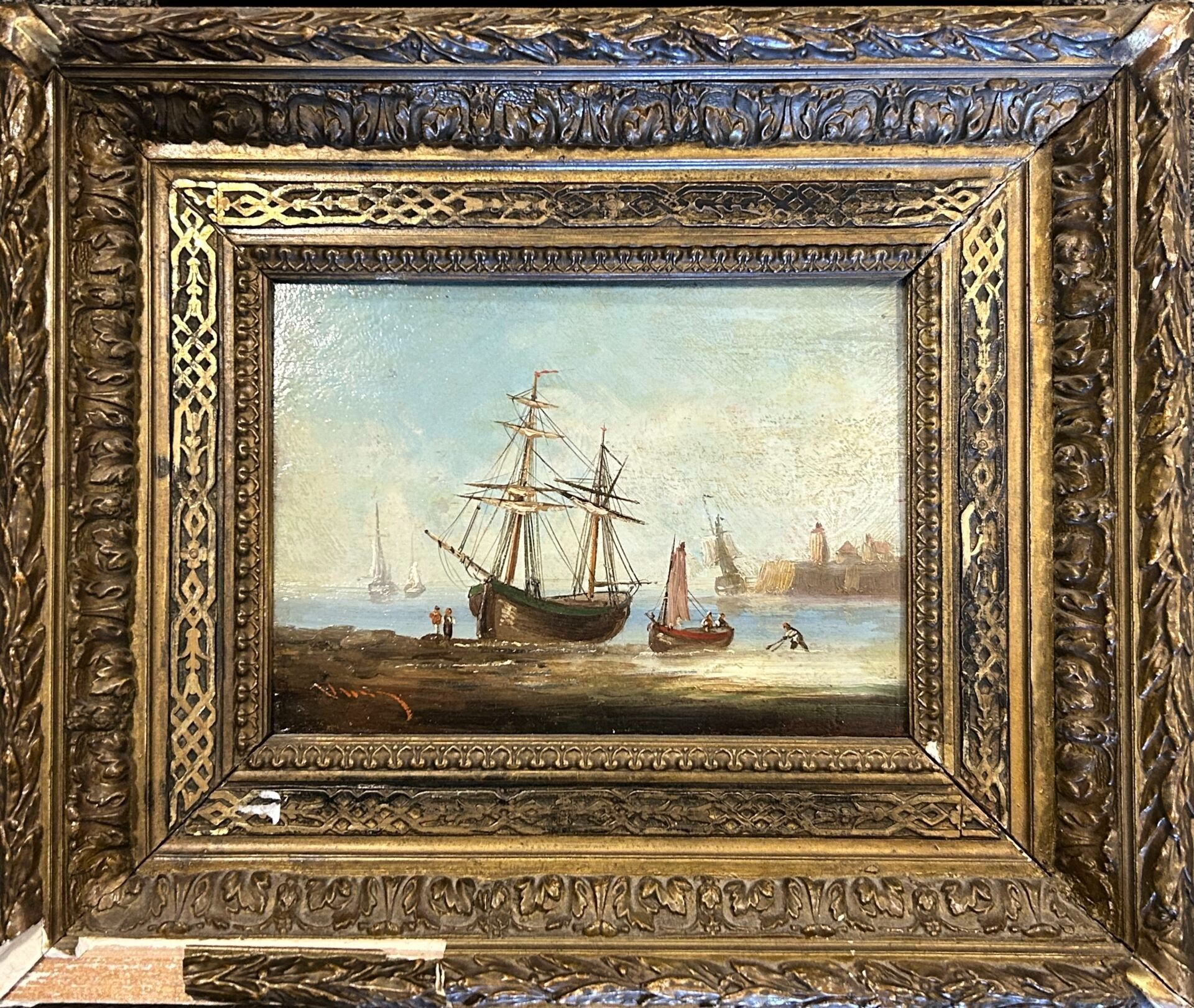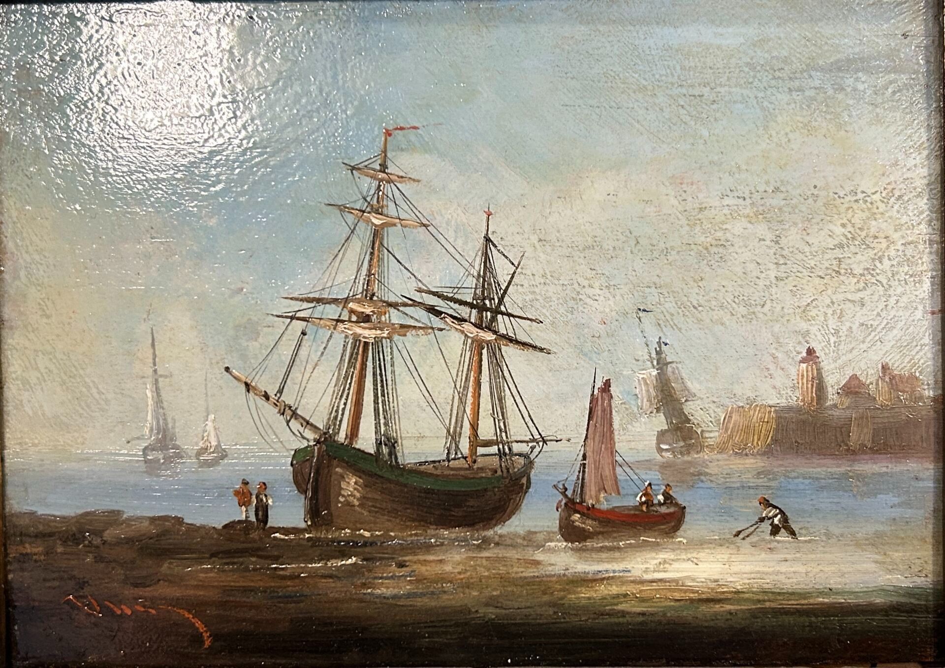 * French school of the XIXth century, Bateaux en bord de mer, oil on panel signed lower left. 15 x 21.5 cm (frame damaged)