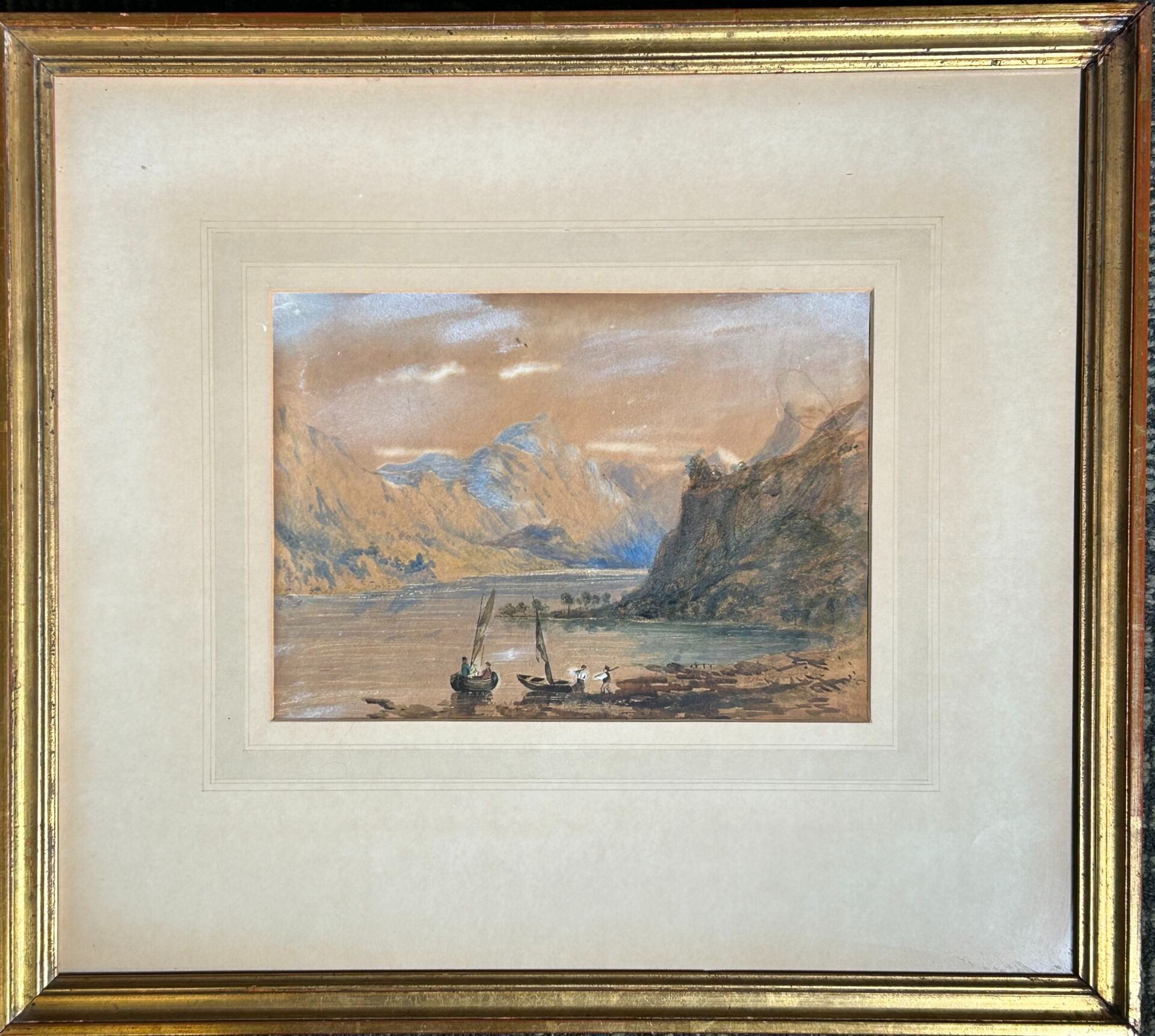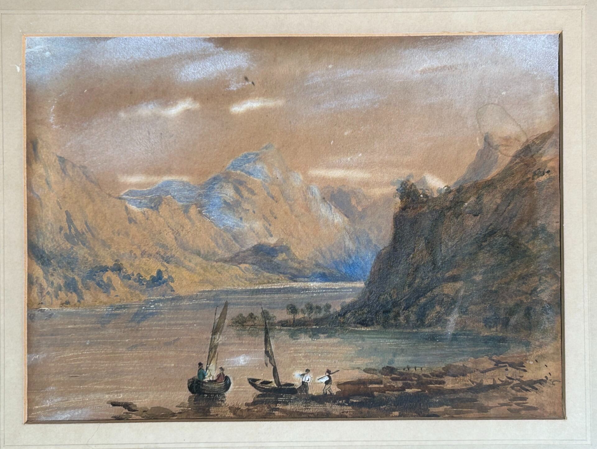 * Italian school of the XIXth century, animated lake landscape on the edge of a mountain, watercolour on paper. 20 x 28 cm on view