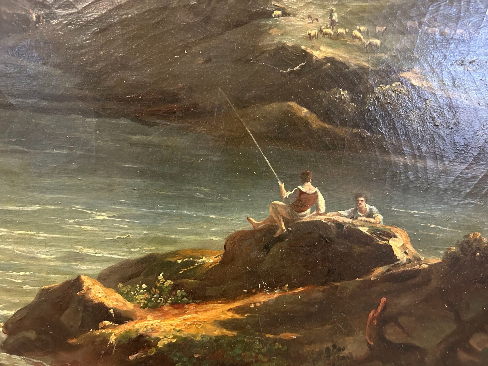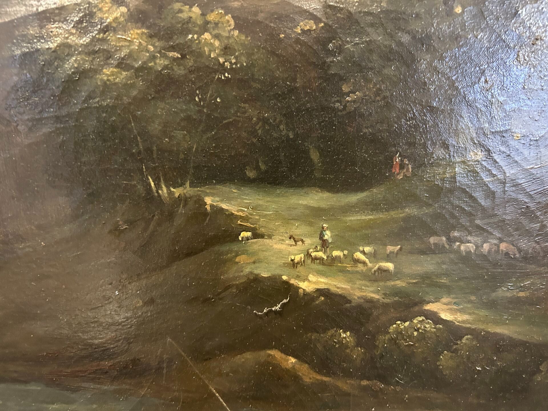 * French school of the 19th century, Paysage animé en bordure de montagne, oil on canvas monogrammed MB and dated 1865 lower right. 84 x 111 cm