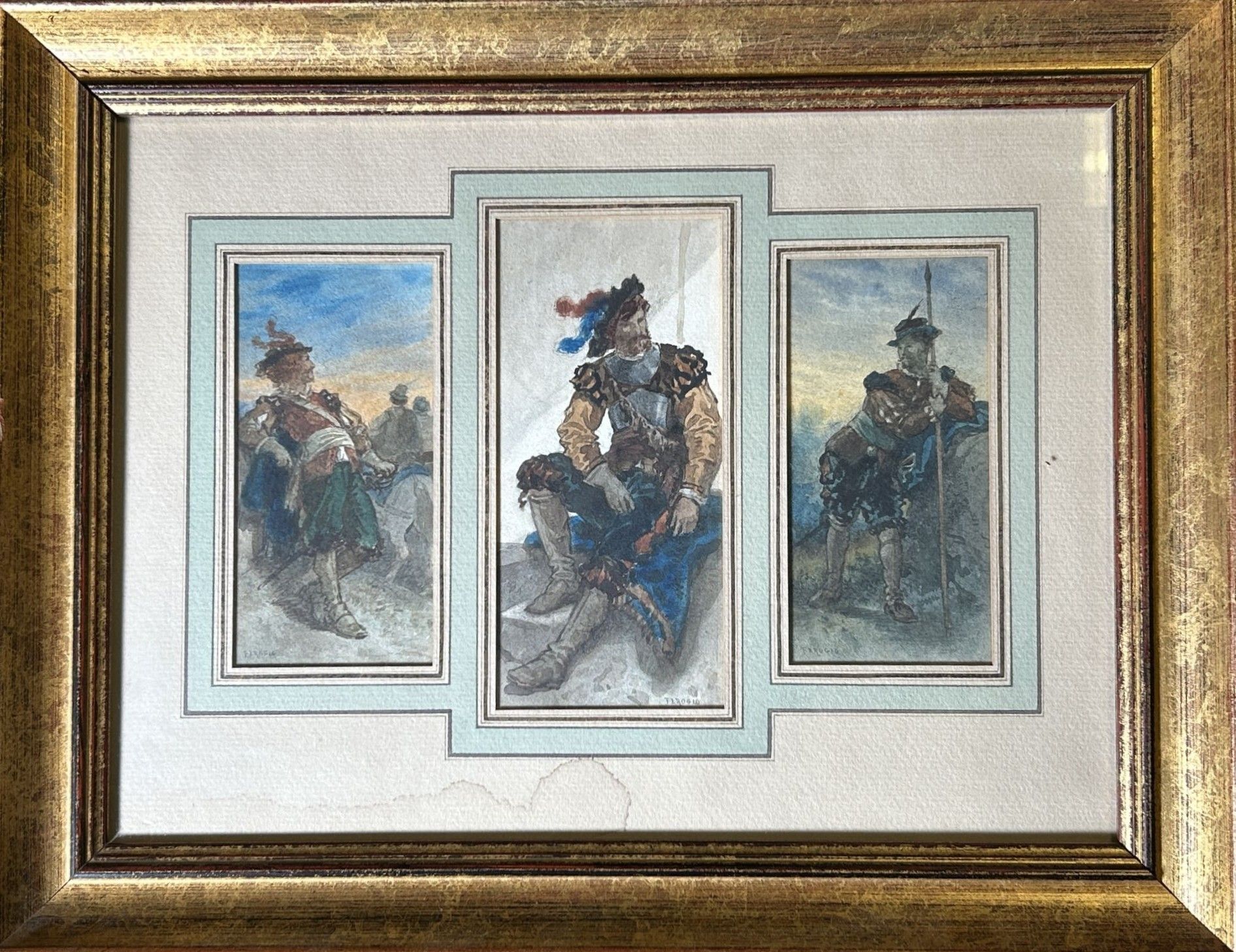 * FEROGIO, Soldiers at rest, three watercolours forming a triptych signed at the bottom. 15.5 x 7 cm and 12.5 x 6.5 cm (wetness on the marie-louise and probably a cut above the shoulder of the central figure).