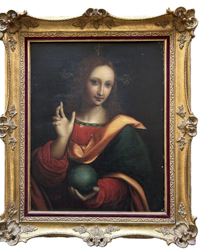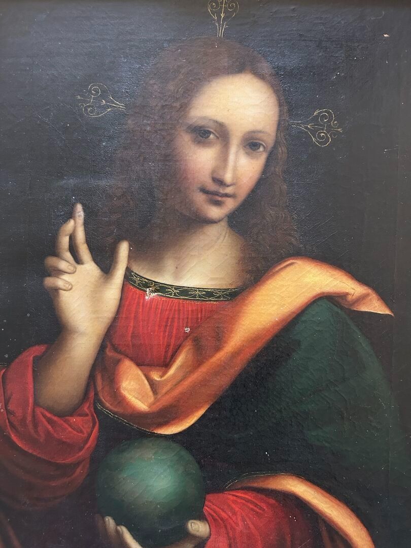 19th century school after Giampetrino, Salvator Mundi, oil on canvas, 50 x 39 cm (accidents and restorations)