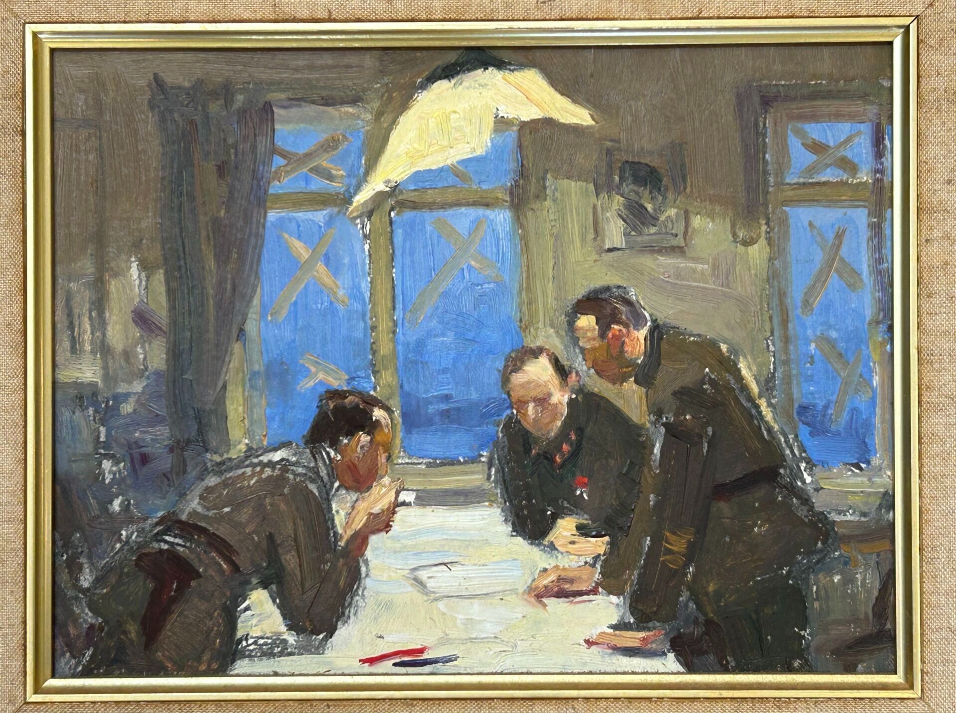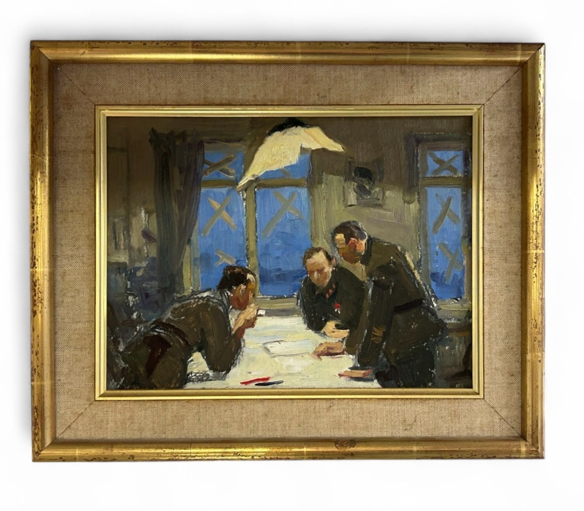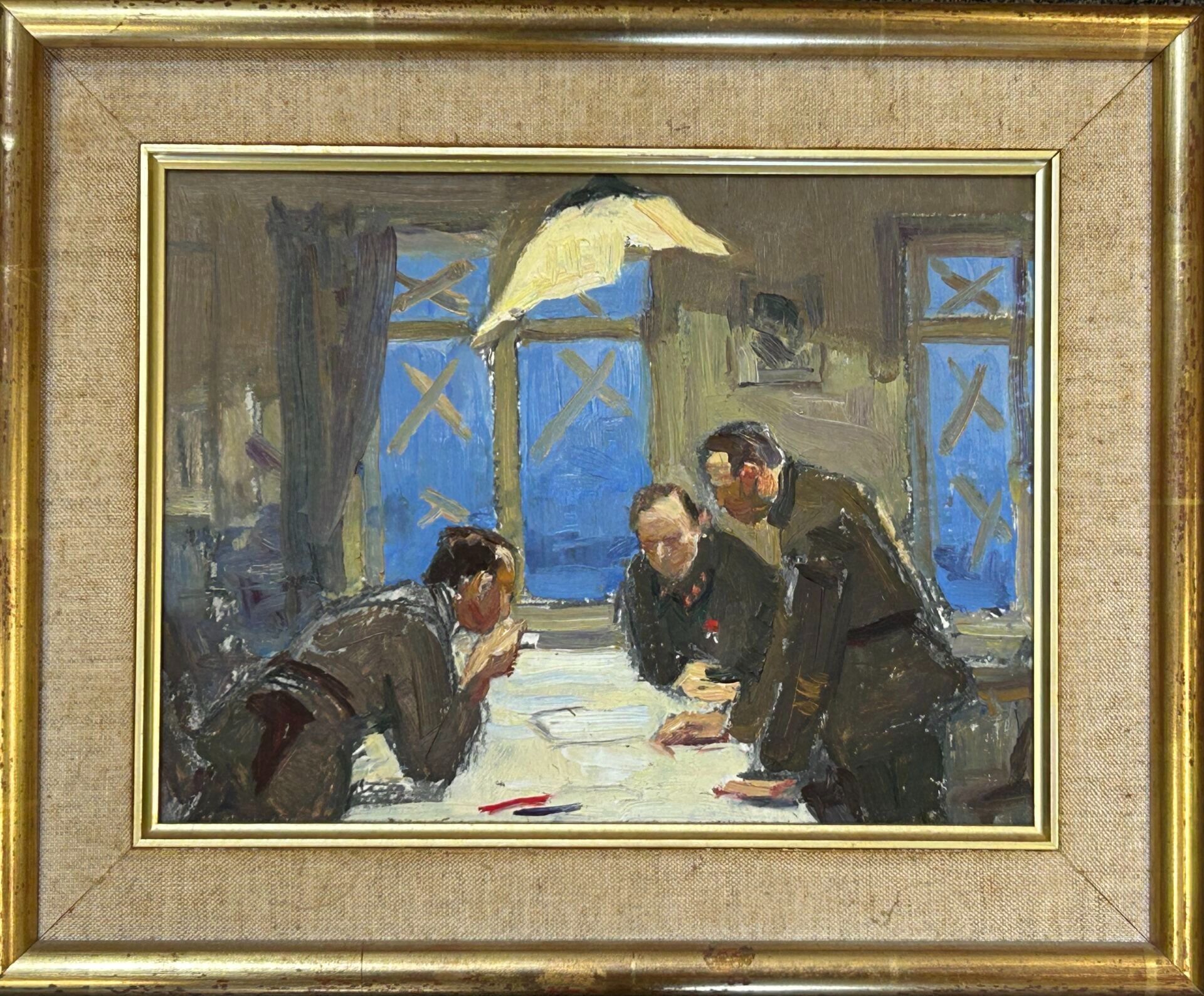 20th century school, Staff meeting, oil on canvas unsigned. 19.5 x 26.5 cm