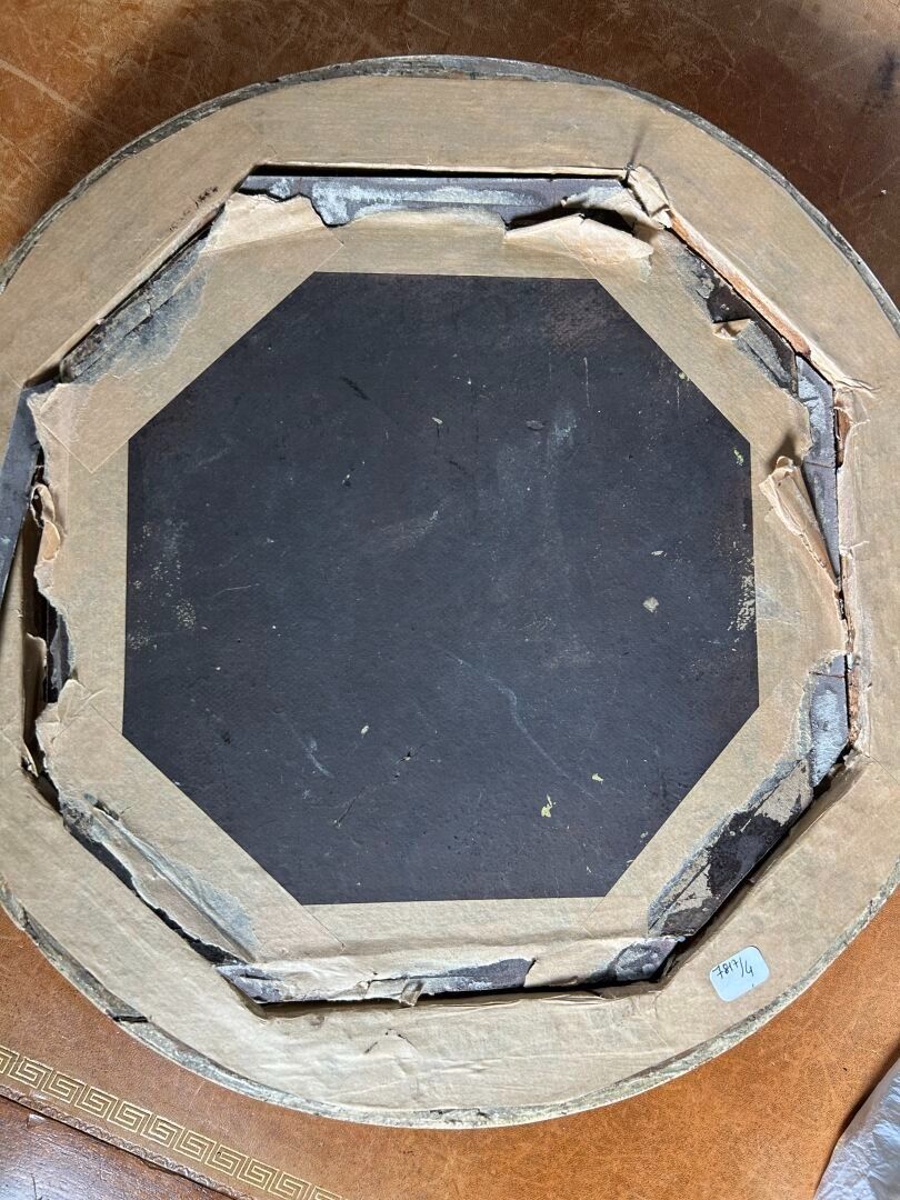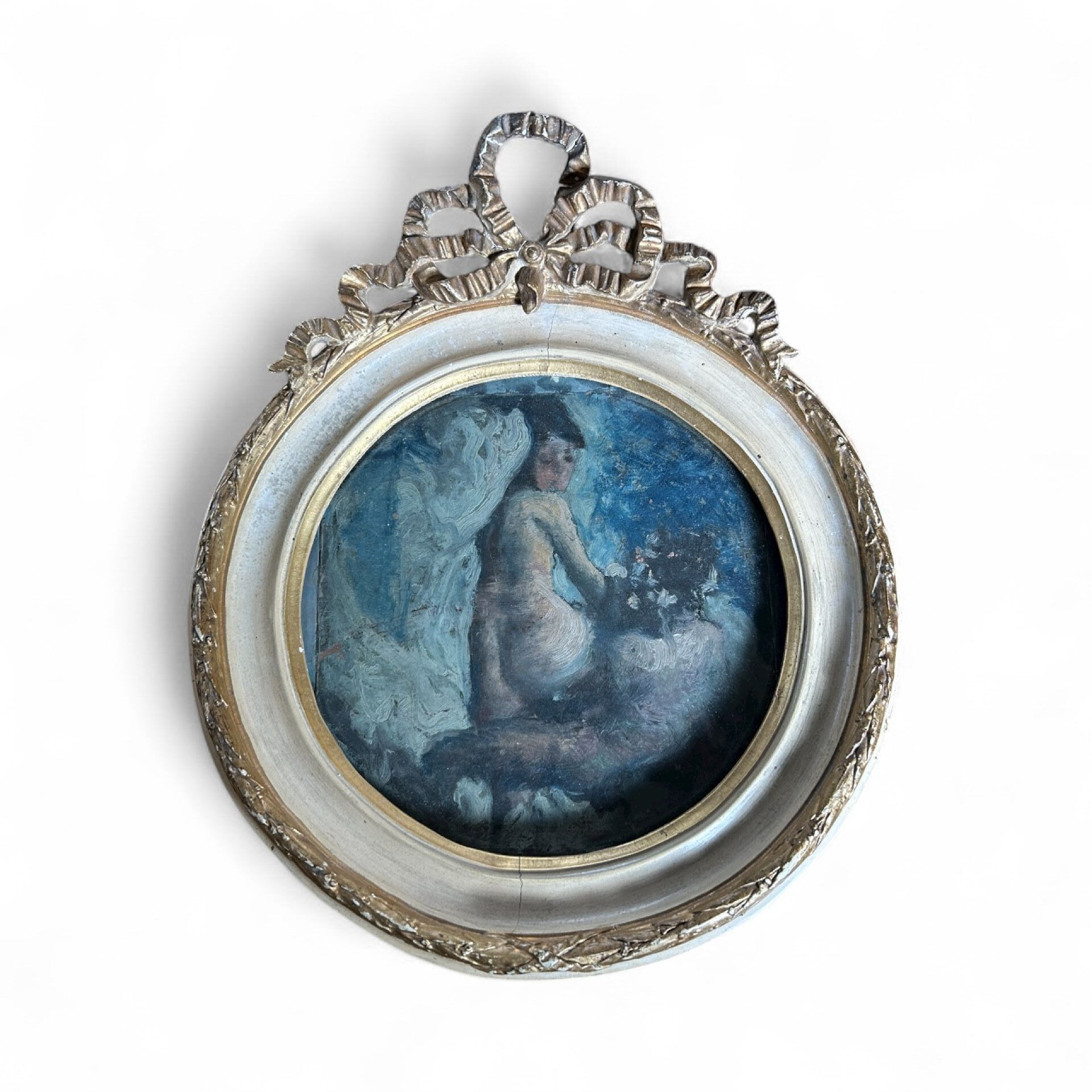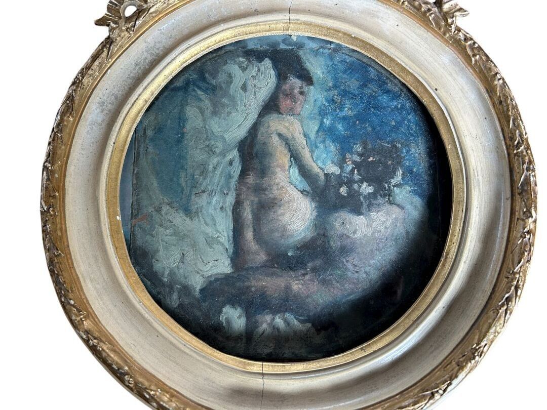 Late 19th or early 20th century French school, "Faune et élegante", fragment of oil on board, probably a study on board. 23.5 x 24 cm (board cut, restored)