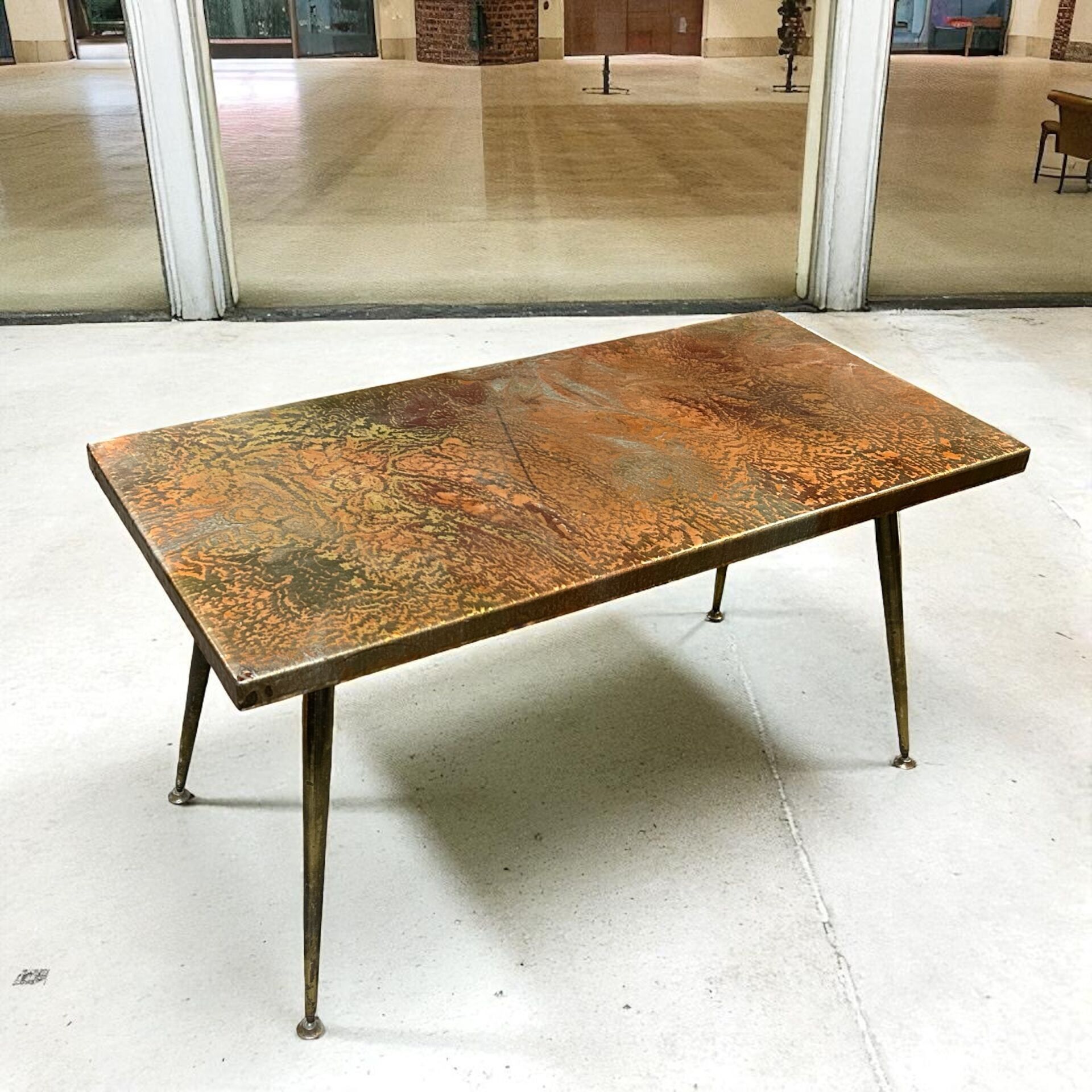 Coffee table with copper-glazed ceramic top and brass base, …