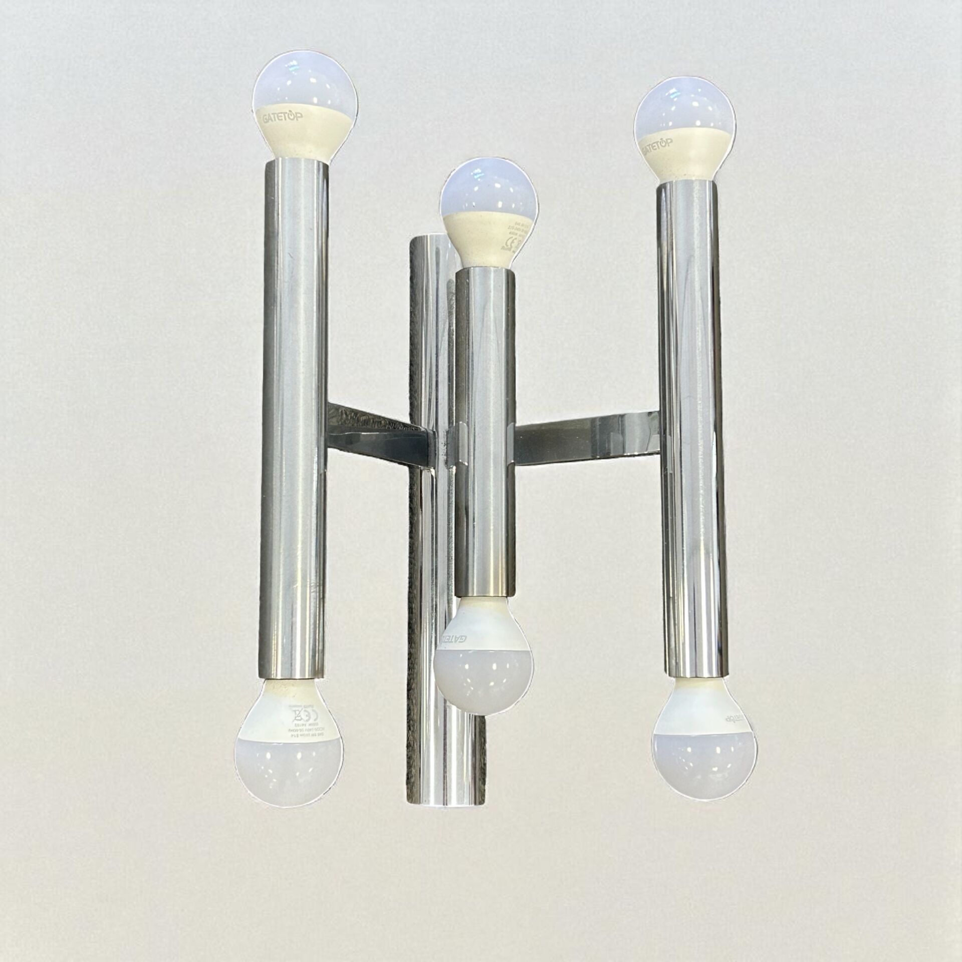 Gaetano SCIOLARI (XXth) Chromed metal chandelier with twenty lights. Height 79 cm Diameter 58 cm, a wall lamp by the same designer with six lights is attached. Height 29 cm
