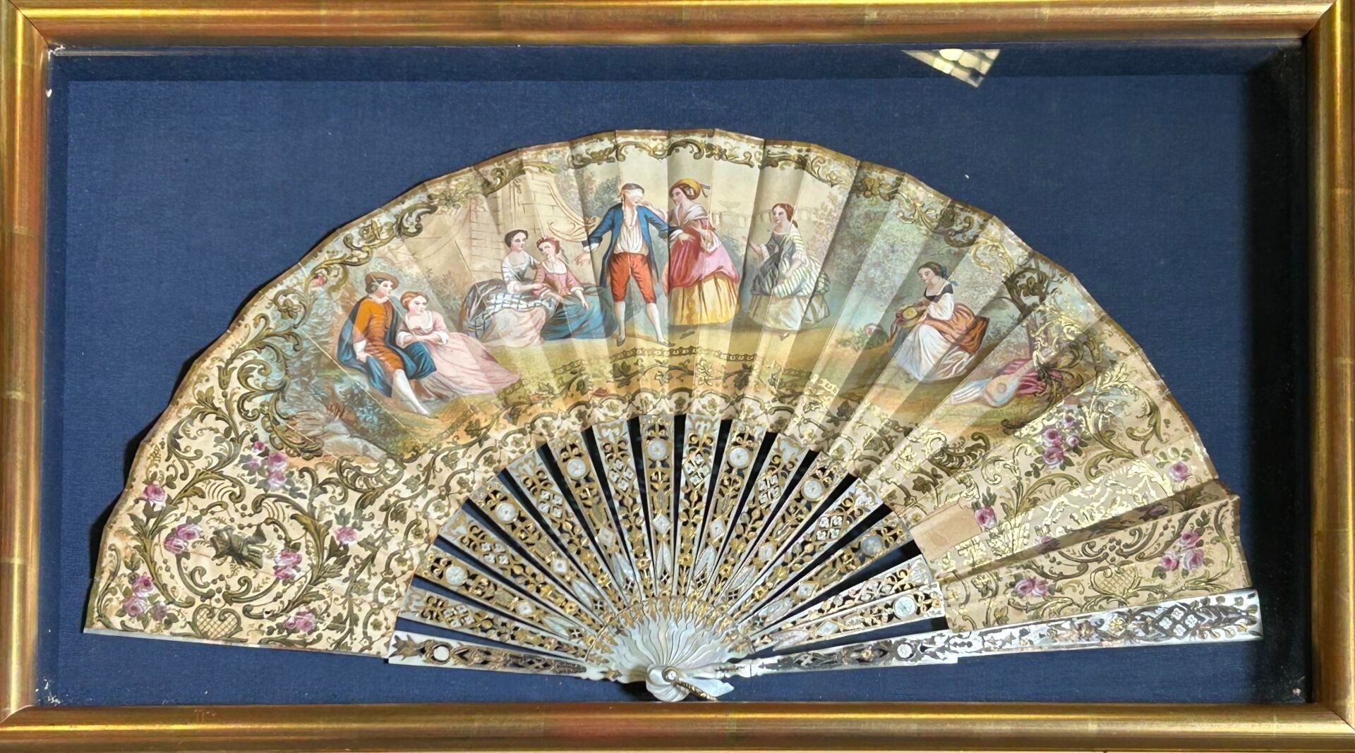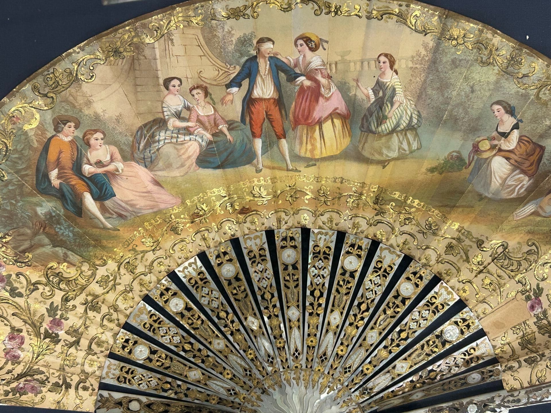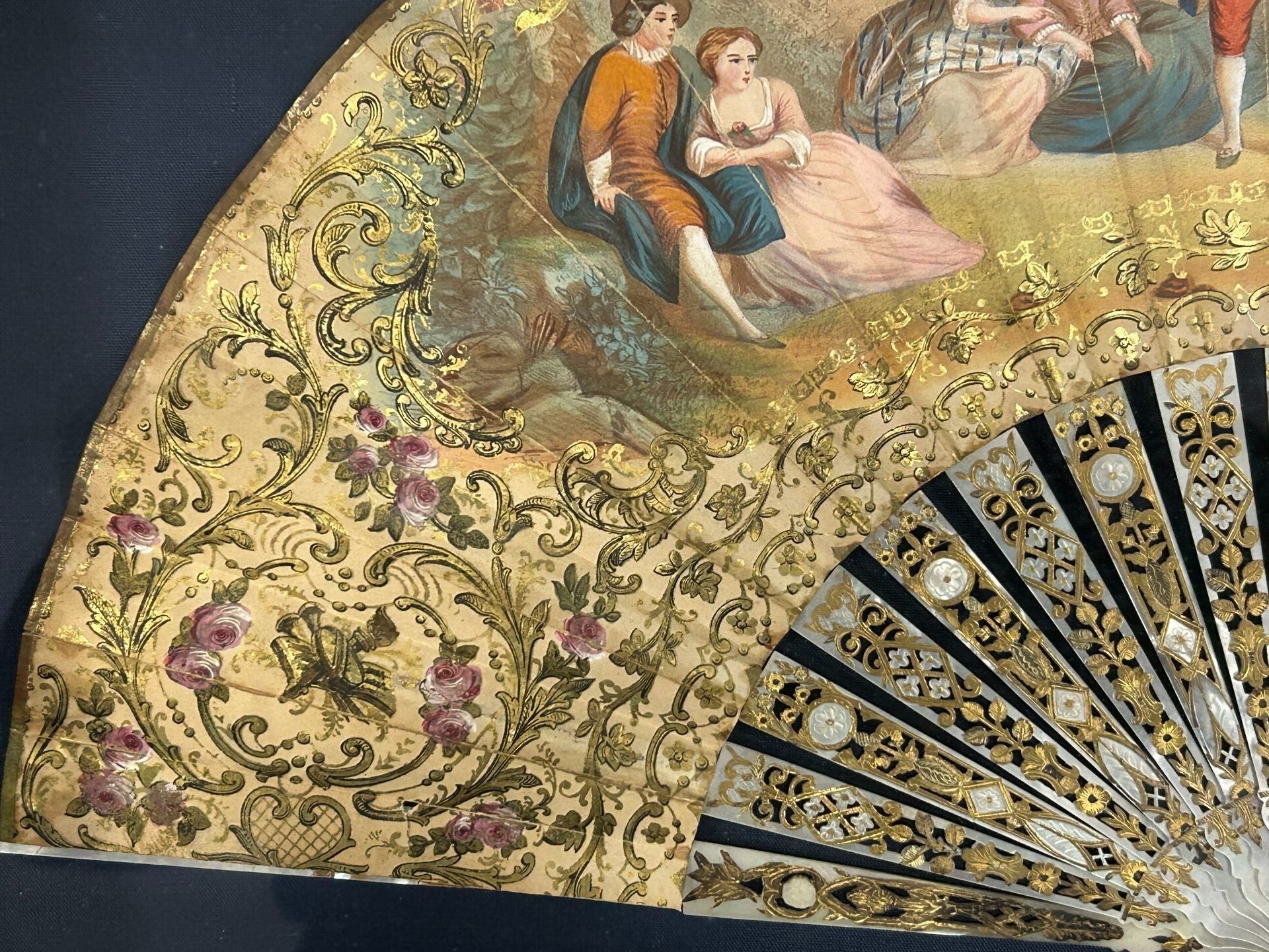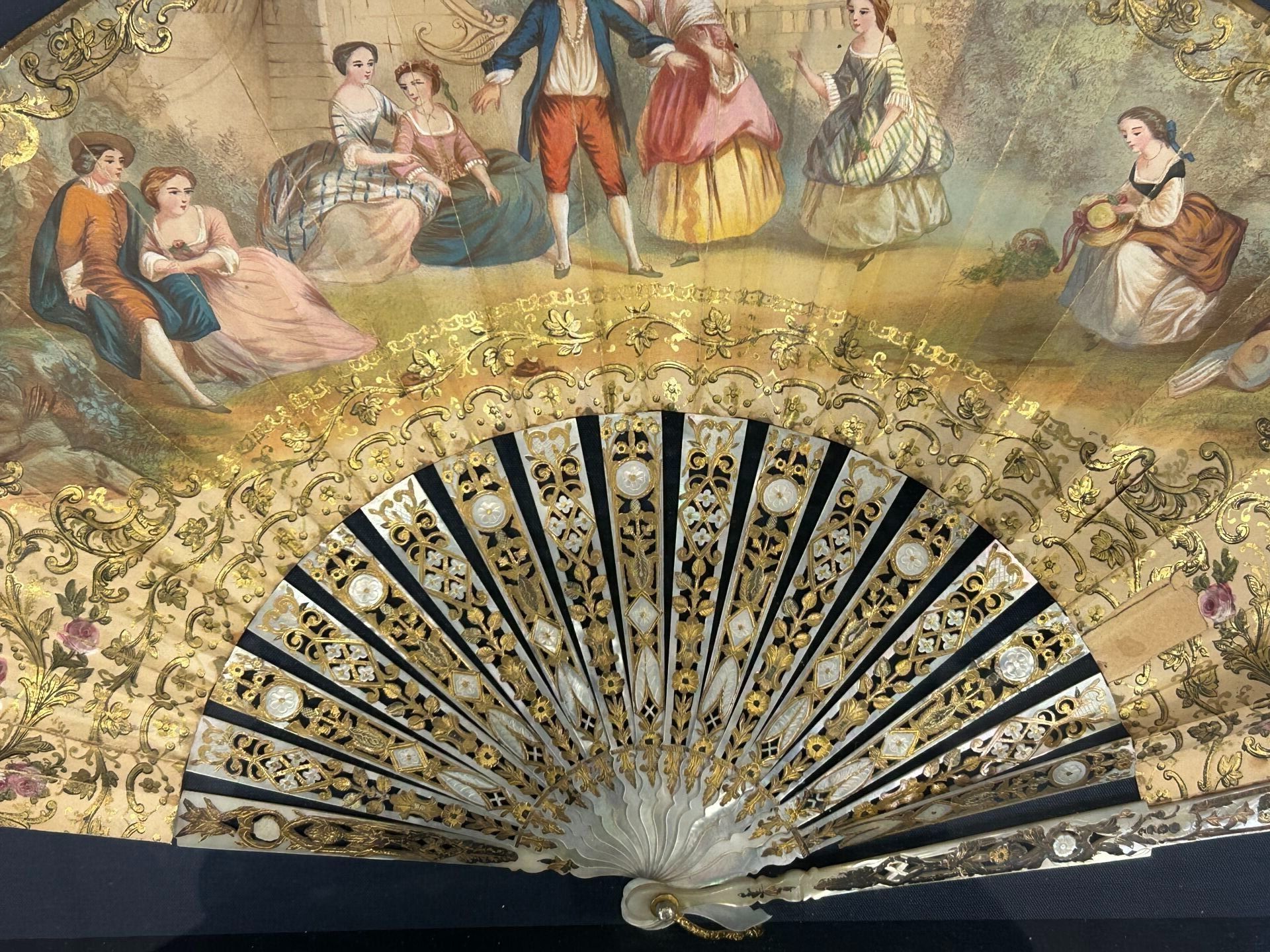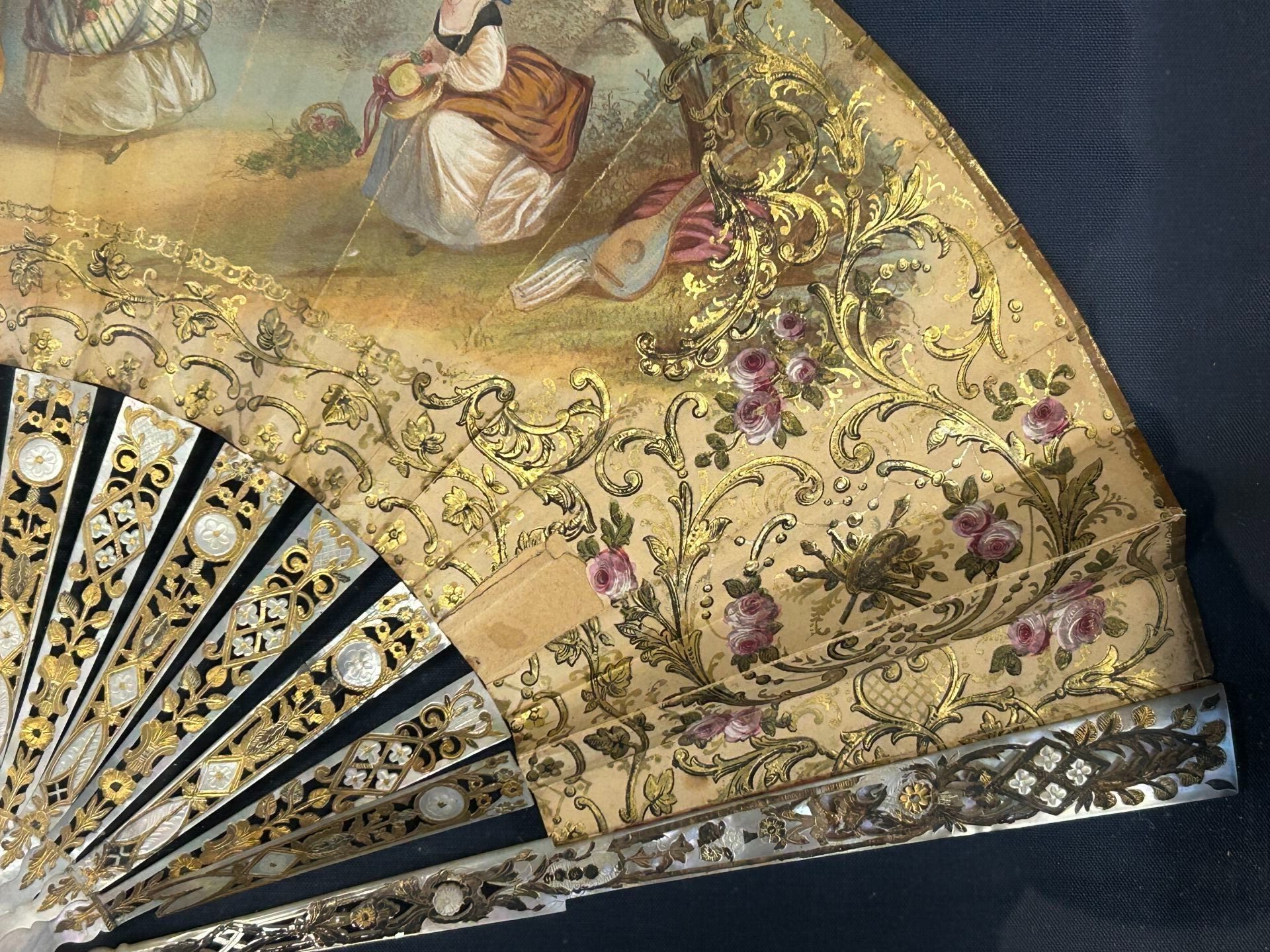 Late 18th century, early 19th century 18-strand fan with mother-of-pearl frame with openwork and gilded decoration, gouache and gilded leaf decorated with a snakes and ladders scene. Length of one strand 26 cm