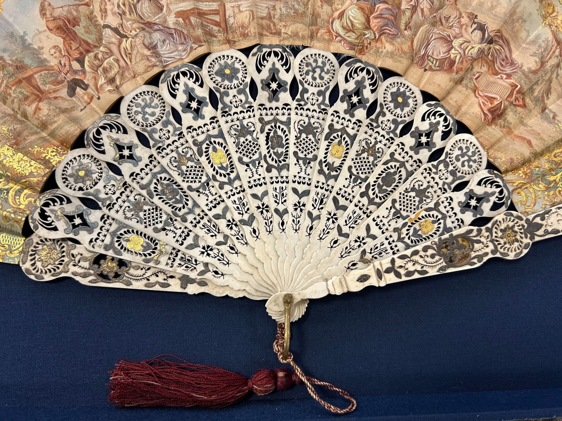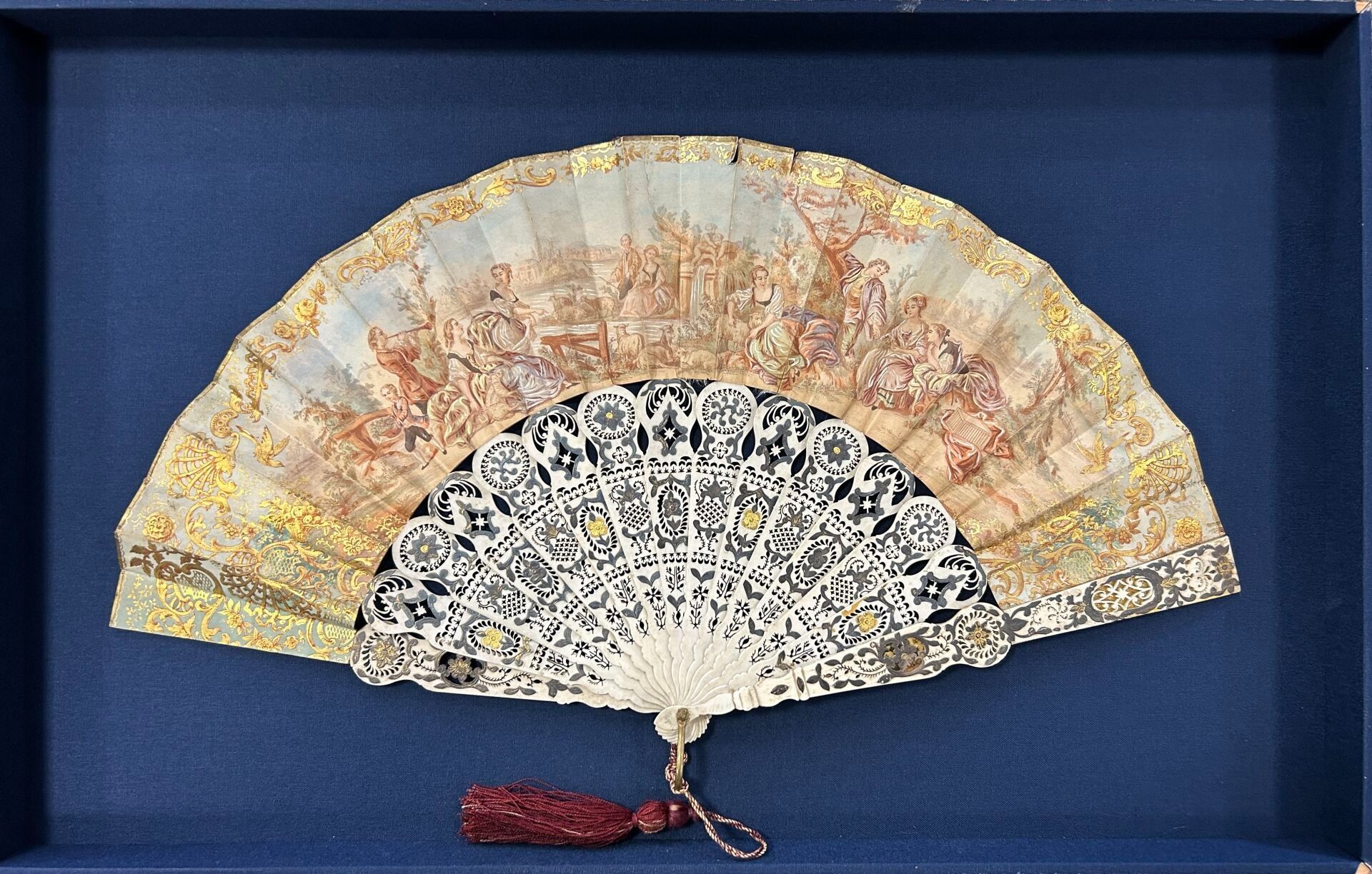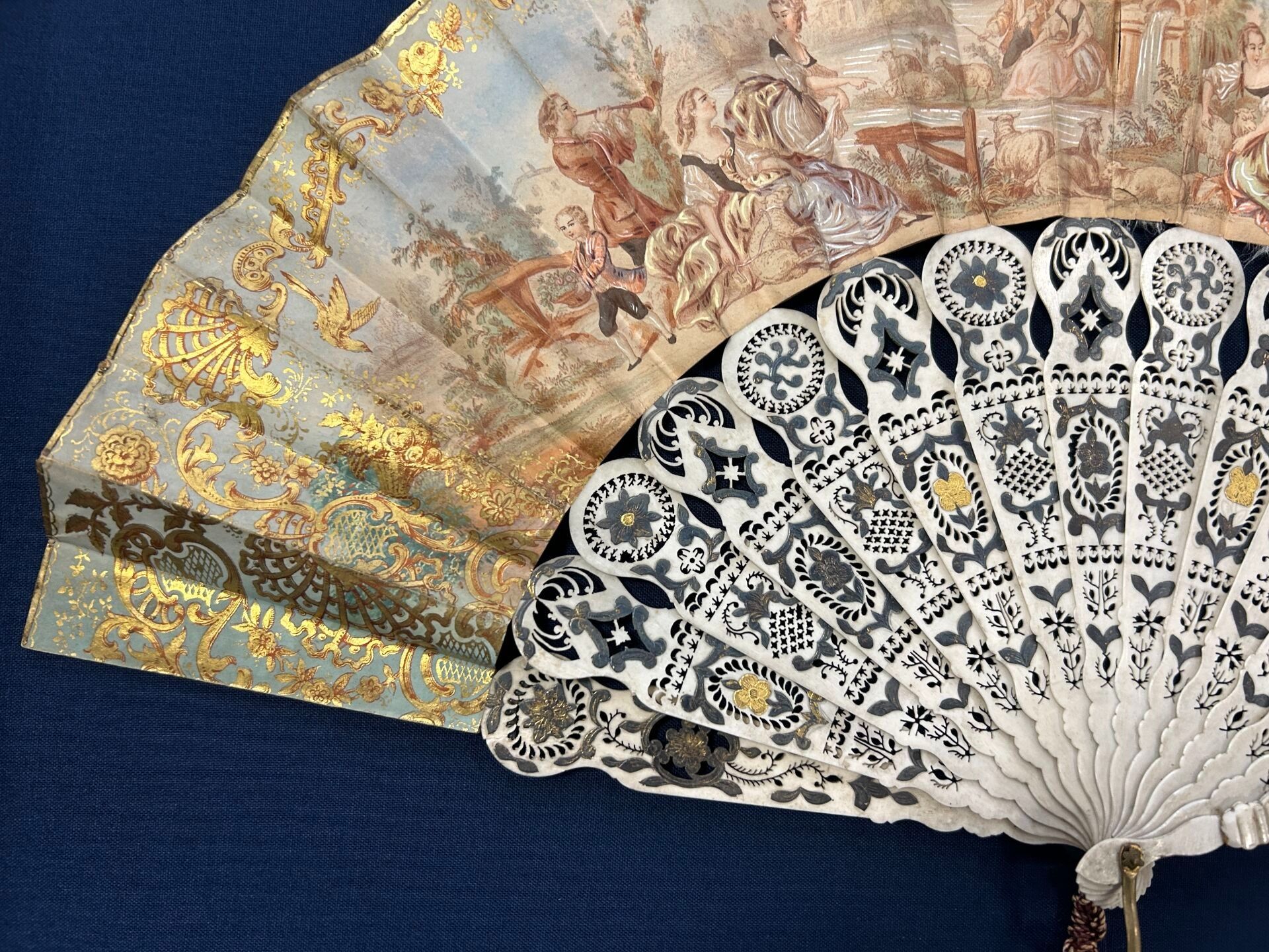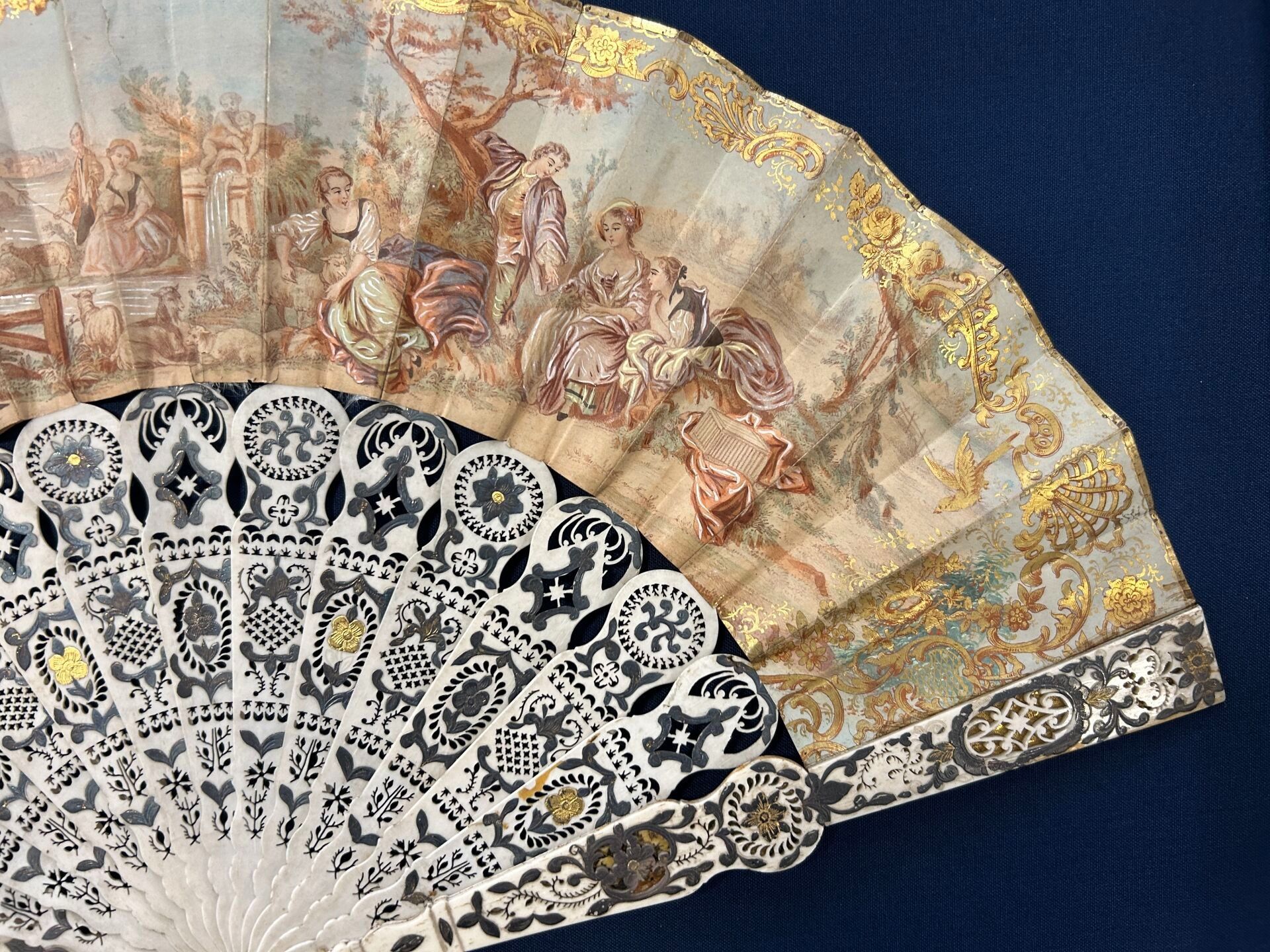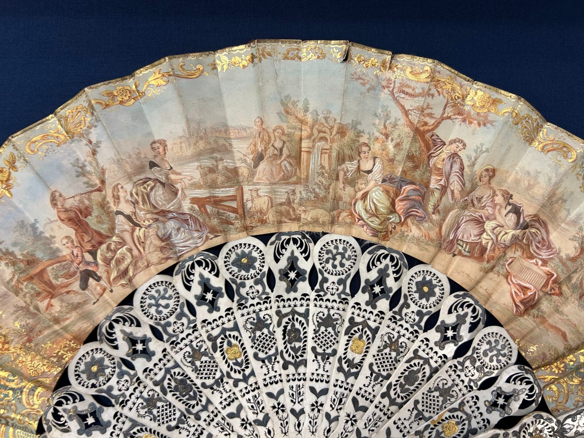 An 18th century 15-strand fan with a carved, painted and gilded frame with stylised floral decoration and a gouache leaf decorated with gallant scenes. Length of one strand 25 cm