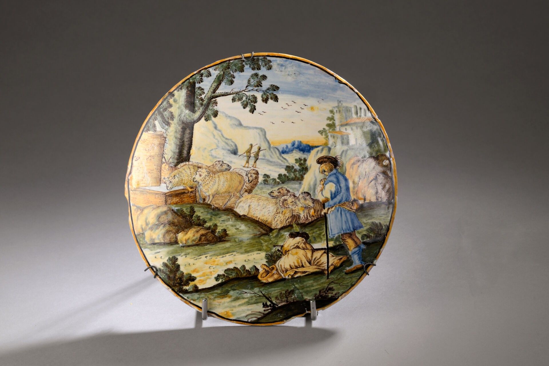CASTELLI, 18th century. Polychrome earthenware tondo decorated with a shepherd and flock of sheep drinking. D. 23 cm (chips around the edge)