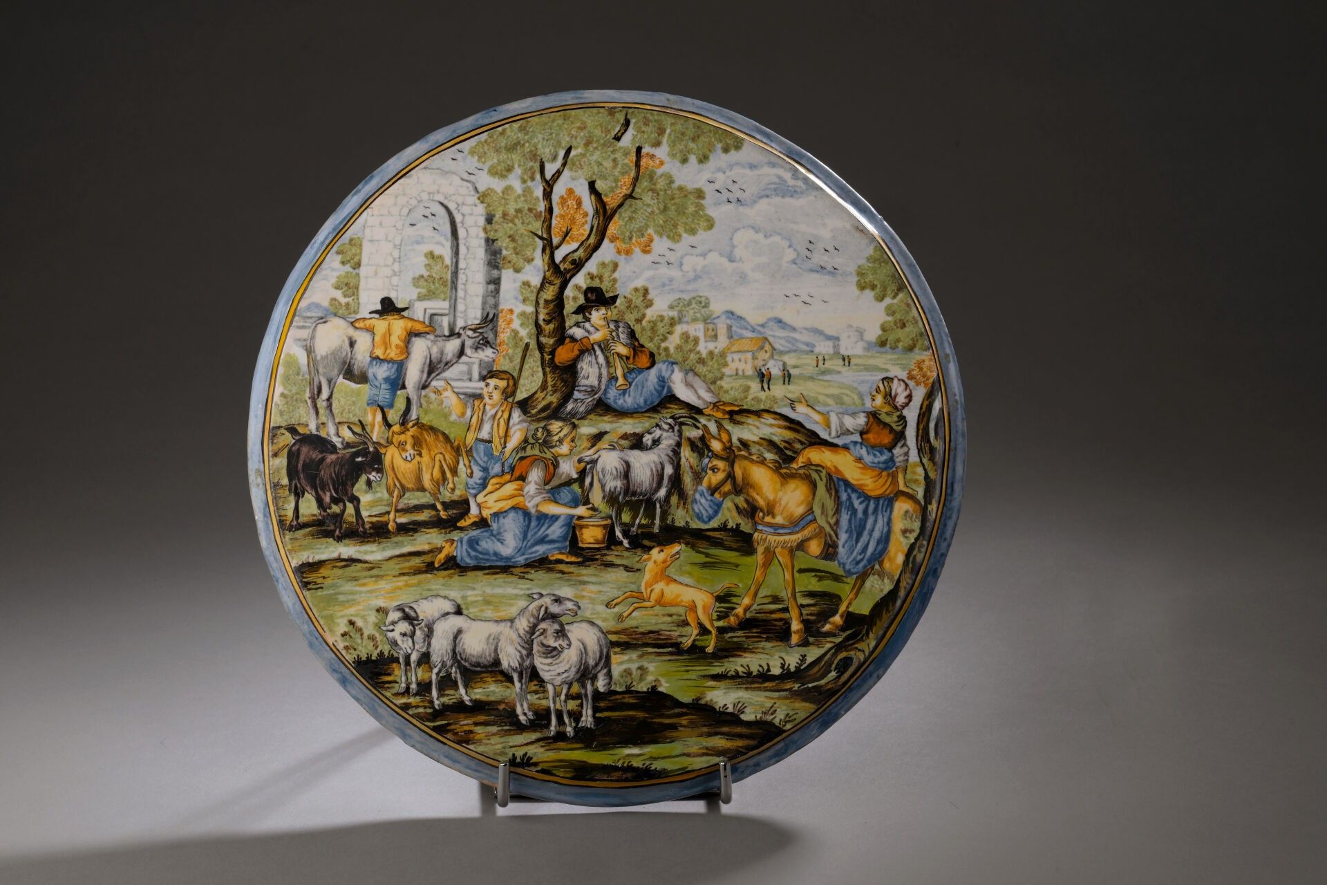 CASTELLI, 19th century. Earthenware tondo decorated with a pastoral scene. D. 30 cm (accidents and restorations)